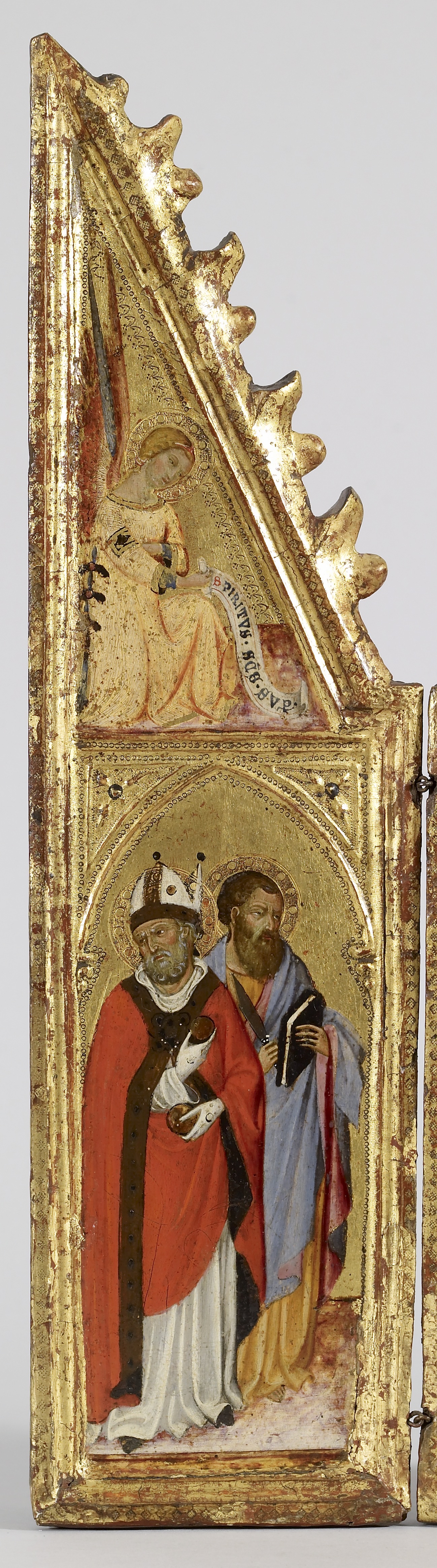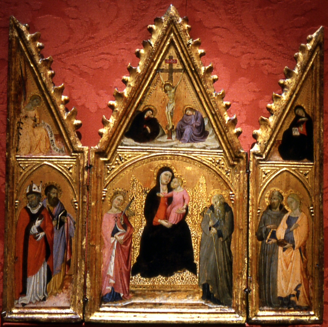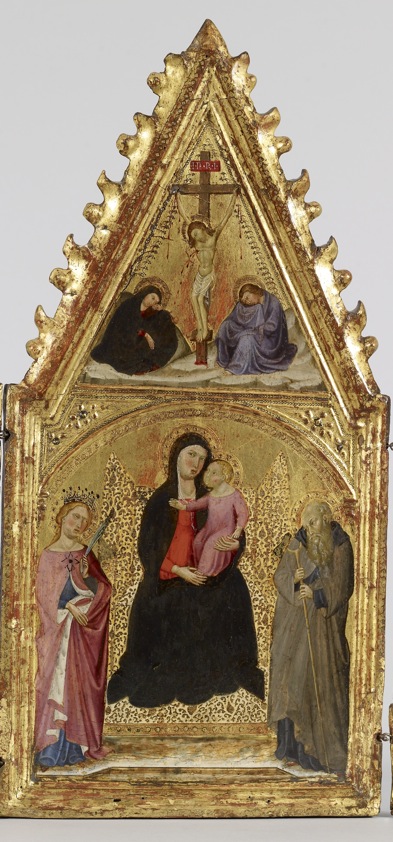 Folding triptychs like this were used for private devotion. The enthroned Madonna and Child are flanked by (left to right) Sts. Nicholas, Bartholomew, Catherine of Alexandria, Anthony Abbot, Francis, and Lucy. This composition uses the metaphor of a queen surrounded by her courtiers to depict the Virgin in her role as the Queen of Heaven. The painter simulated the gold embroidered cloth of the Virgin's throne by scratching away the white paint to reveal the underlying gold leaf, which has been pricked to enhance its reflectivity.