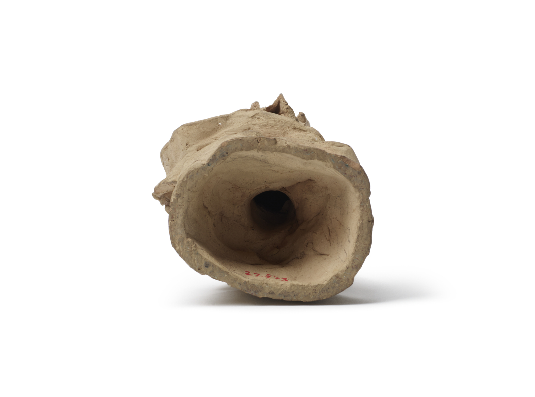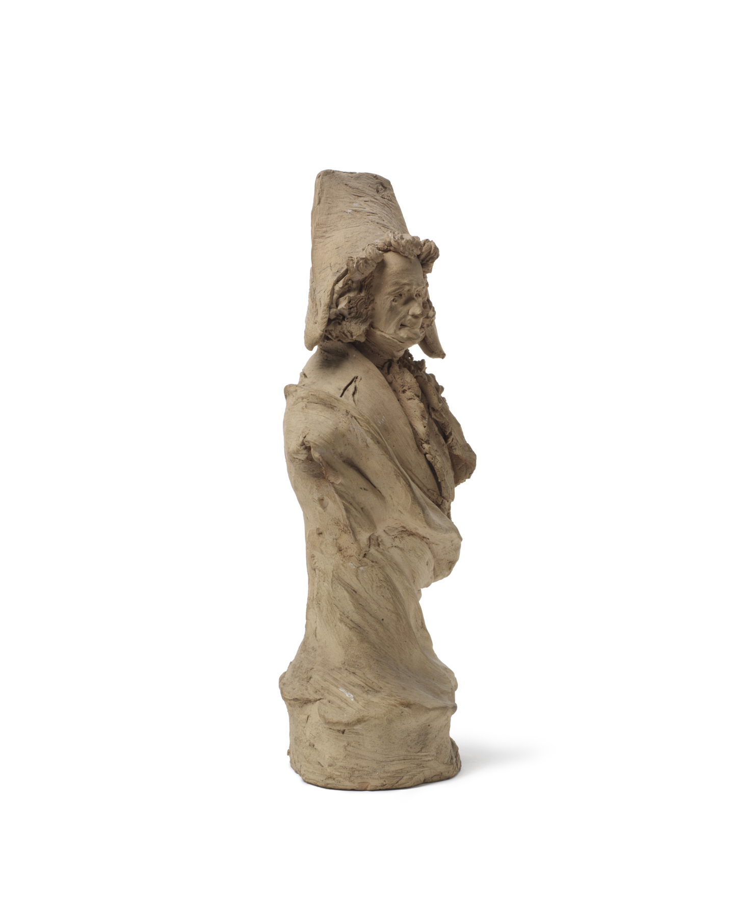 This small terracotta (clay) bust depicts a man in large bicorne (two cornered) or cocked hat, a high collar, and flowing cravat. Beginning around 1730, terracotta became a popular medium for sculptures in France. Collectors appreciated that terracotta pieces could have the quality of a sketch, equivalent to a drawing made by a painter in finalizing his work, where the artist’s process was made visible. This bust embodies these qualities and careful looking reveals tool marks and even fingerprints in the surface.