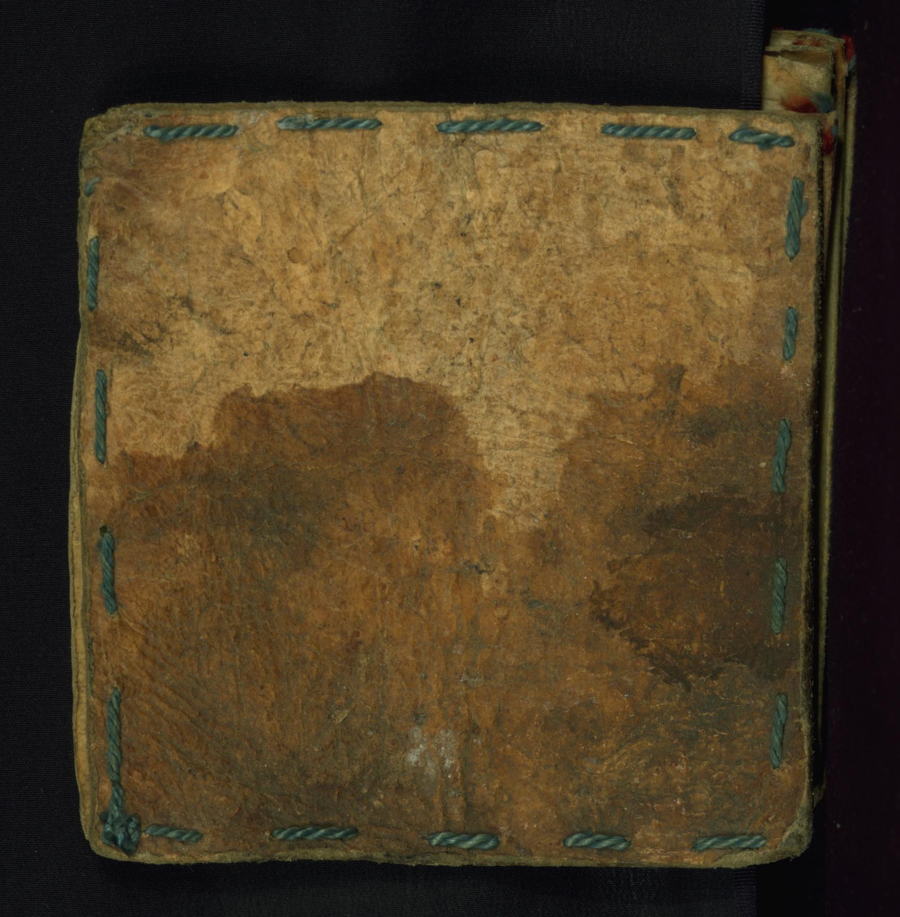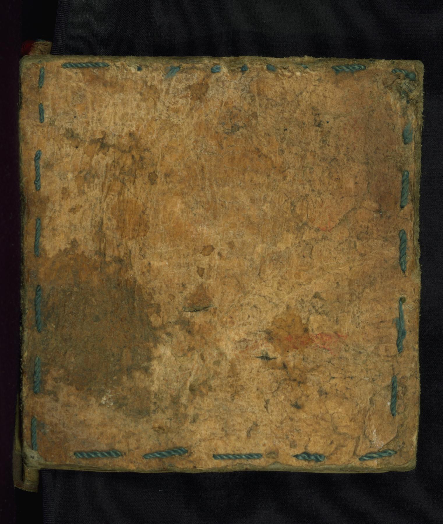 Binding date is unknown, uncertain if original to manuscript. Upper and lower boards made of heavy undecorated hide, stitched to ends of parchment strip.