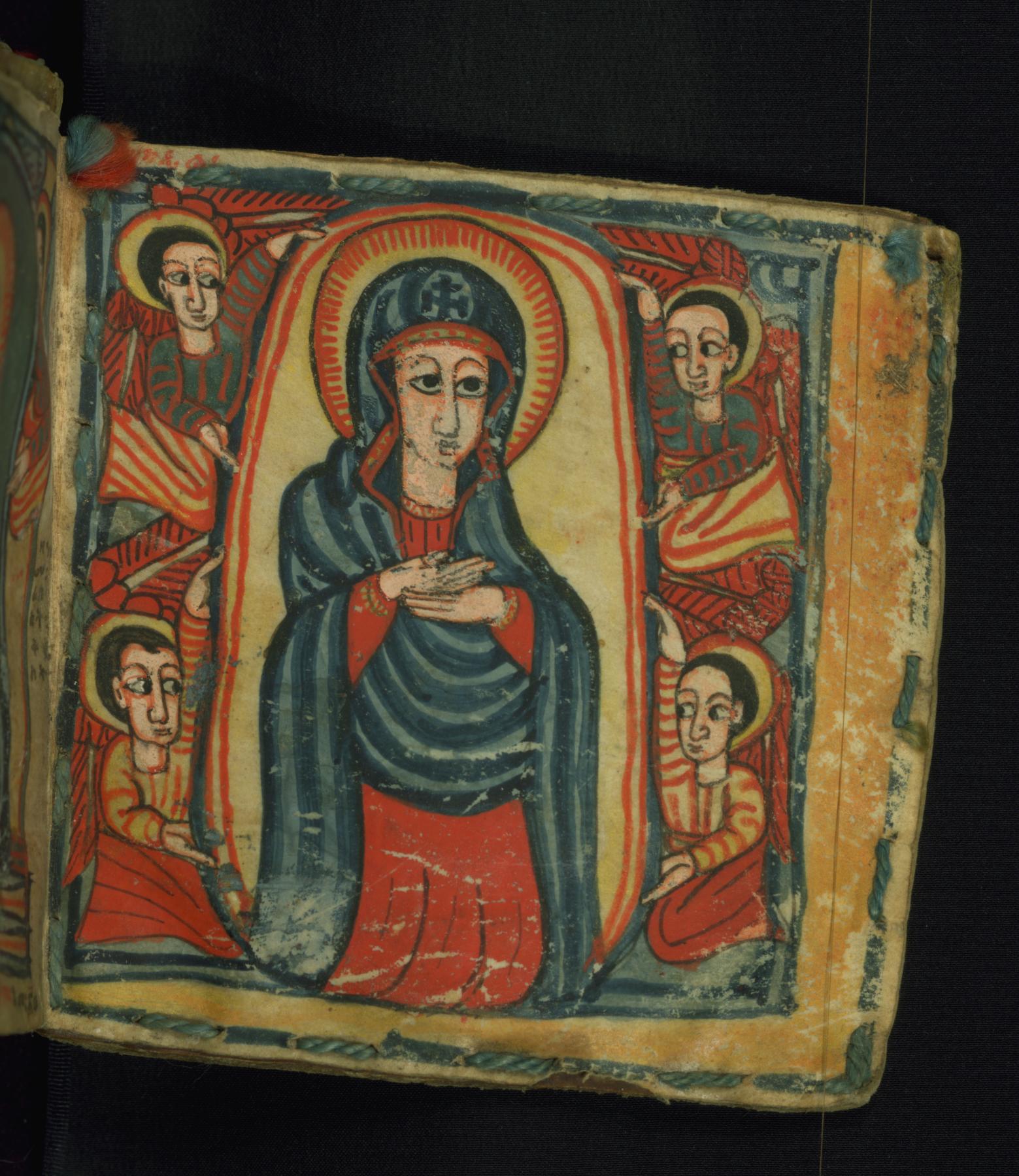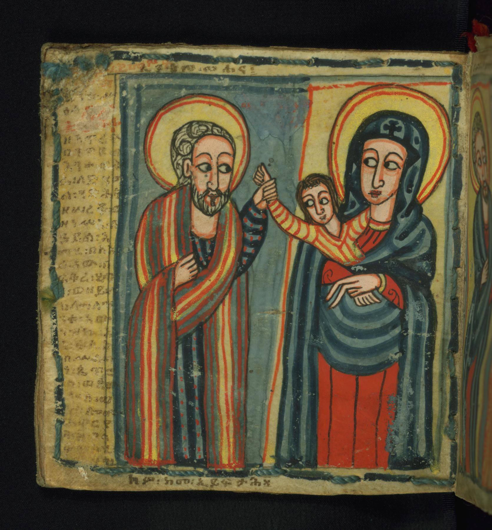 Binding from Gondarine sensul. Upper board inside: Joachim and Anna presenting Mary to the temple; Lower board inside: Mary enthroned.