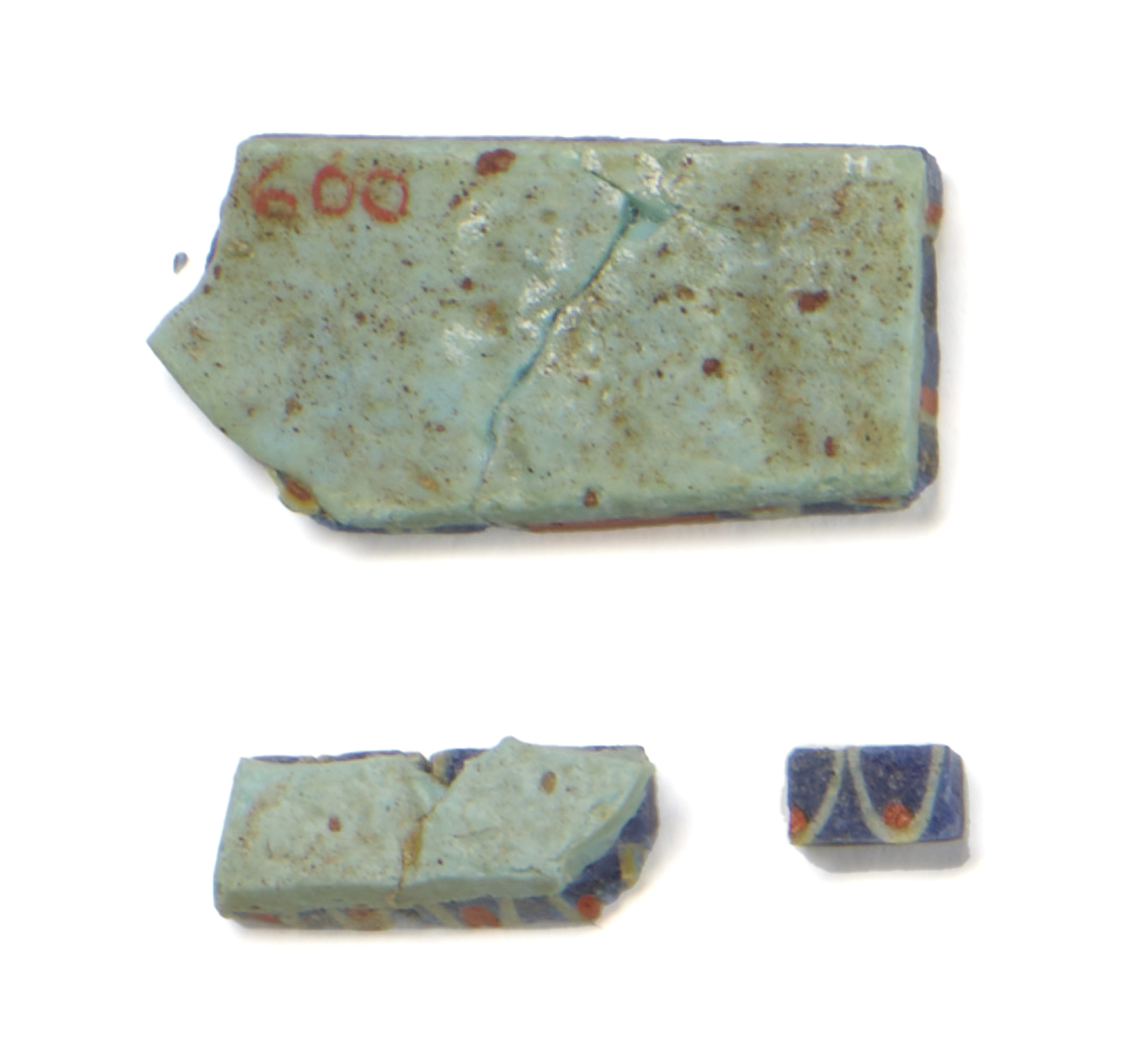 This patterned glass inlay fragment may have belonged to a representation of a garment.