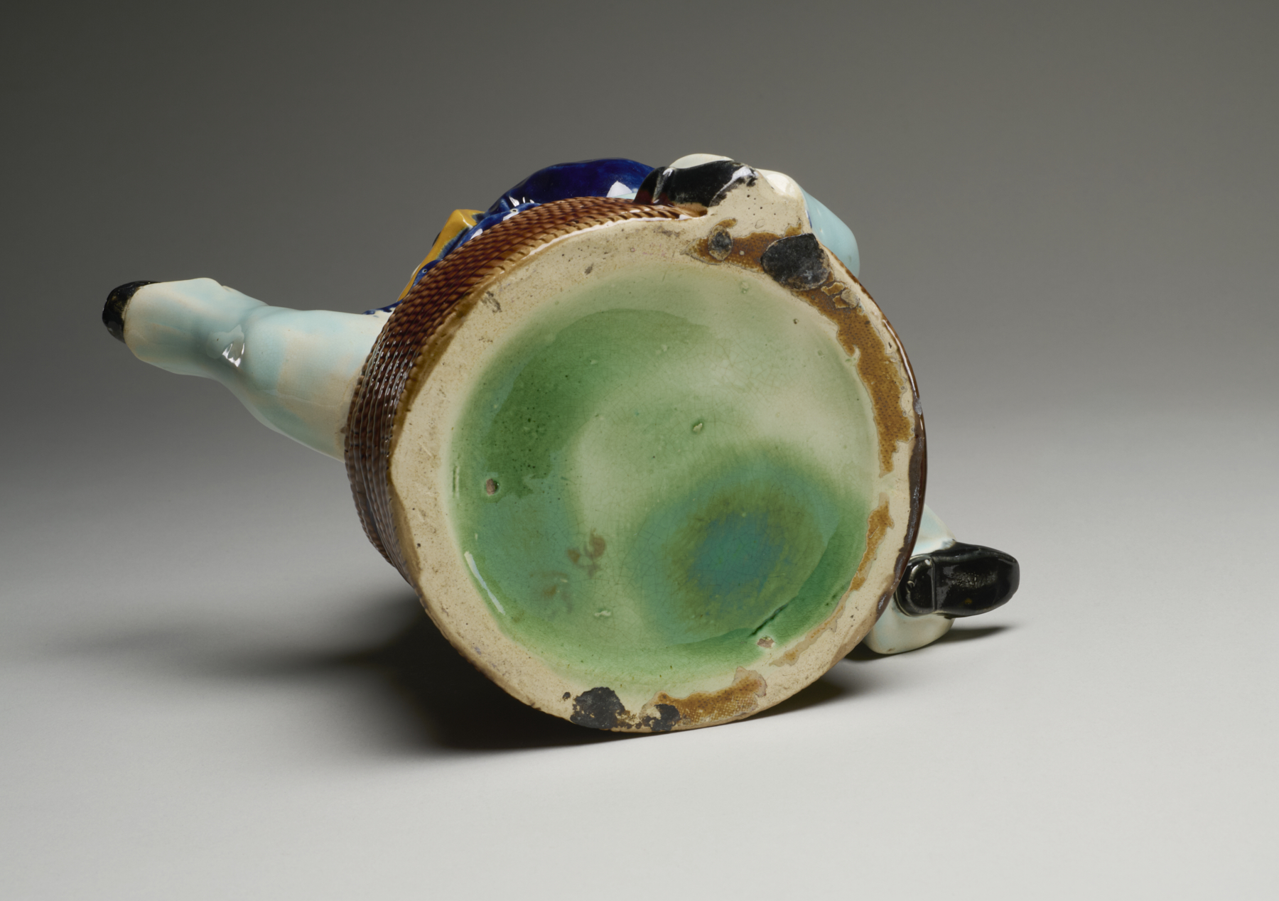 The Isle of Man teapots were likely manufactured by more than one English pottery, although the glazing on this example is characteristic of the production of the Joseph Holdcroft factory. Joseph Holdcroft (ca. 1832–1904) was trained and employed at Minton & Co. before establishing his own, eponymous firm in the early 1860s. His company began majolica production in about 1870 in the Staffordshire town of Longton. Holdcroft’s business strategy was anchored in manufacturing large quantities of mid-range majolica, supplemented by higher-quality pieces–like this teapot–that garnered positive press reviews and upheld the company’s reputation. Although the firm was capable of manufacturing premium majolica in novel shapes, it was sometimes more of an imitator than an innovator, and was known to copy designs of rival potteries. The company continued to make majolica into the 1890s.