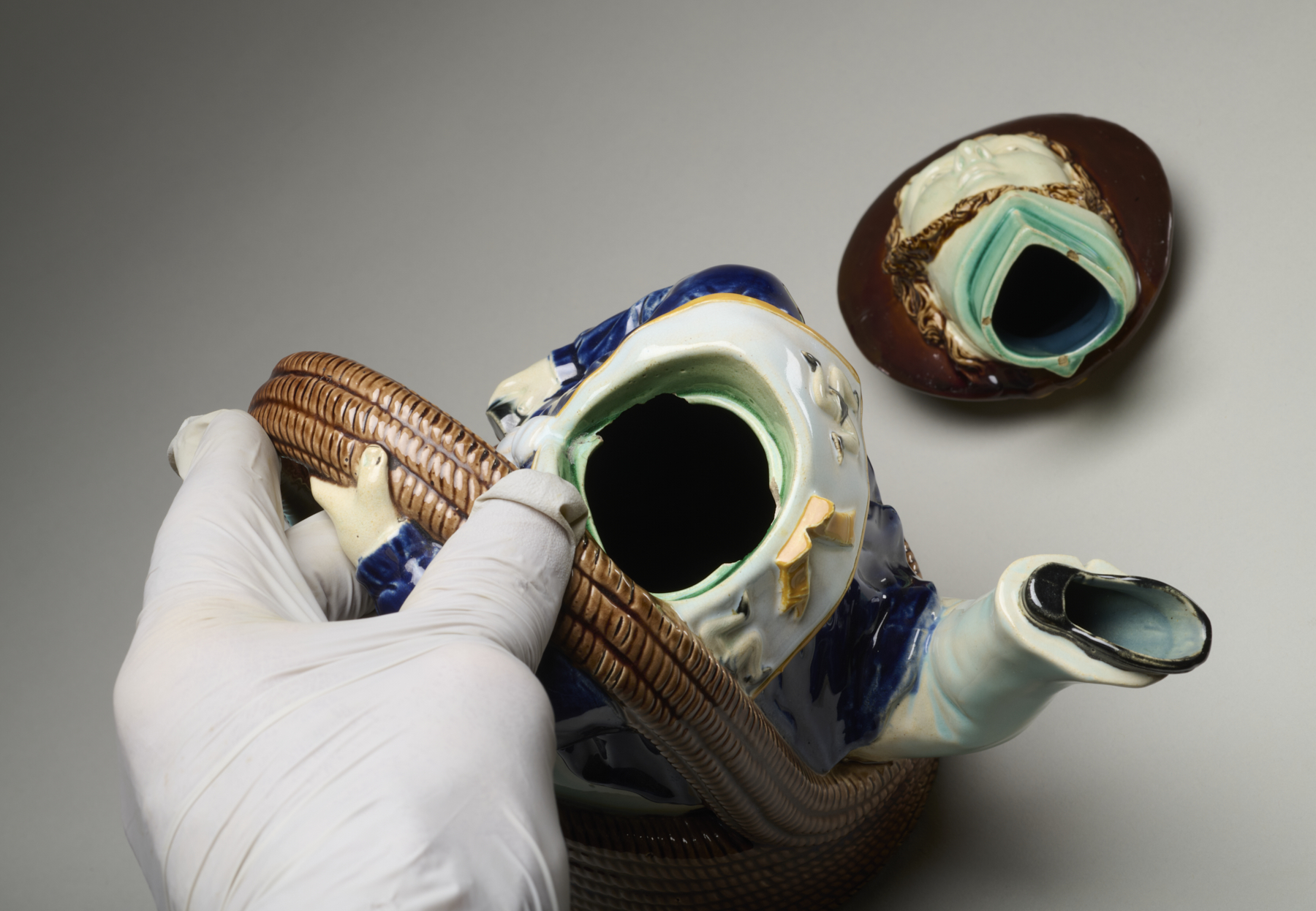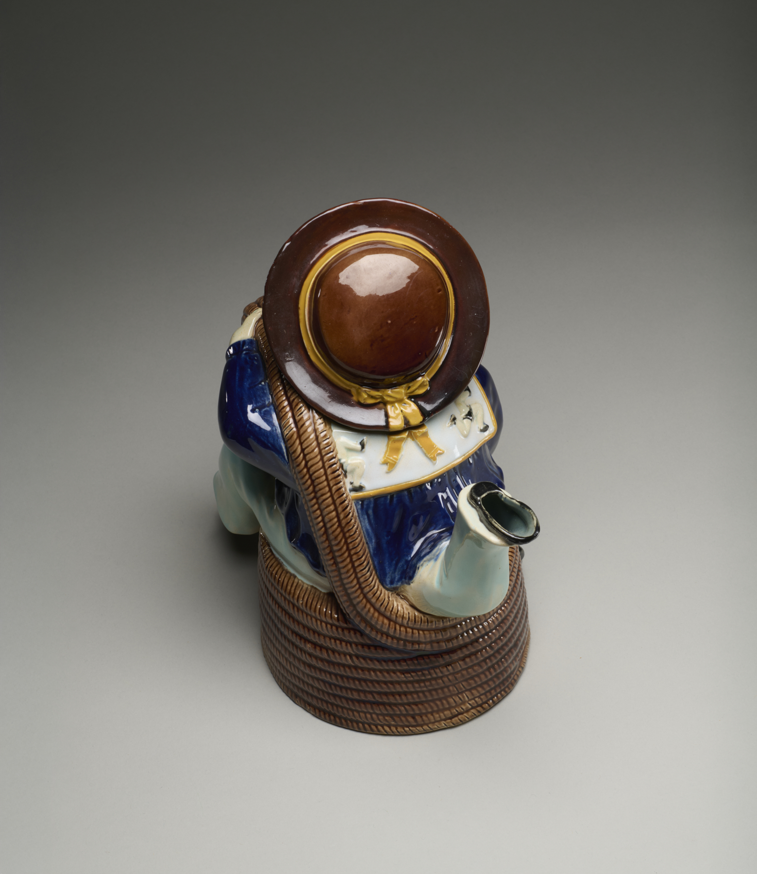 Nineteenth-century manufacturers capitalized upon the increasing time for leisure among the middle classes and the corresponding expanded tourist market, to create souvenir products—including a few in majolica—that commemorated local events, historical buildings, and notable landmarks. This novelty teapot model was sold as a souvenir of the Isle of Man, the British island territory located in the Irish Sea between Great Britain and Ireland. The sailor form evokes the importance of seafaring to the Isle’s economy and culture. The three legs of the sailor echo the three-legged motif, or triskelion (triskeles), that appears on the sailor’s kerchief. This has been a symbol connected to the Isle of Man since the 12th century and appears on the island’s coat of arms which originated in the mid-1200s. These teapots were commissioned and sold by William Broughton, who operated “Broughton China Rooms” on Duke Street in Douglas, the capital and largest city on the Isle of Man. Broughton’s business seems to have been in operation from at least the early 1870s until around 1900.