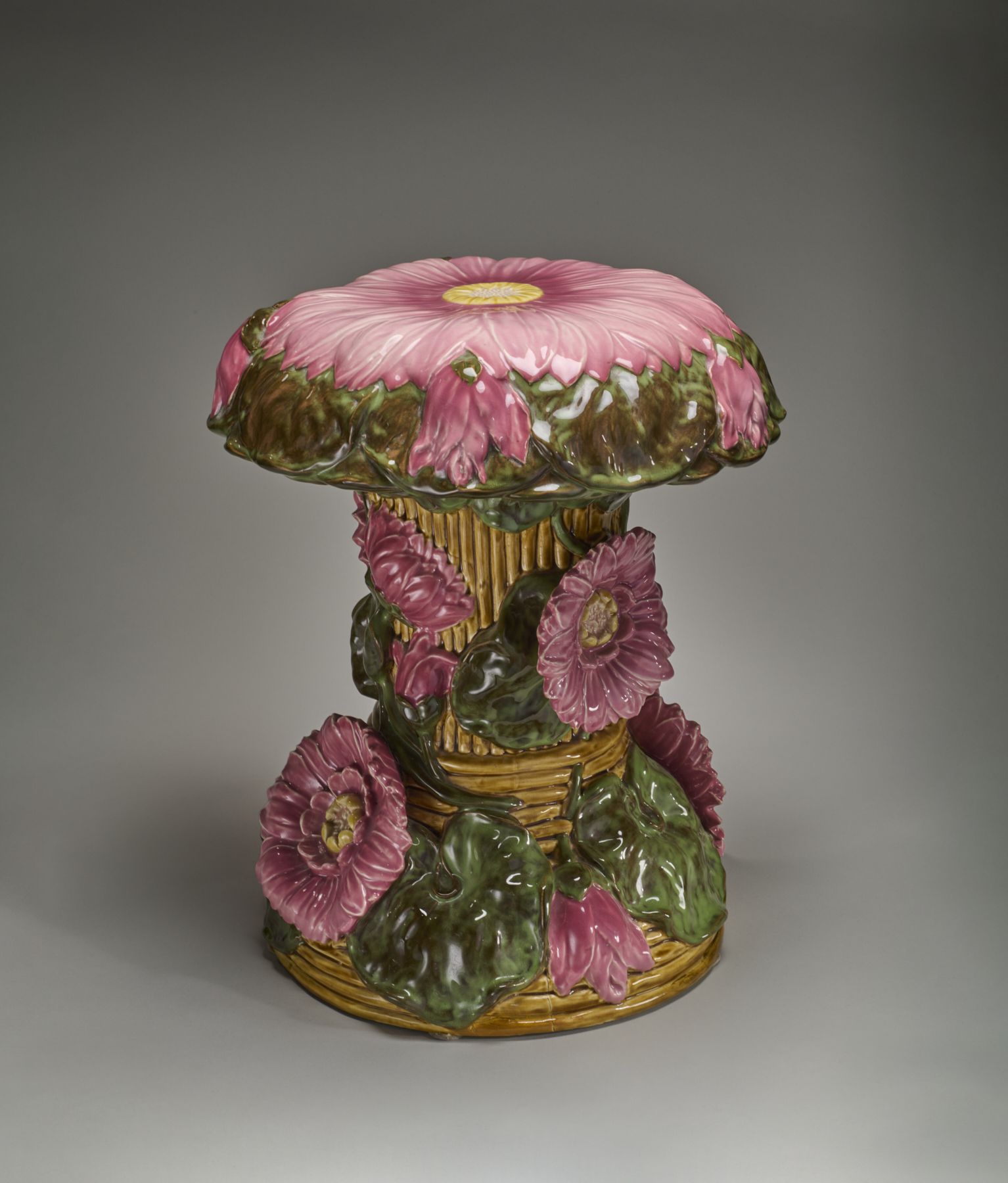 After the 1873 Vienna International Exhibition, Vilmos Zsolnay’s daughters, Teréz (1854–1944) and Júlia (1856–1950), played an active role in Zsolnay’s artistic direction, creating many new designs for the company. The company’s substantial archive reveals the extent to which the Zsolnay sisters immersed themselves in the active study of art history, taking research trips abroad, and corresponding with their father through letters about ideas for new products. In a journal entry dated 1881, Teréz Zsolnay recounted how her sister Júlia returned home from a family trip to Paris with “one single treasure; a drawing of an Egyptian wooden spoon depicting a lotus bulb with a braided stem.” This spoon inspired Júlia to create an entire series of designs for table ware based on the lotus motif, including tea wares, spoons, and serving dishes. According to Teréz, the designs achieved such lasting success that they were “manufactured continuously after the first quarter of 1881.” In 1883, Júlia married Tádé Sikorski (1852–1940), a Polish architect trained in Munich and Vienna. The two had met the previous year when Sikorski toured the Zsolnay factory. Sikorski assumed the role of Zsolnay’s lead designer, working for the company until 1918. In 1891, Sikorski revisited his wife’s popular “Lotus” designs, expanding the range to include large scale objects like flower stands, lamps, and presumably garden seats. Items from the expanded “Lotus” series, offered in a variety of colors, were the company’s most popular offerings at the 1893 World’s Columbian Exposition in Chicago. The original design for the “Lotus” garden seat, model no. 3698, is preserved in the Zsolnay Archive at the Janus Pannonius Museum in Pécs.