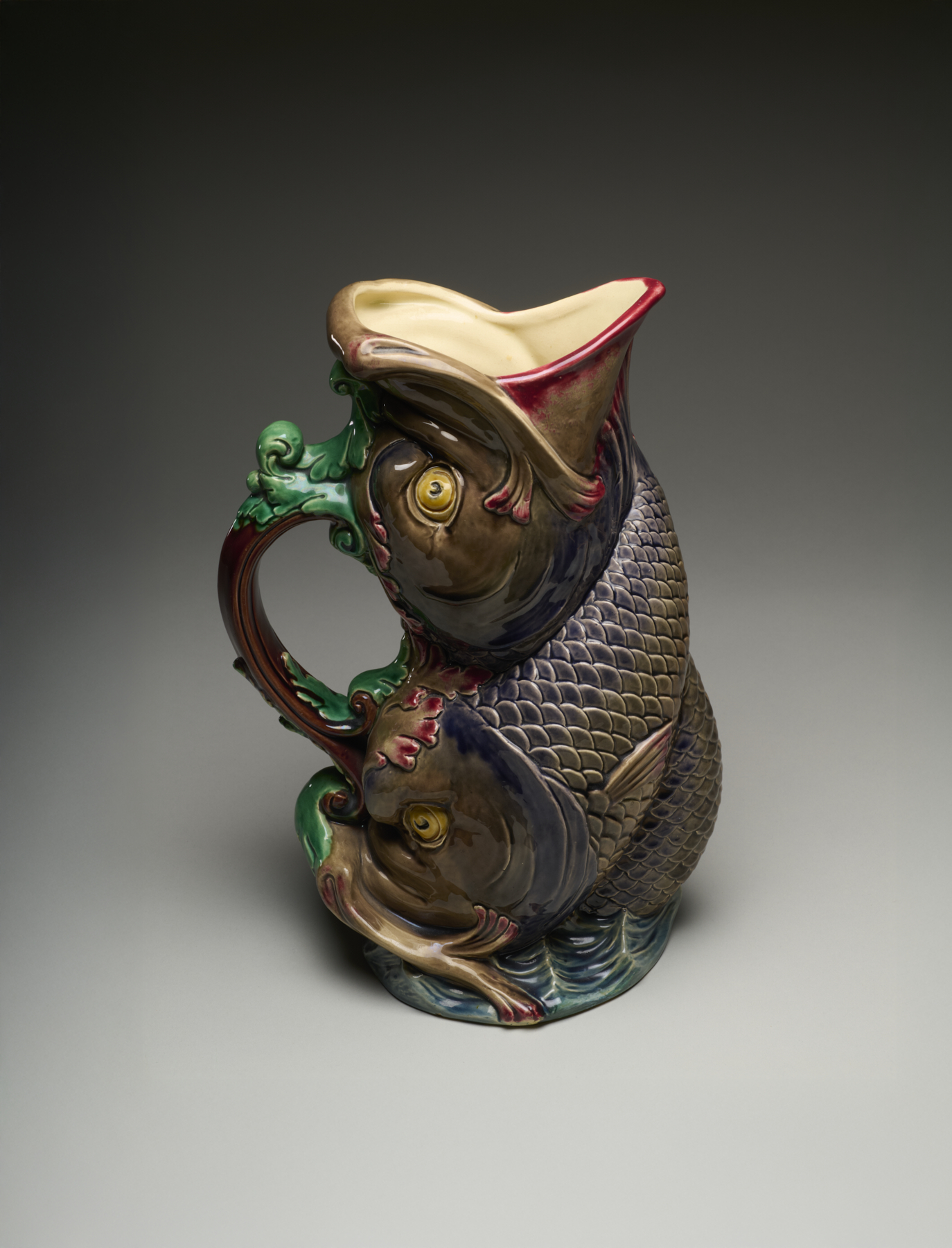 From the mid-1870s onward, the firm’s repertoire of useful jugs and ewers in traditional shapes began to include more ornate and decorative majolica pieces, which often took inspiration from Renaissance and Asian art and design. This model’s lively design of intertwined fish that form the body of this jug draw upon Chinese and Japanese precedents that have been combined, perhaps somewhat discordantly, in with a handle more reminiscent of European prototypes in its scrolling and foliate details.
