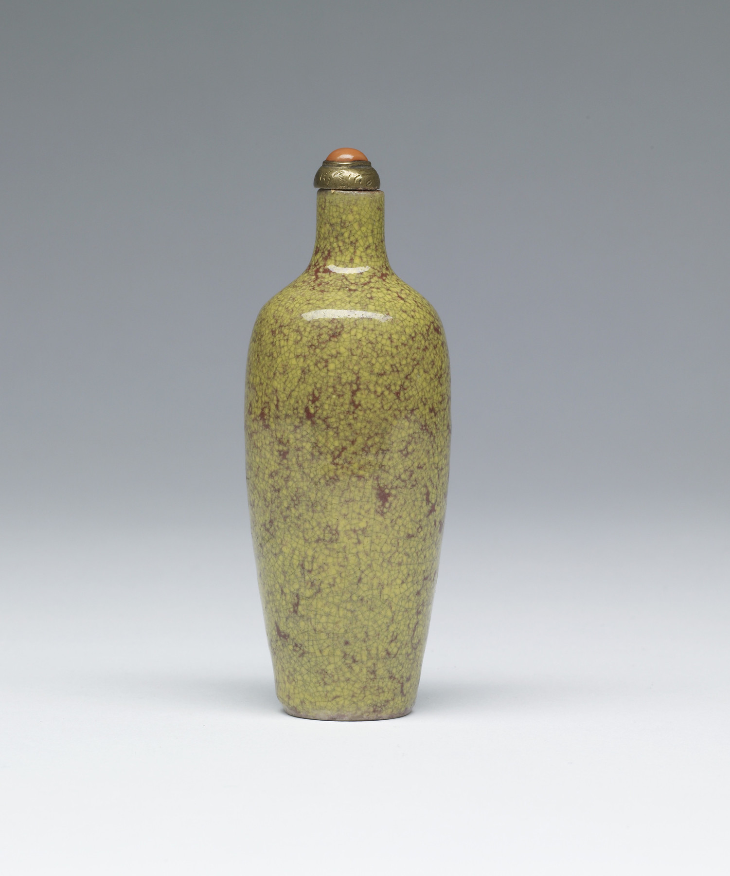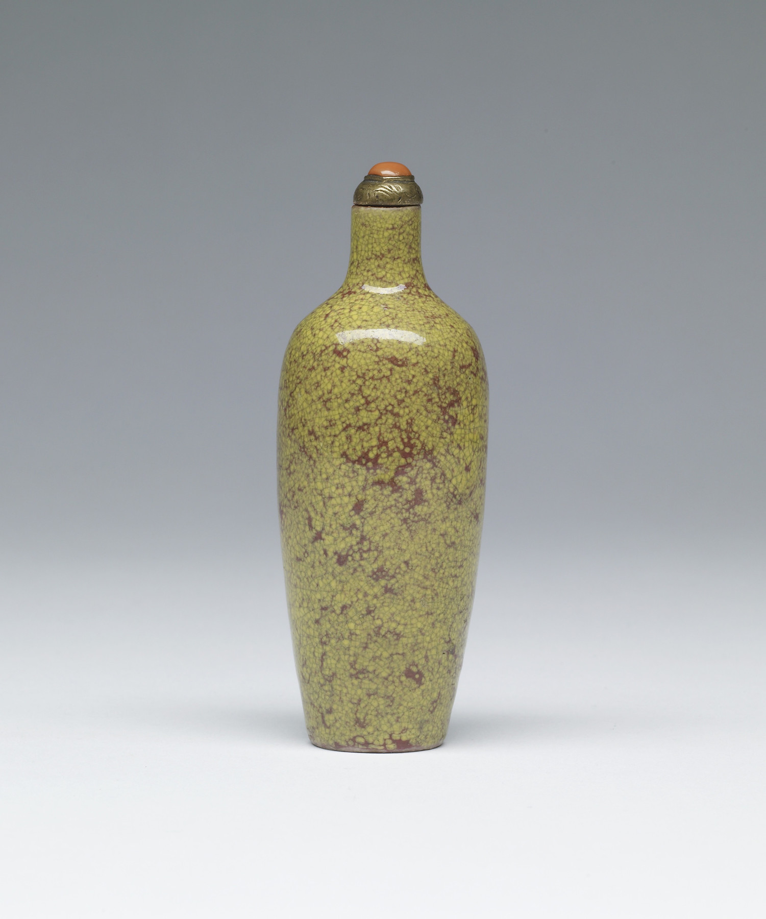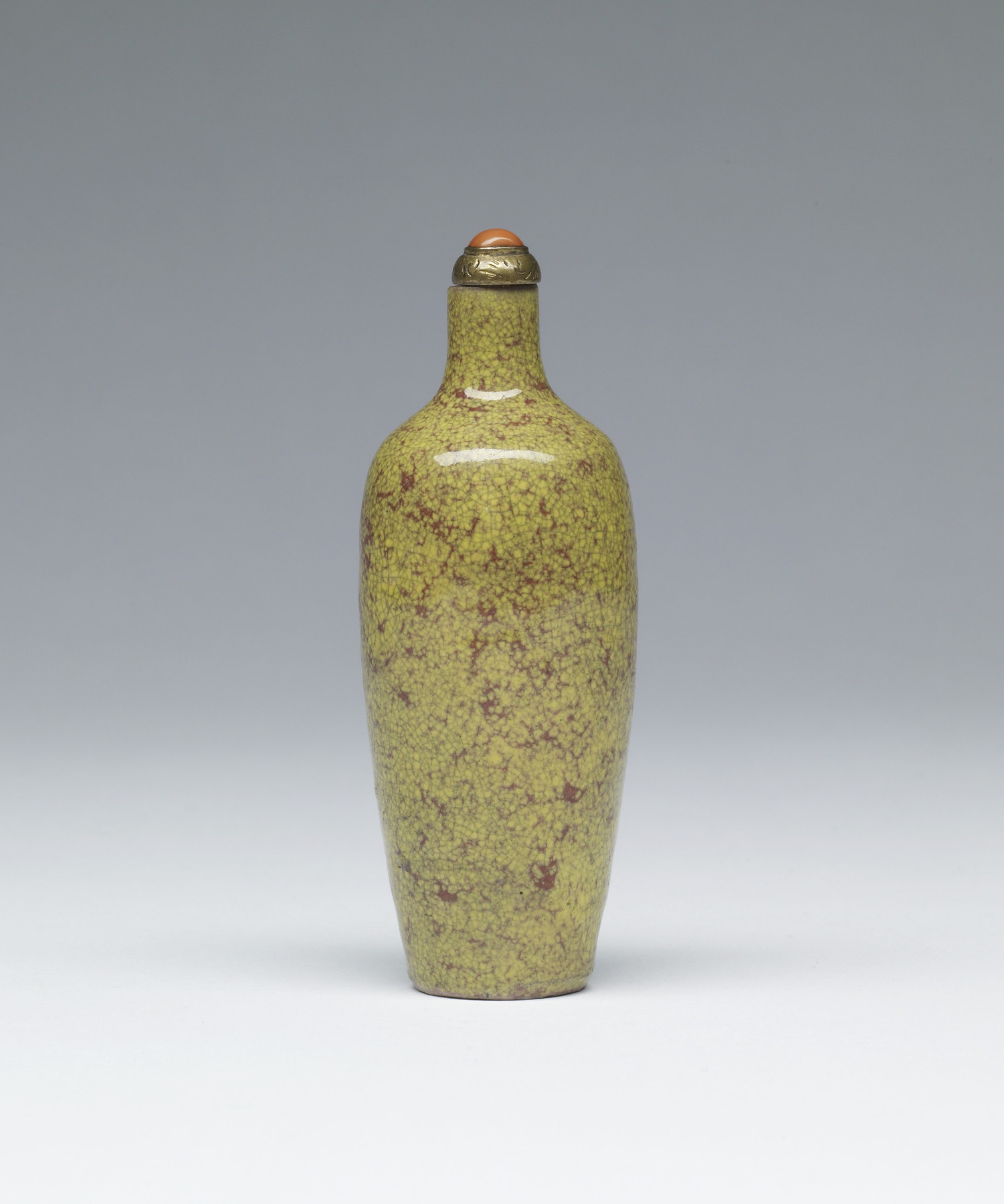 Porcelain snuff bottle of traditional vase form covered in spotted yellow and rust red glaze.