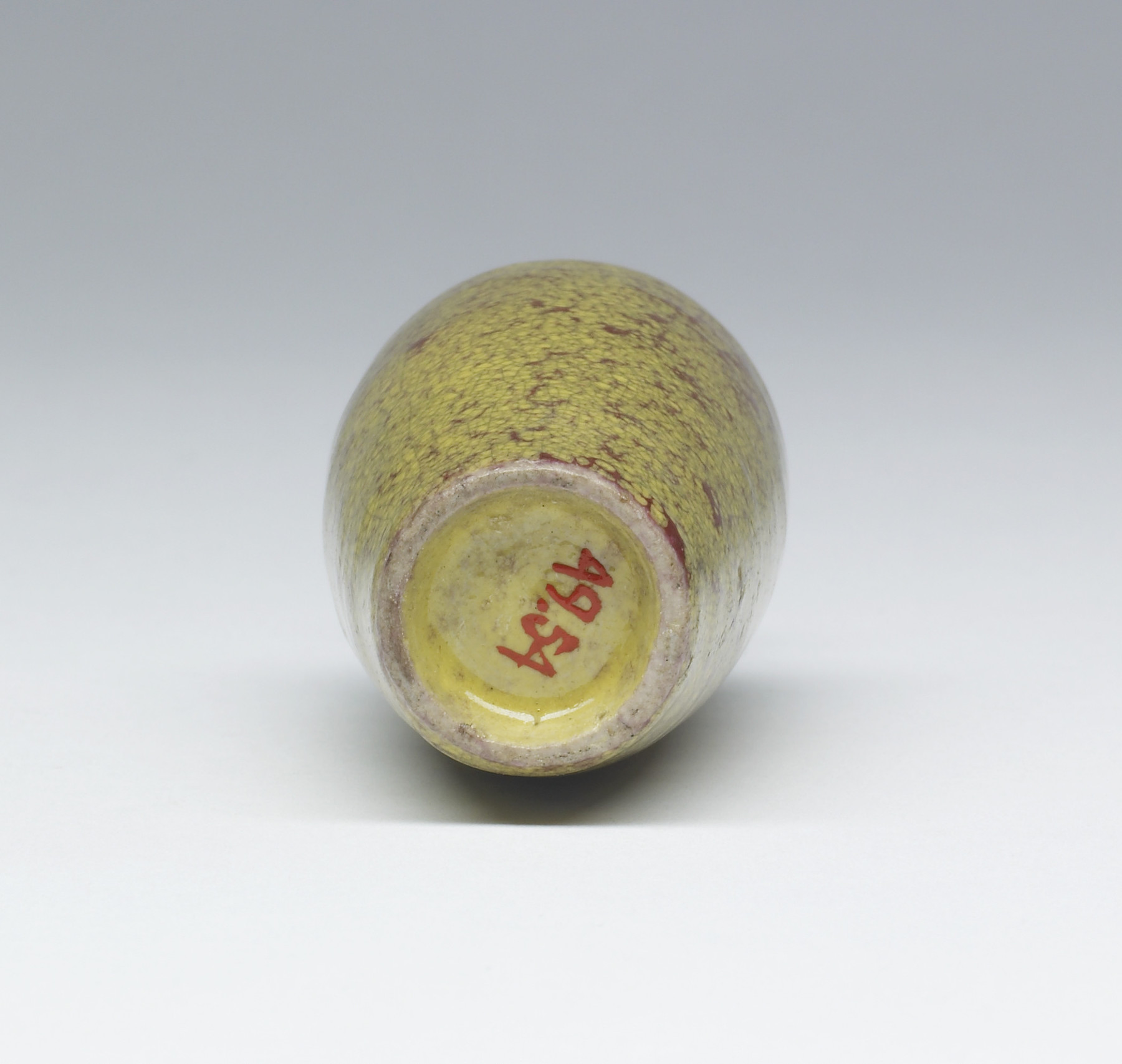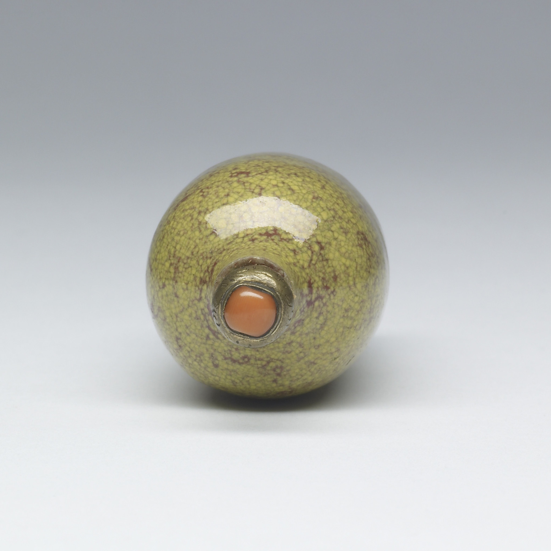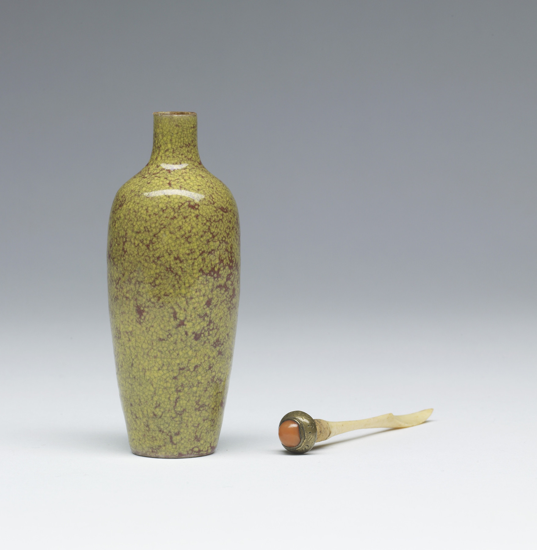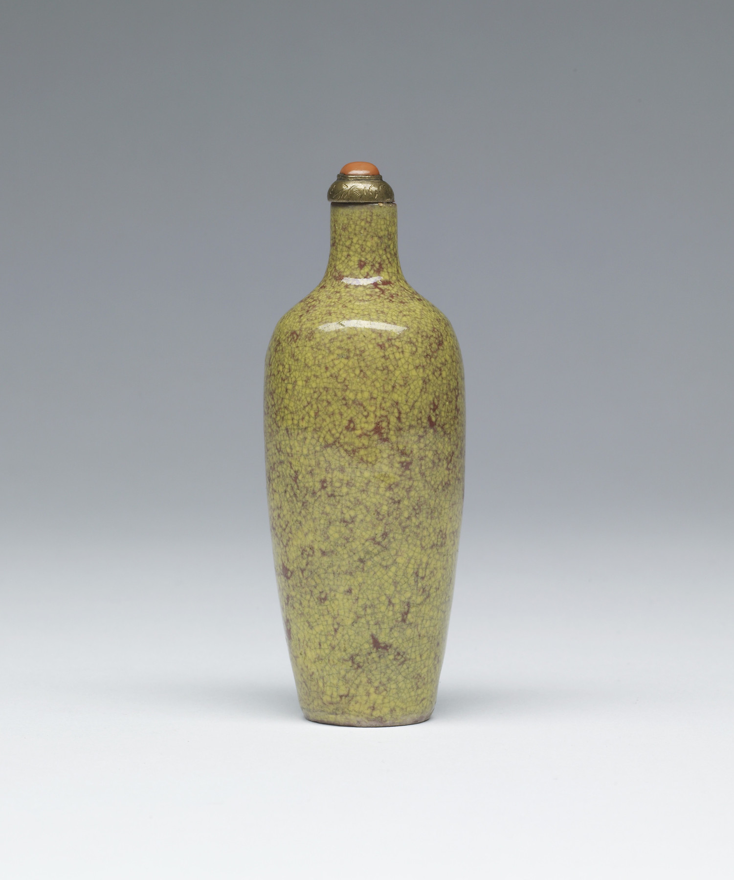 Porcelain snuff bottle of traditional vase form covered in spotted yellow and rust red glaze.