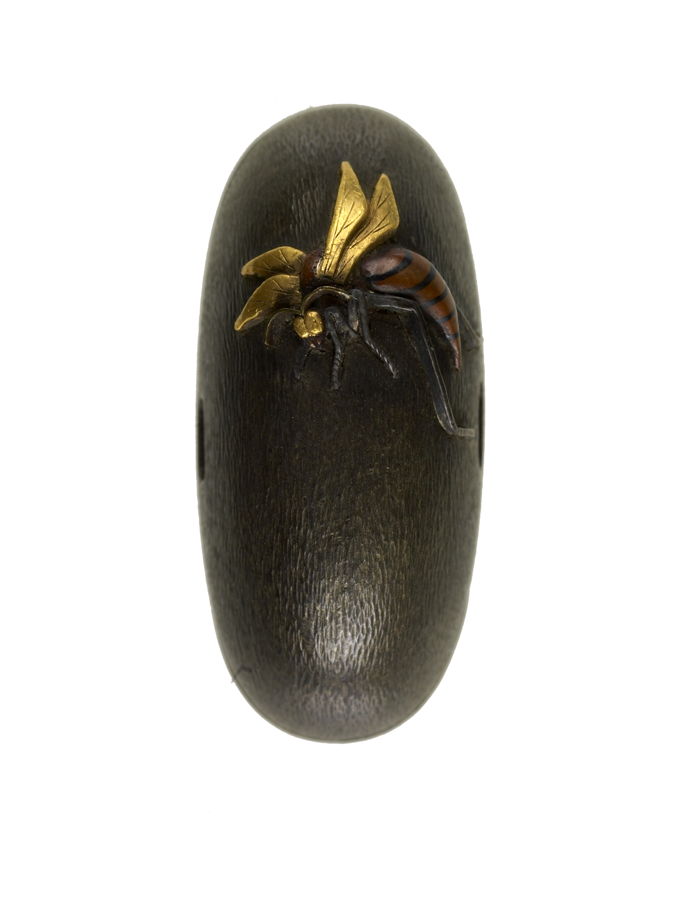 At the top of the kashira is a wasp with gold wings and a copper body with shakudo stripes. This is part of a set with Walters 51.1016.