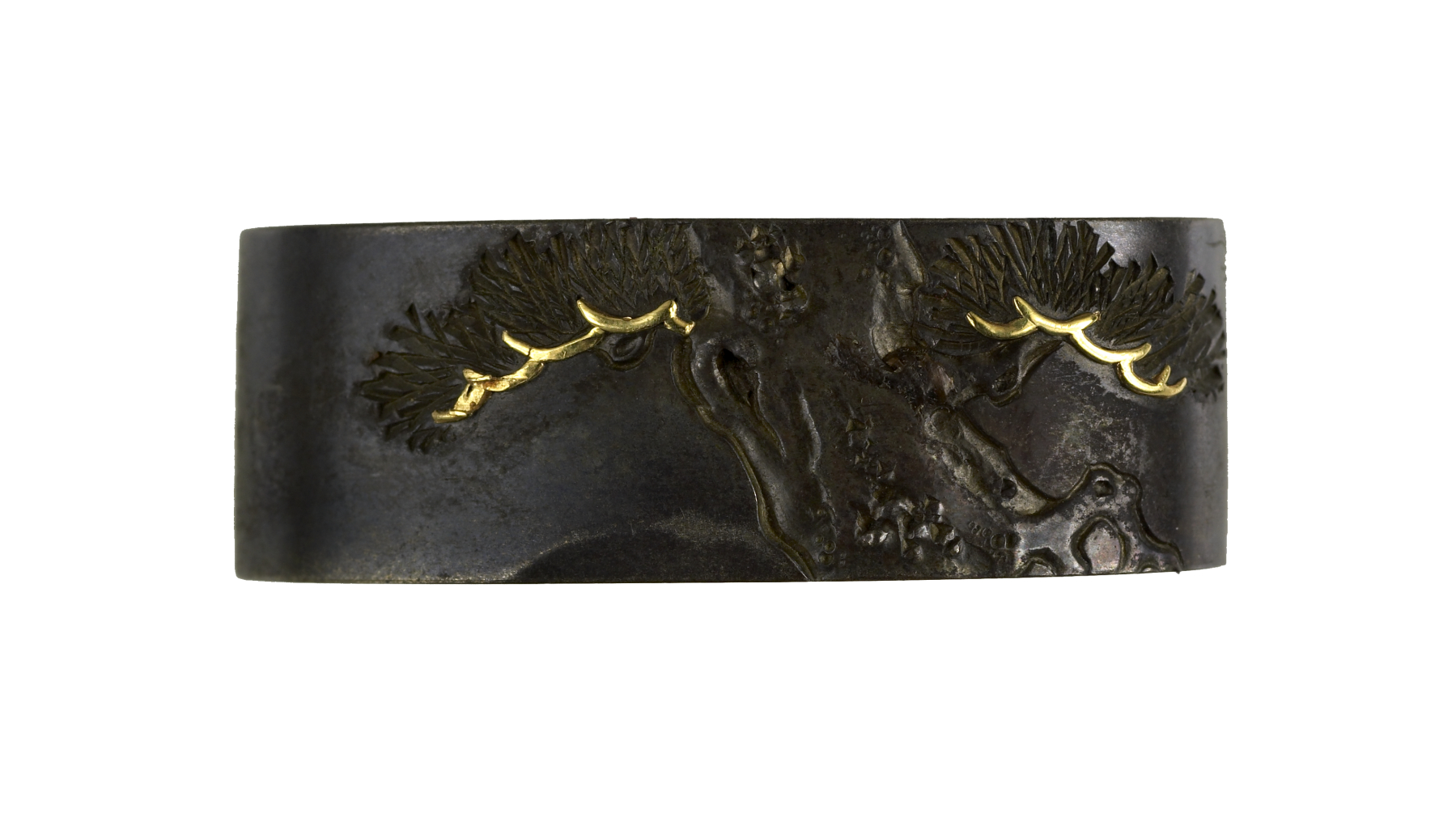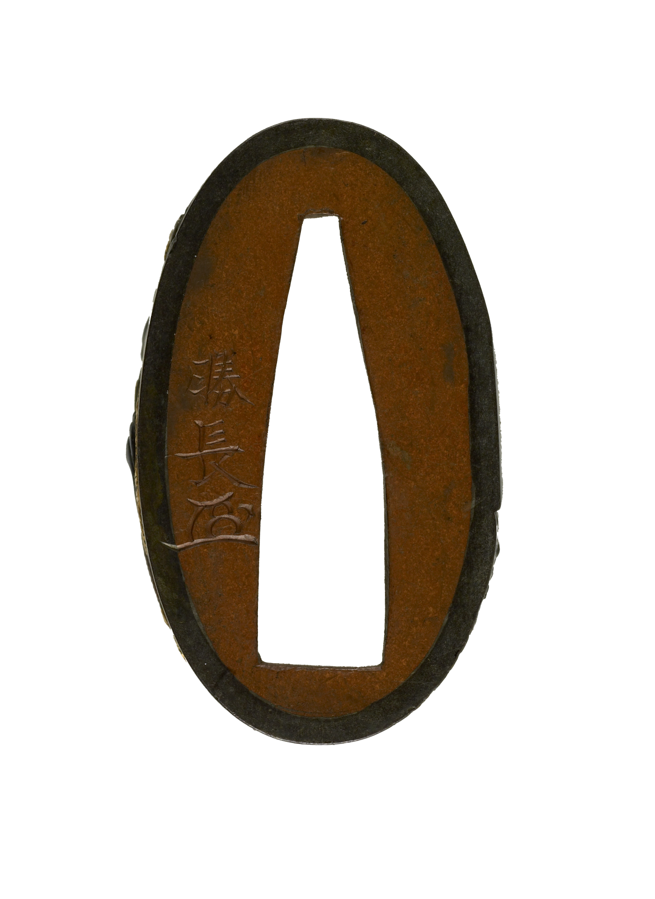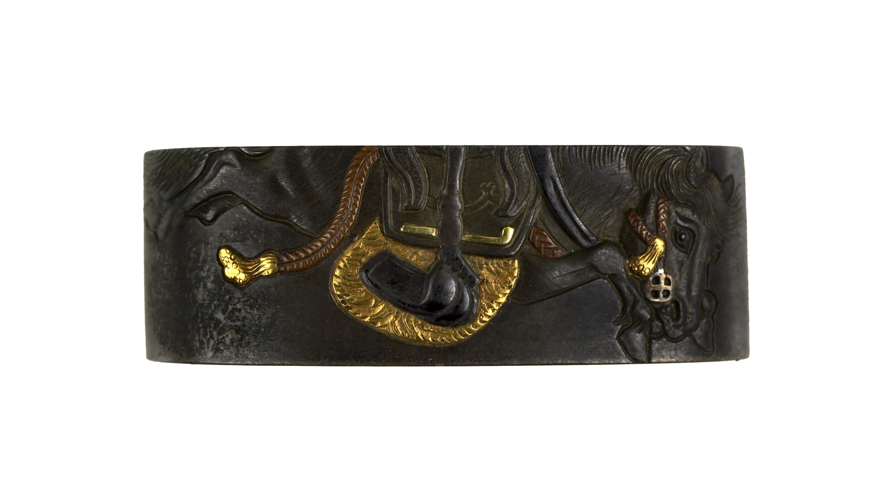 A fully saddled horse is depicted on the front of the fuchi. It is probably the horse of Ômori Hikohichi, who is depicted on the matching kashira, Walters 51.1075.