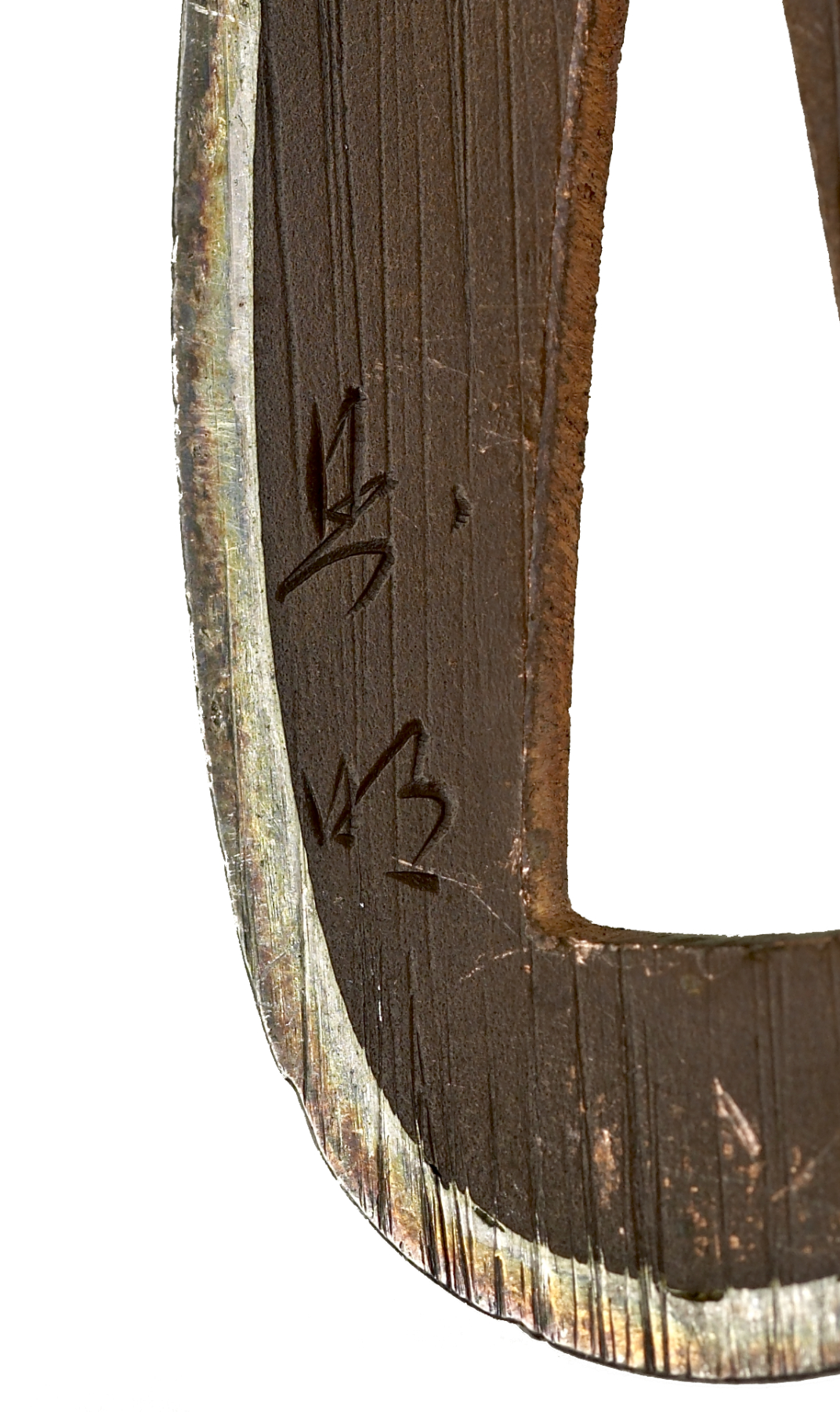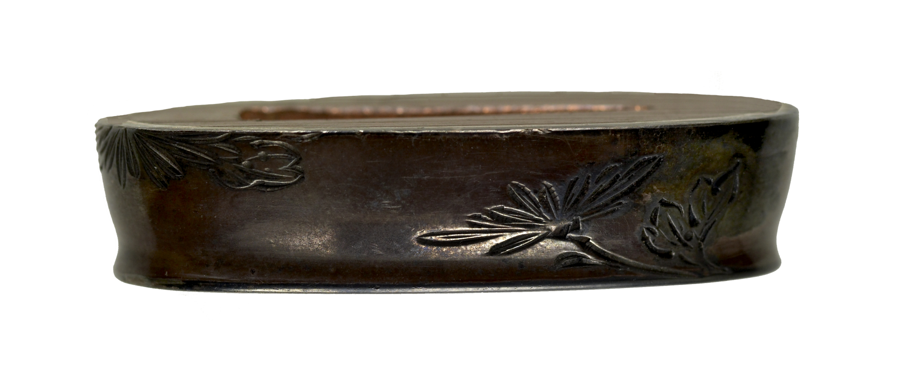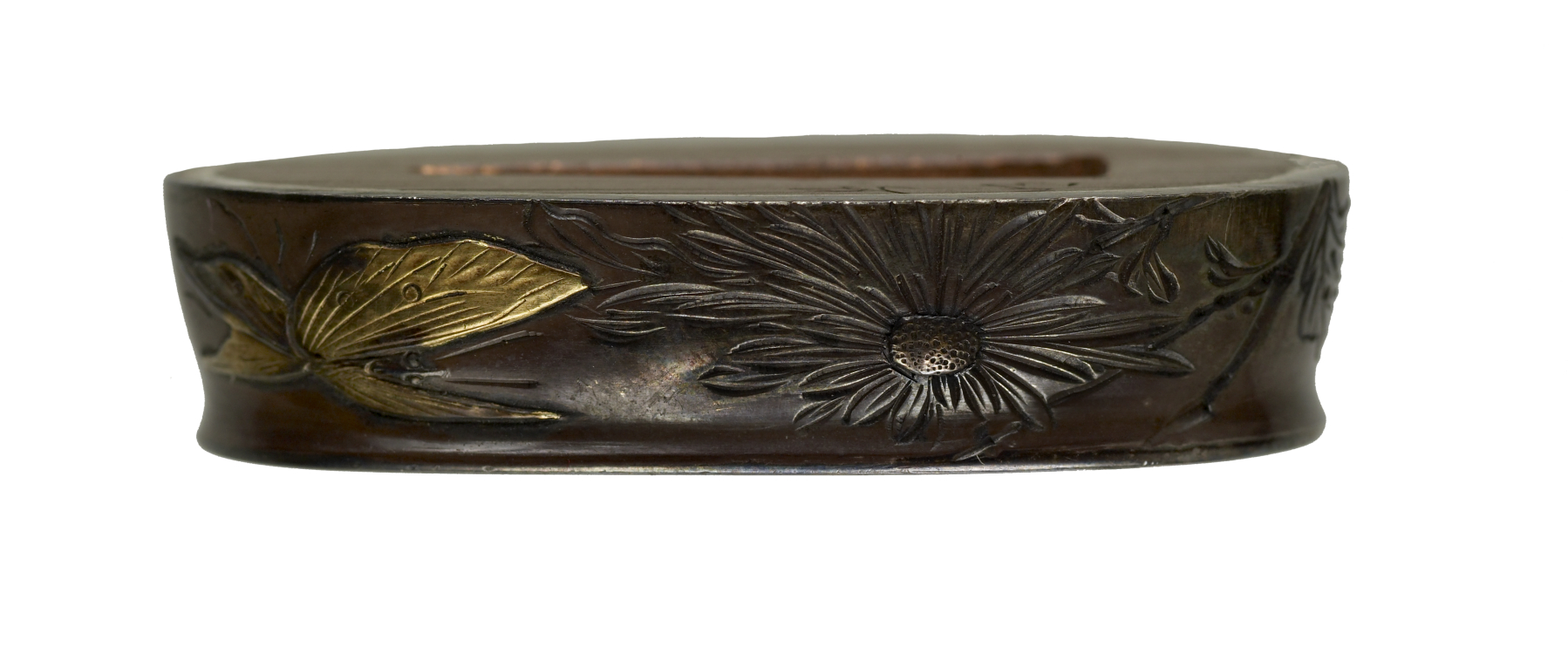 The fuchi is decorated with incised chrysanthemums and a gold butterfly. This is part of a mounted set.