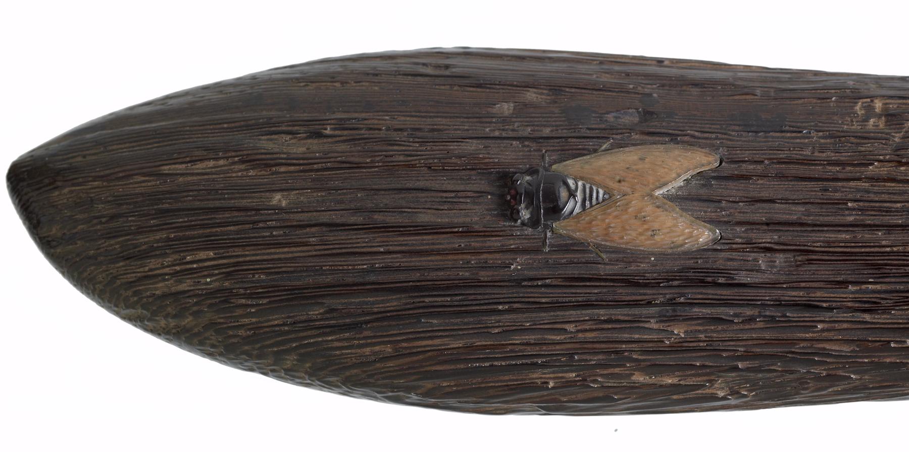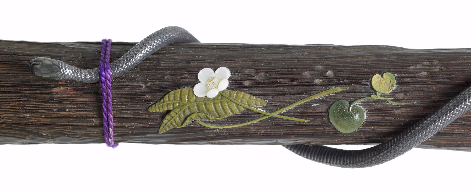Dagger (aikuchi) - Blade mounted in baton-like wood say with silver snake, frog, fly, snail and lotus in several materials. Mountings of ivory.