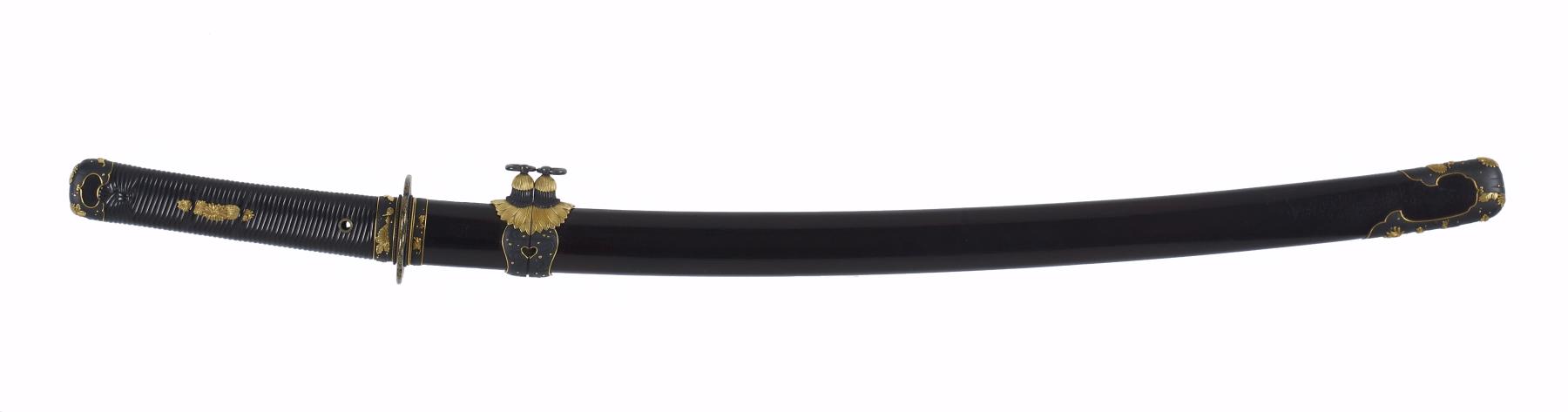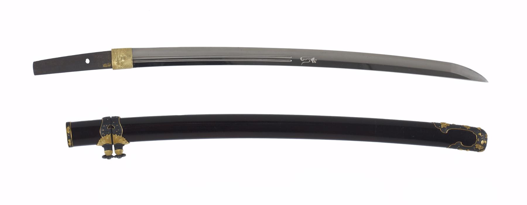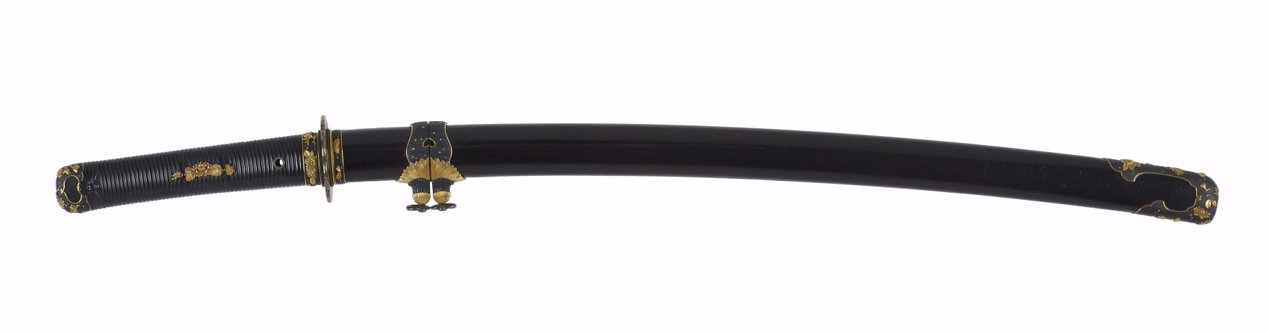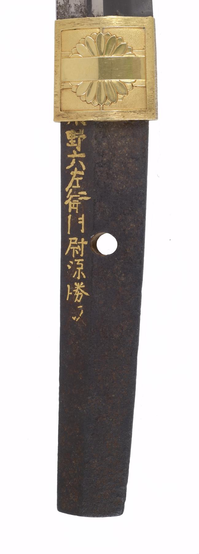 Dark brown lacquer saya with tortoise-shell markings. Mountings en suite of copper and gold, nanako grounds of fine technique. Has the sling bands and obi-tori of the tachi. Gold habaki with chrysanthemum bloom. Menuki of gold; double seppa of gold and copper, two inscriptions on fuchi; signature on left of tang, inscription on right in gold inlay. Katsumori