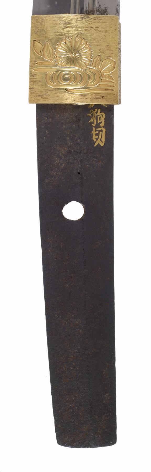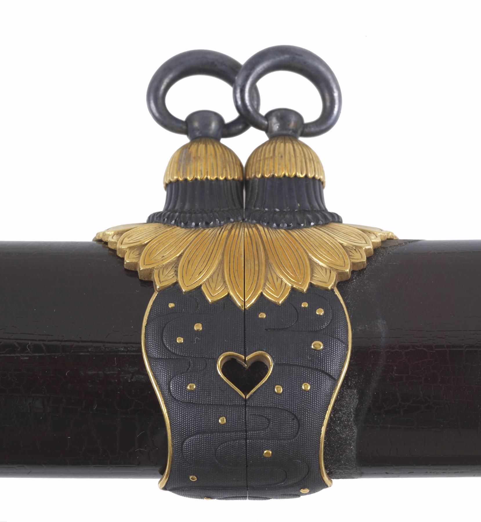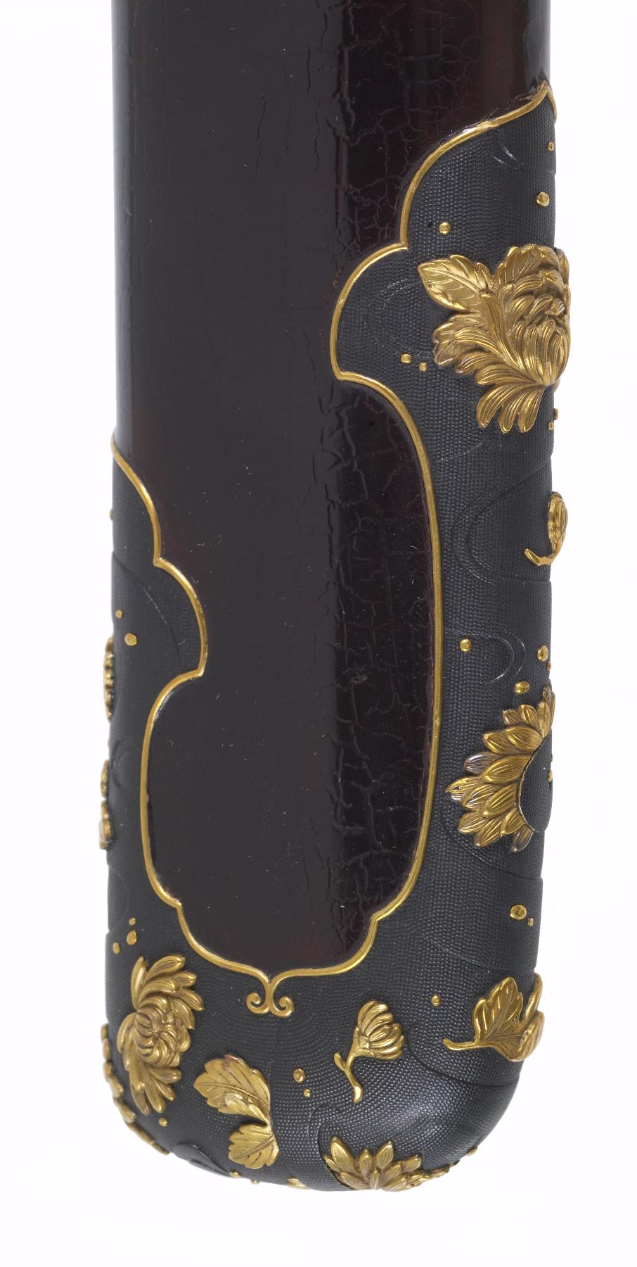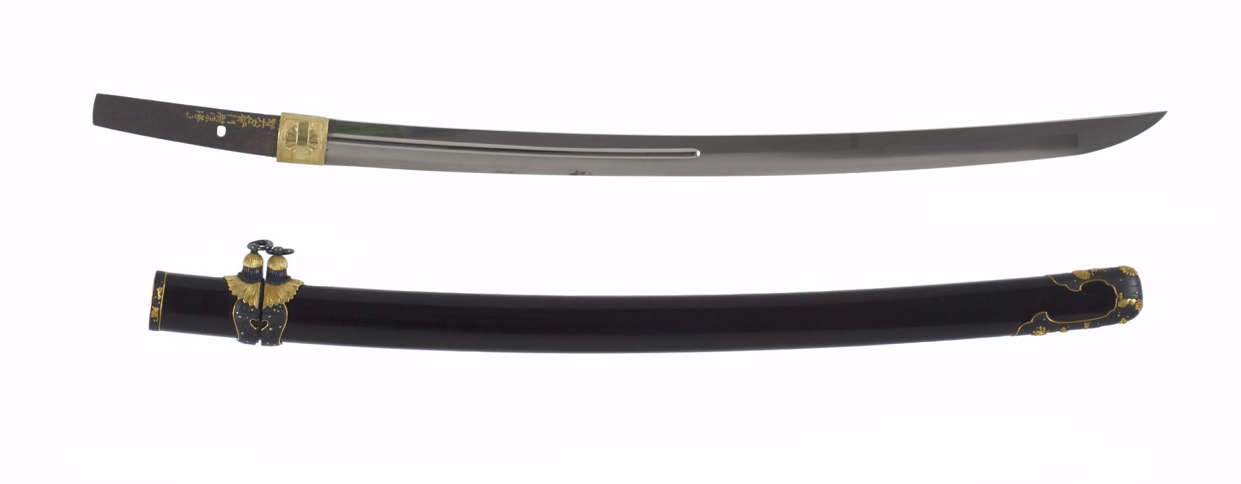Dark brown lacquer saya with tortoise-shell markings. Mountings en suite of copper and gold, nanako grounds of fine technique. Has the sling bands and obi-tori of the tachi. Gold habaki with chrysanthemum bloom. Menuki of gold; double seppa of gold and copper, two inscriptions on fuchi; signature on left of tang, inscription on right in gold inlay. Katsumori