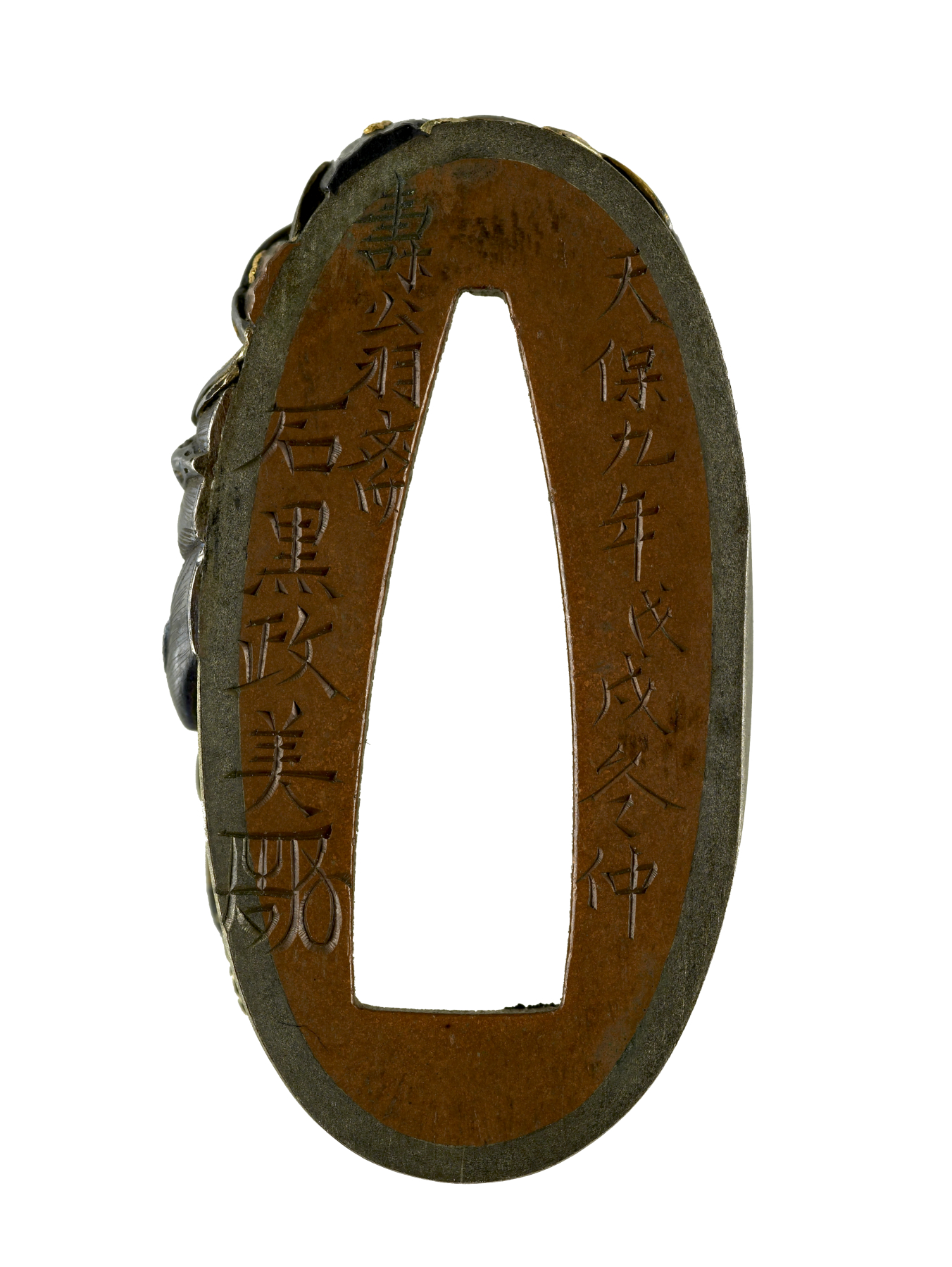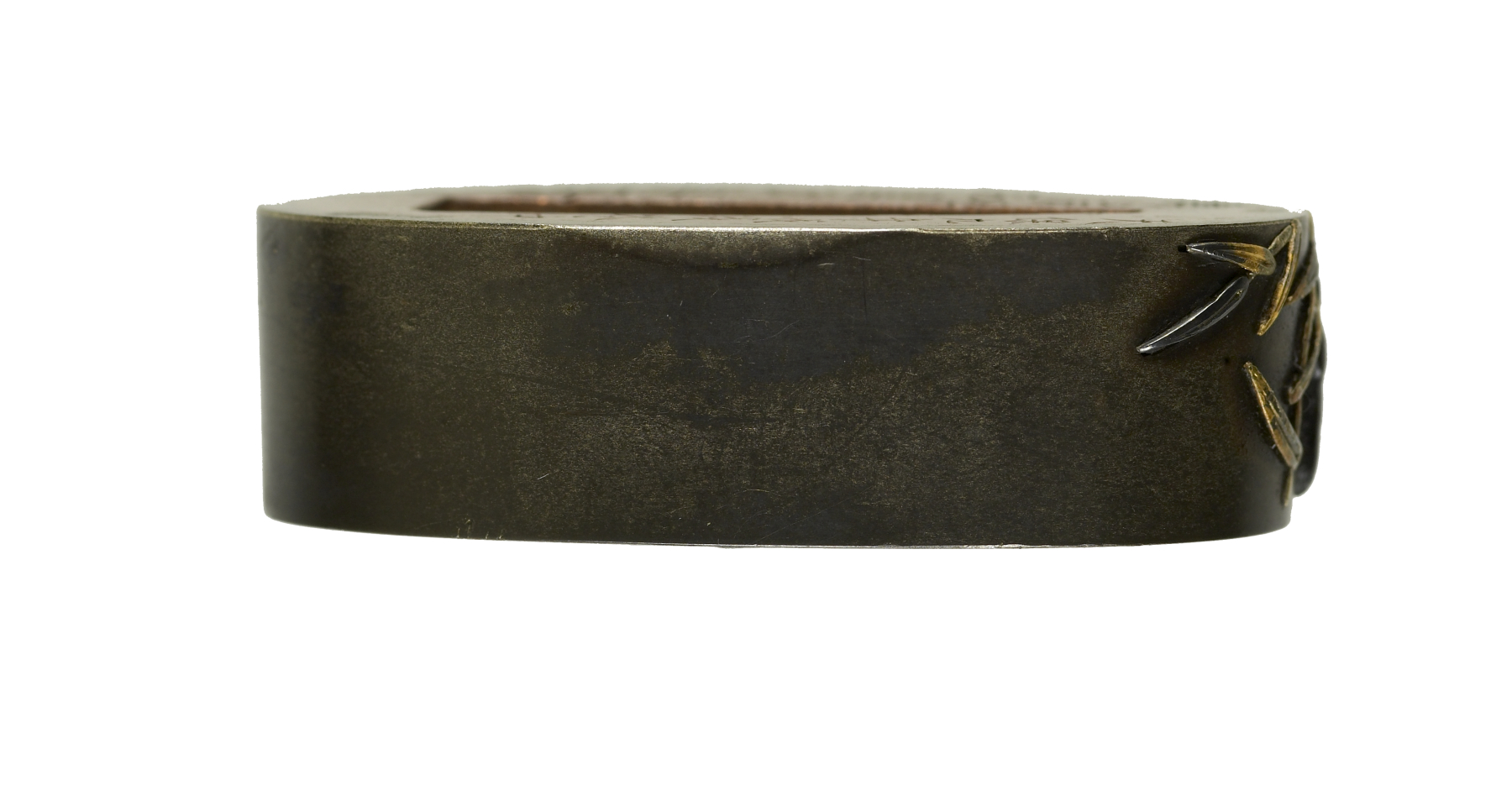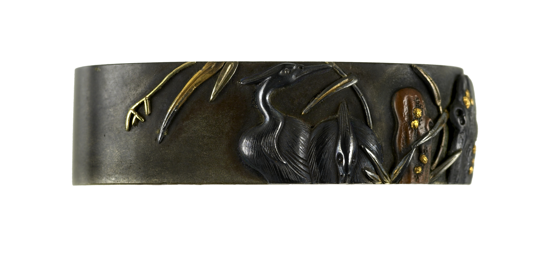 On the front of the fuchi, two herons stand beneath reeds. Decorative rocks are on the right side. This is part of a mounted set.