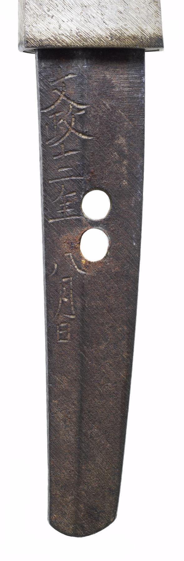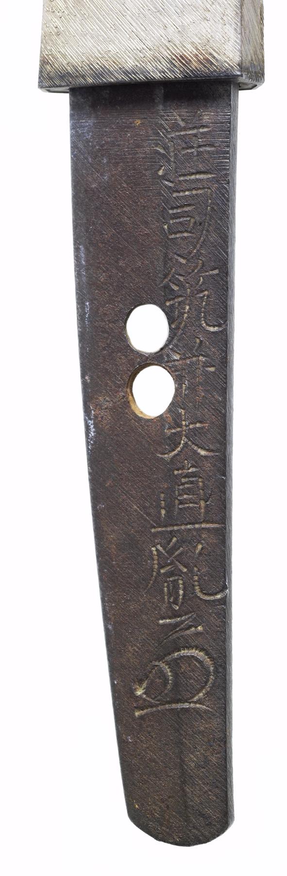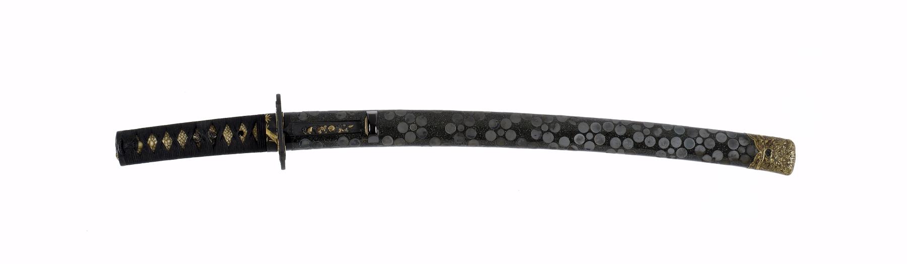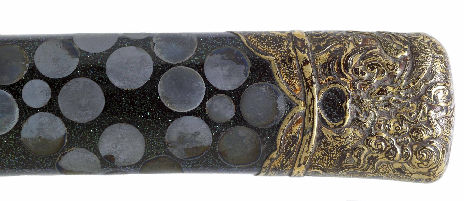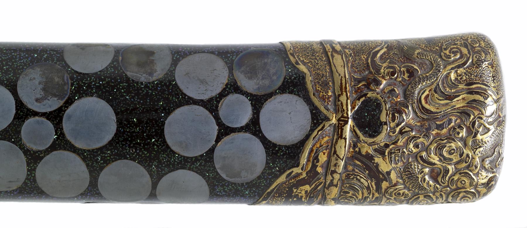 Black lacquer saya with shell dust and silver inlay, latter in the form of rosettes. Brass kojiri. Lacquer kurigata. Silver habaki; gold seppa. Other mountings of copper with gold and silver detail. Tsuka with ray skin and ito-maki. Kozuka inscribed on blade.