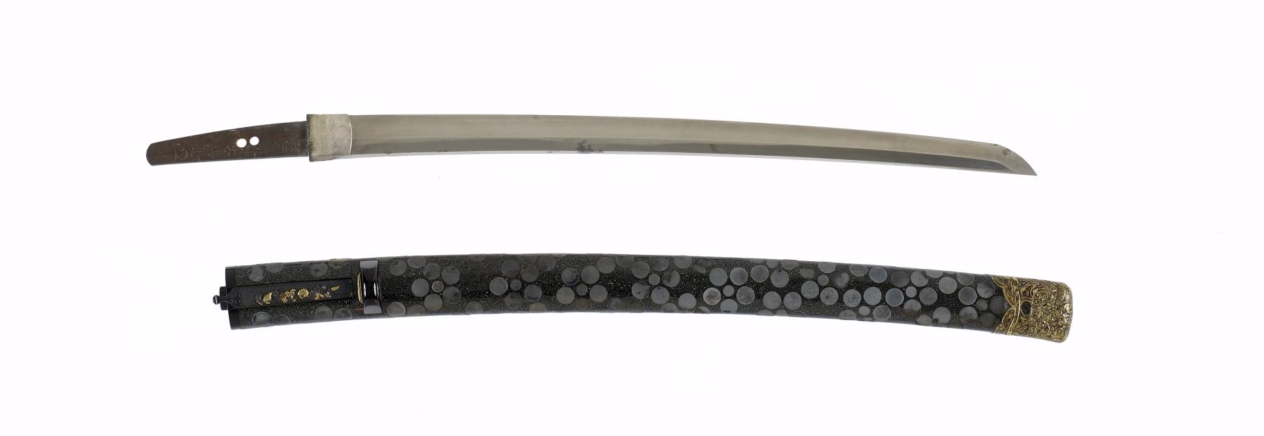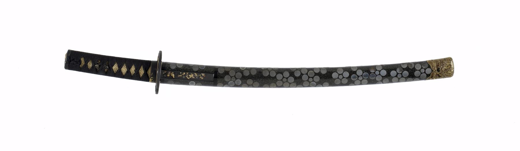 Short sword (wakizashi) with black lacquer saya with plum mon design (includes 51.1249.1-51.1249.5)