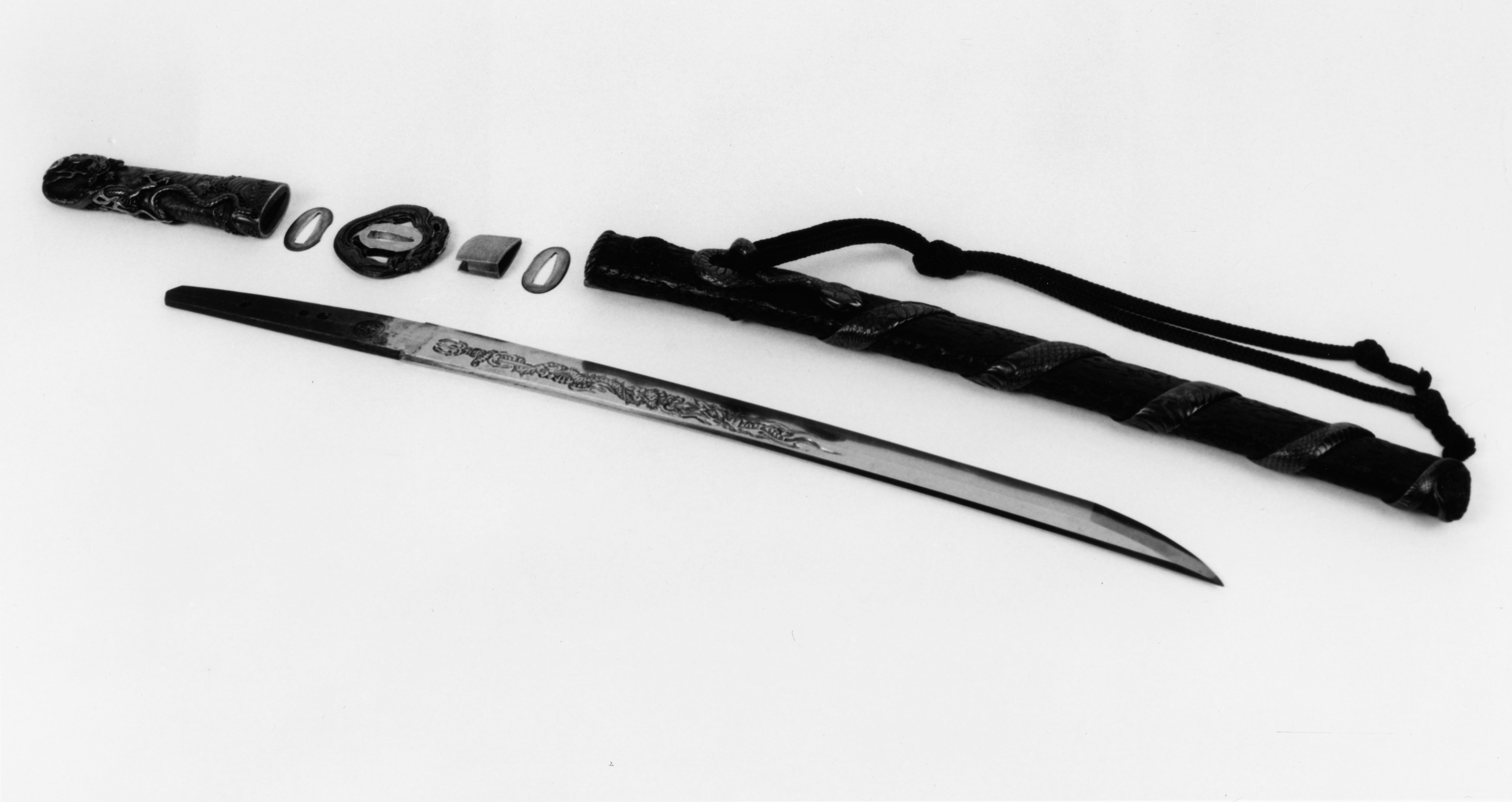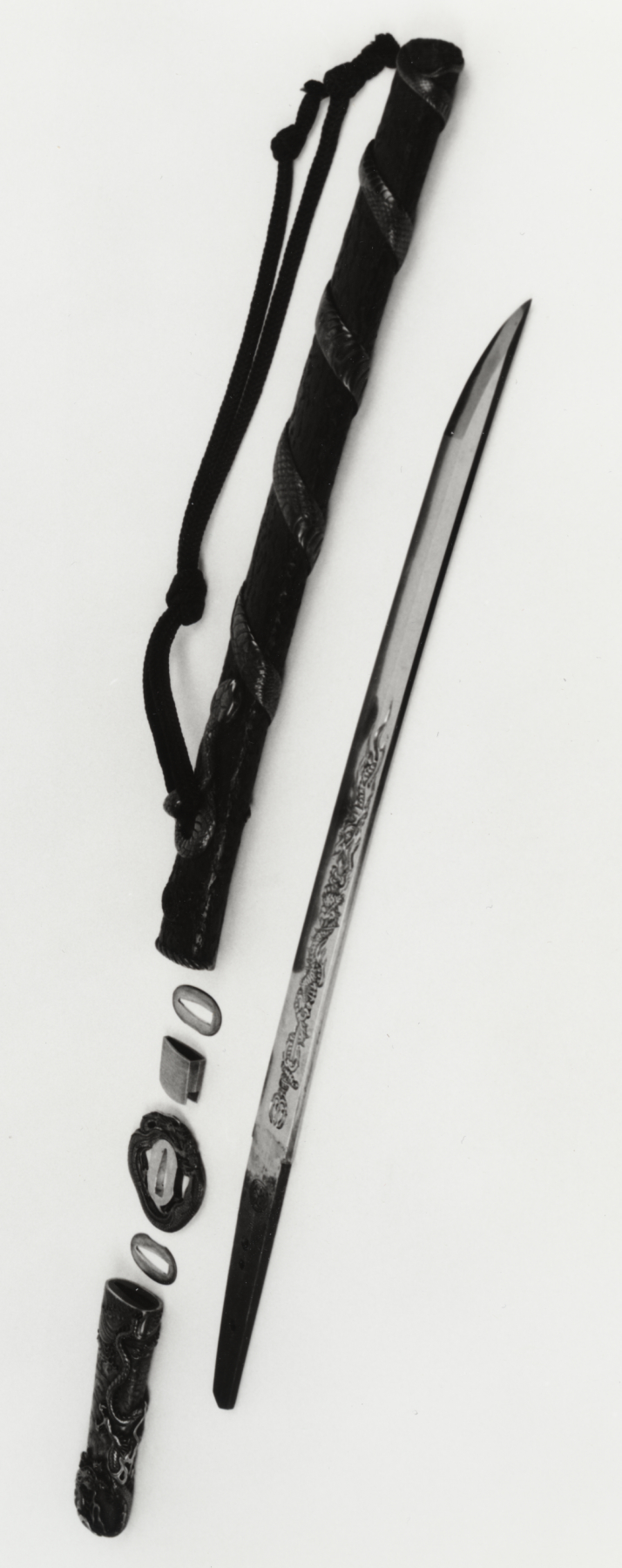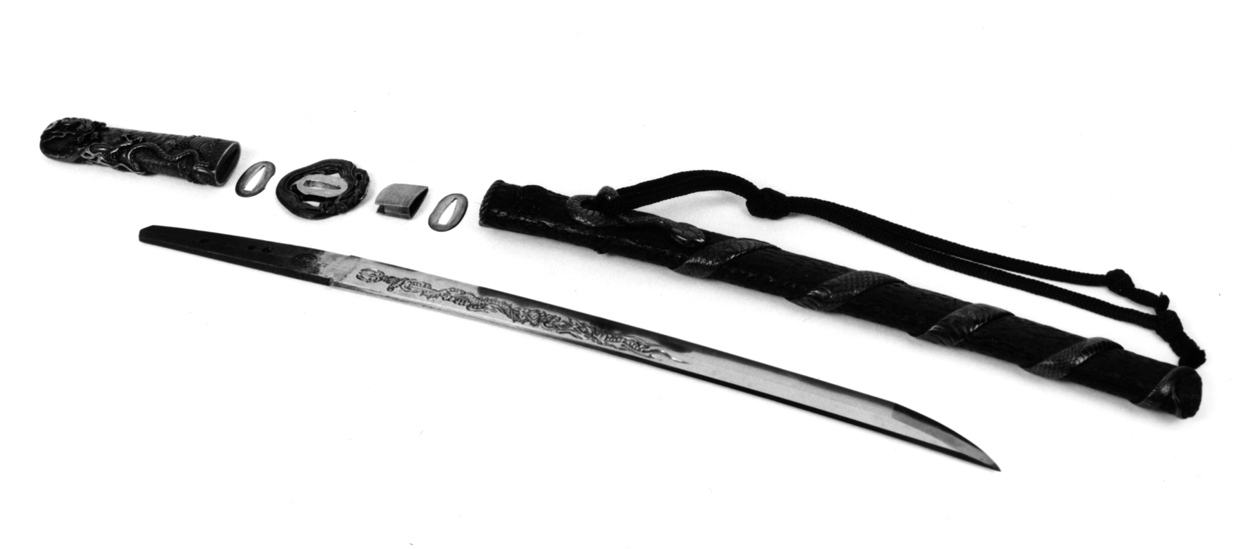 Wood saya worked with pine bark and large silver snake coiling arond it. Mountings of silver with gold detail; Tsuba with dragon clutching a jewel. Gold habaki. Kozuka handle of sentoku with lizard and orchids. Very heavy blade with the double-edged sword of the fierce Buddhist deity Fudo Myo-o, a dragon coiled around it, is engraved on the blade. Inscribed "Yasutsugu (Third Generation) Made in Tokyo, around 1665.