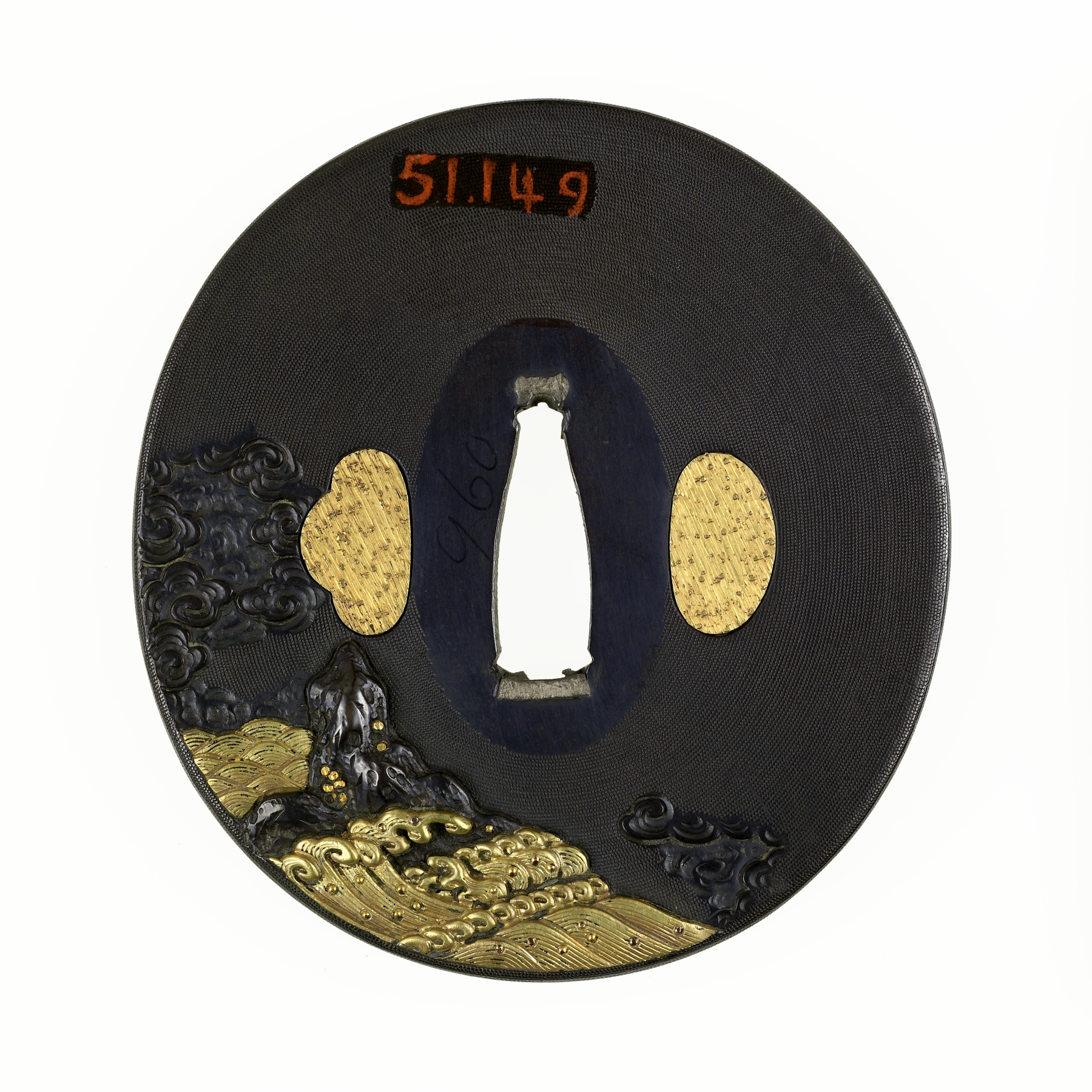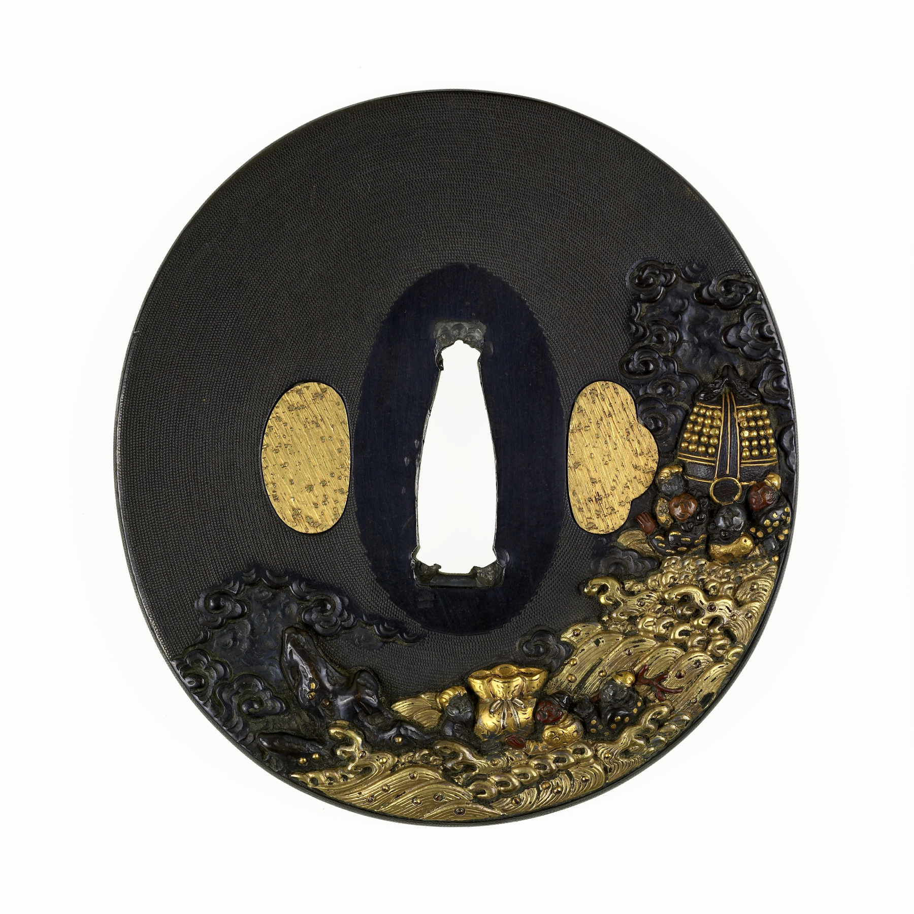 This tsuba shows attendants of the Dragon King carrying gifts of gratitude to Fujiwara no Hidesato. The Dragon King asked Hidesato to kill the giant centipede of Mount Mikami, who was poisoning the Dragon King's underwater kingdom. Hidesato shot the centipede with an arrow, killing it. In gratitude, the Dragon King gave him a bronze bell, a never-ending bolt of silk, a pot that cooked food without fire, and a limitless bag of rice. Because of the rice, Hidesato is also known as Tawara Toda (Lord of the Rice Bag). The bell and the bag of rice can be seen in the waves on the front of this tsuba. The back of the tsuba shows waves and rocks.