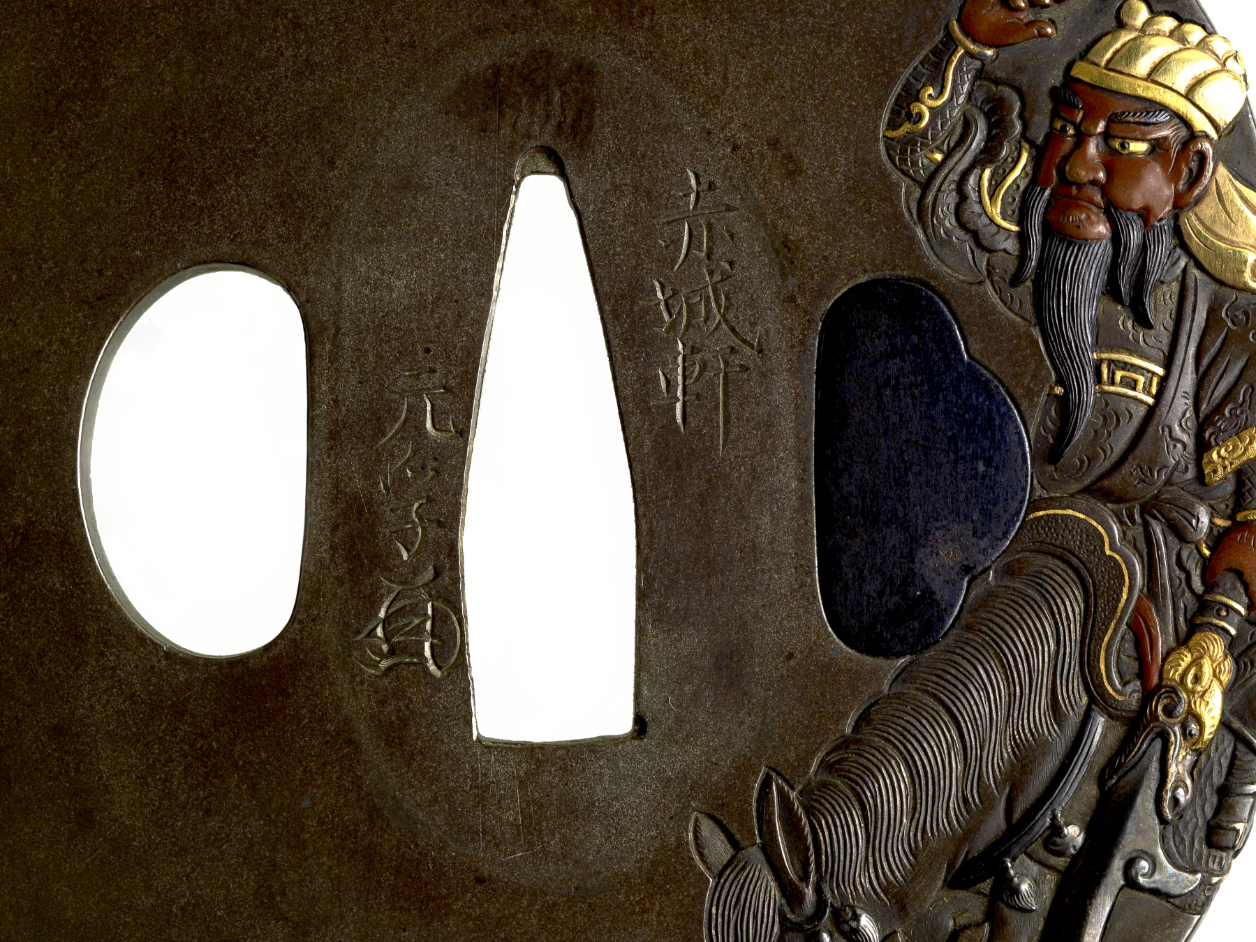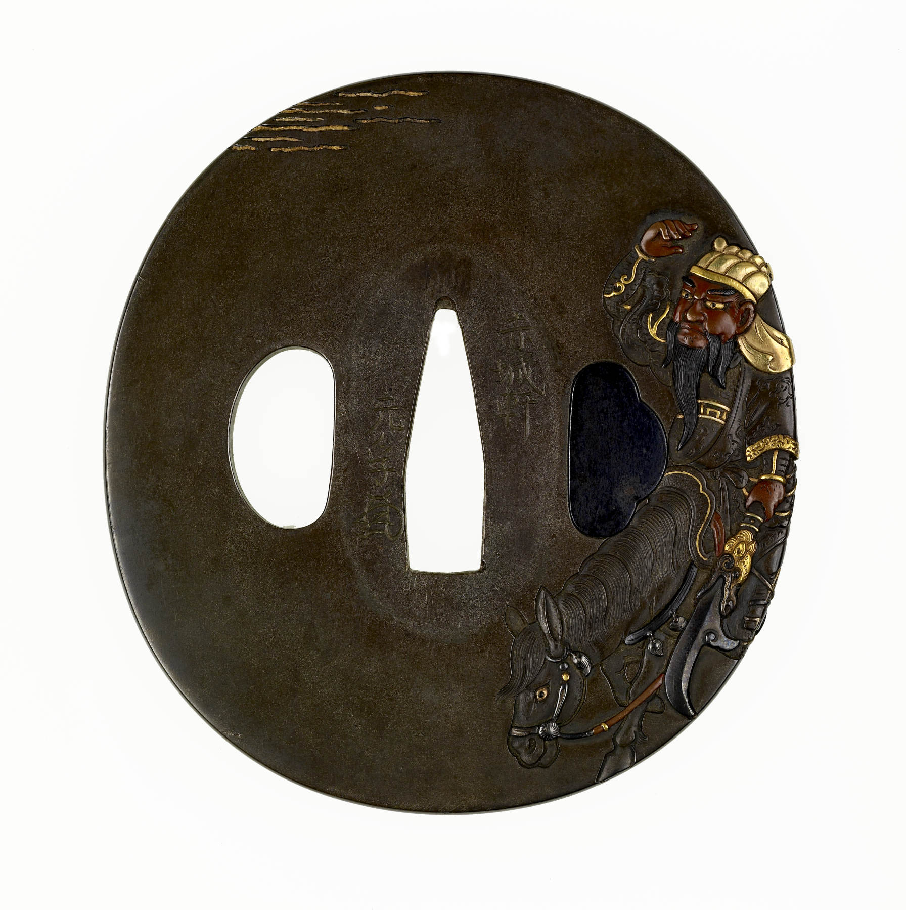 The mounted figure along the right edge of this tsuba is 2nd-century Chinese general Kanyu (Ch. Guan Yu [Kuan Yu]). Stories of his activities during the Three Kingdoms period are told in the 14th-century novel "Romance of the Three Kingdoms." He is recognizable by his long black beard. He was sometimes called "Lord of the Splendid Black Beard." On the reverse of the tsuba is the back of his horse and a pine tree.
