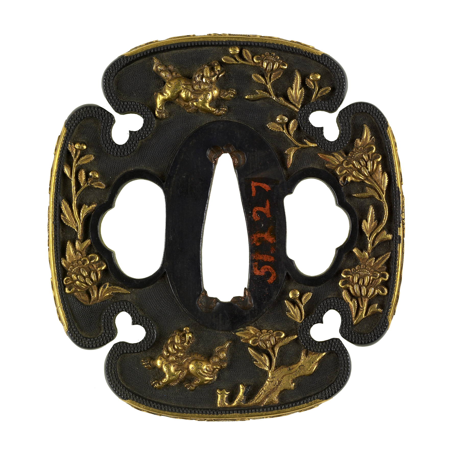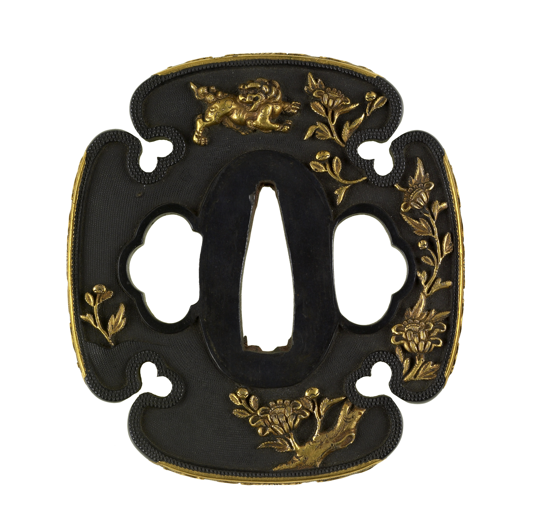 Chinese lions and several peony flowers decorate this tsuba. The two motifs often appear together. Both of these motifs and the shape of the tsuba body give this object a Chinese feel. The edges of the tsuba have gold plates decorated with peony. On the front, one lion appears above the central opening and other lion appears below. On the reverse there is only one lion at the top.