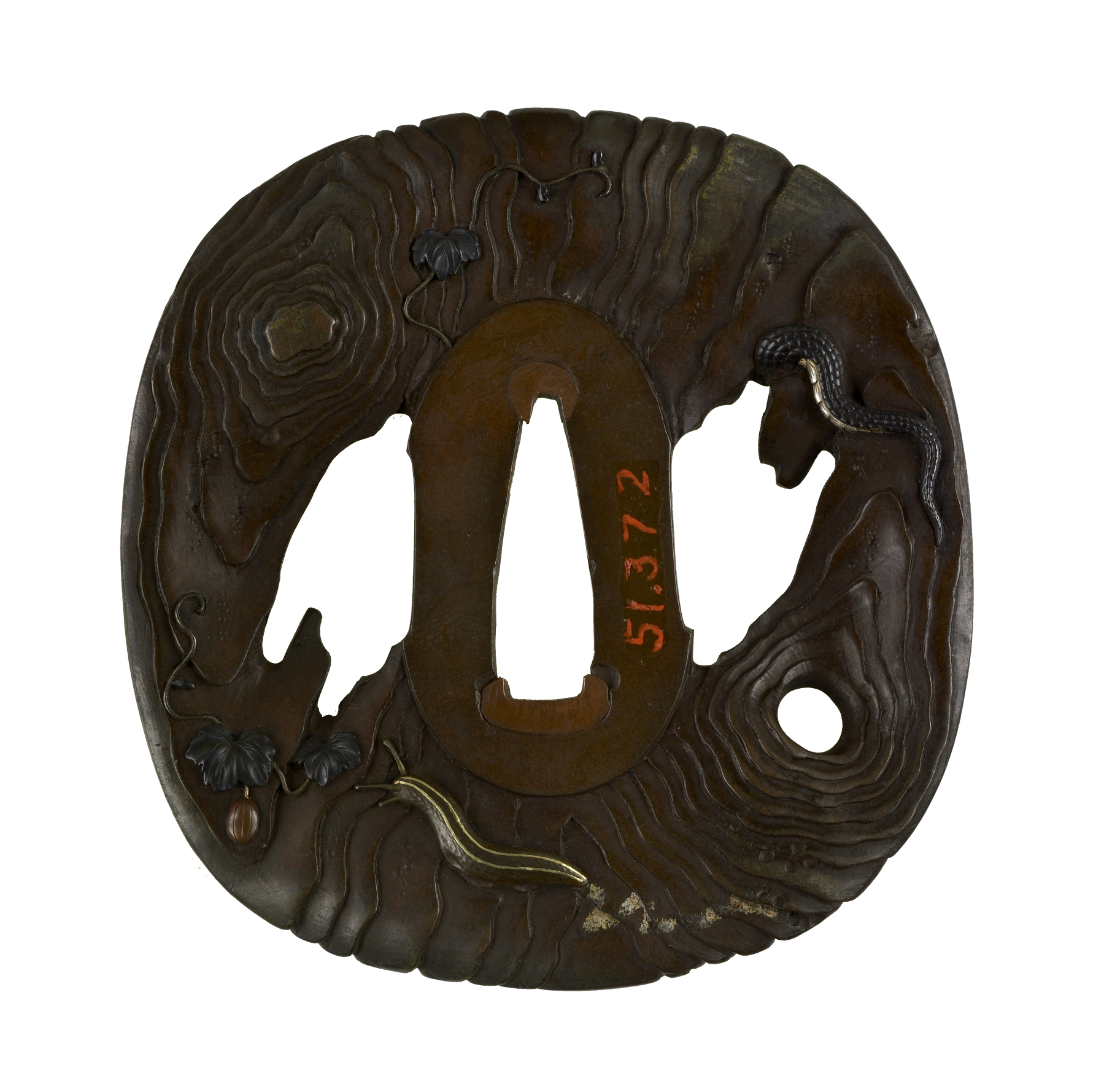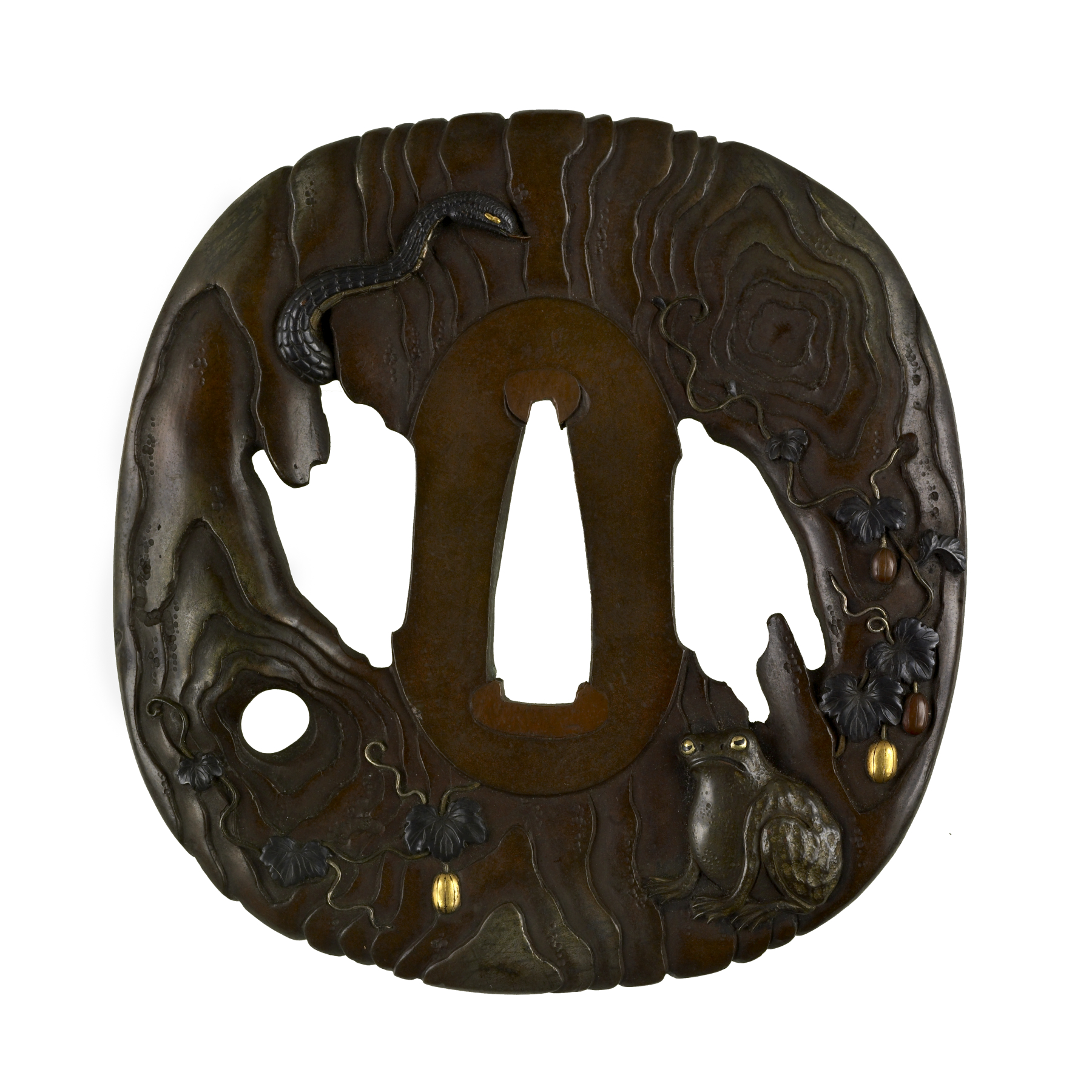 The body of this tsuba is sculpted to resemble a piece of weathered wood. The openings for the utility knife and the hair pick look like natural holes in the wood. At the upper left, a snake emerges from the utility knife hole. A frog sits and the lower right, surrounded by gourds. On the reverse is a slug. The snake's tail is also visible coming through a hole as if from the front. This is likely a reference to the story of Jiraiya, which was a popular narrative of many installments published in the mid 19th century. Jiraiya had been educated in frog magic. Snake magic can overcome frog magic, but snail magic can overcome snake magic. Jiraiya married a woman who had snail magic (represented by the slug on the reverse). There is a related idiom that is the equivalent of the English phrase "like a deer caught in headlights." The Japanese phrase is "like a frog being watched by a snake," which implies that the frog can not get away.