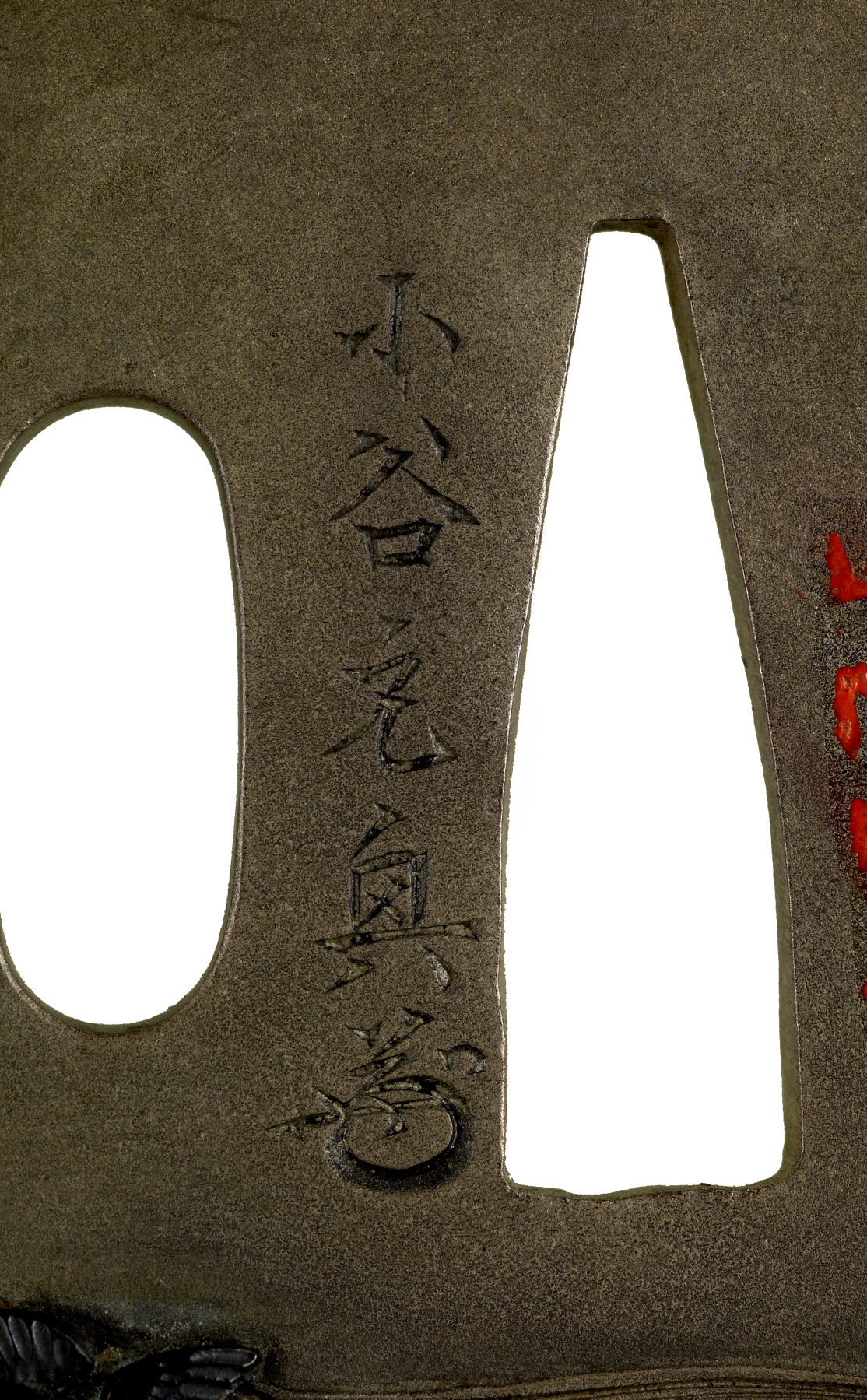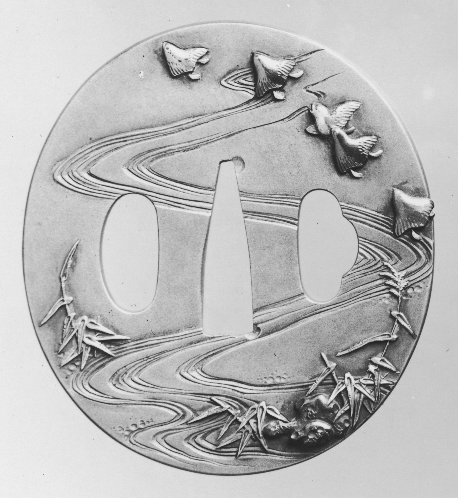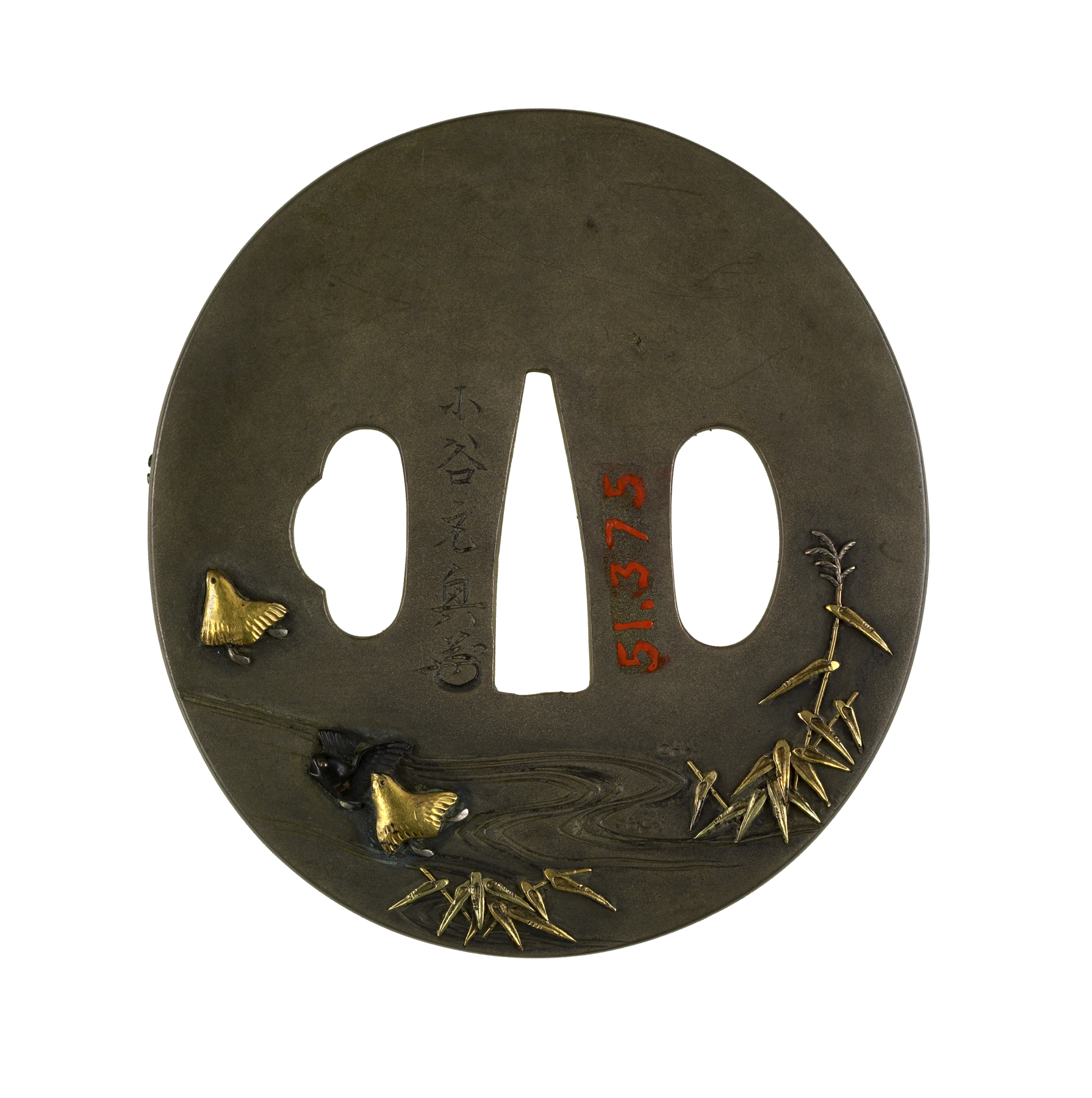 A stream zigzags across the background of this tsuba. At the top, five plovers are depicted in flight. At the bottom are small bamboo plants. On the reverse is a stream with three plovers. Plovers are a seasonal allusion to winter.