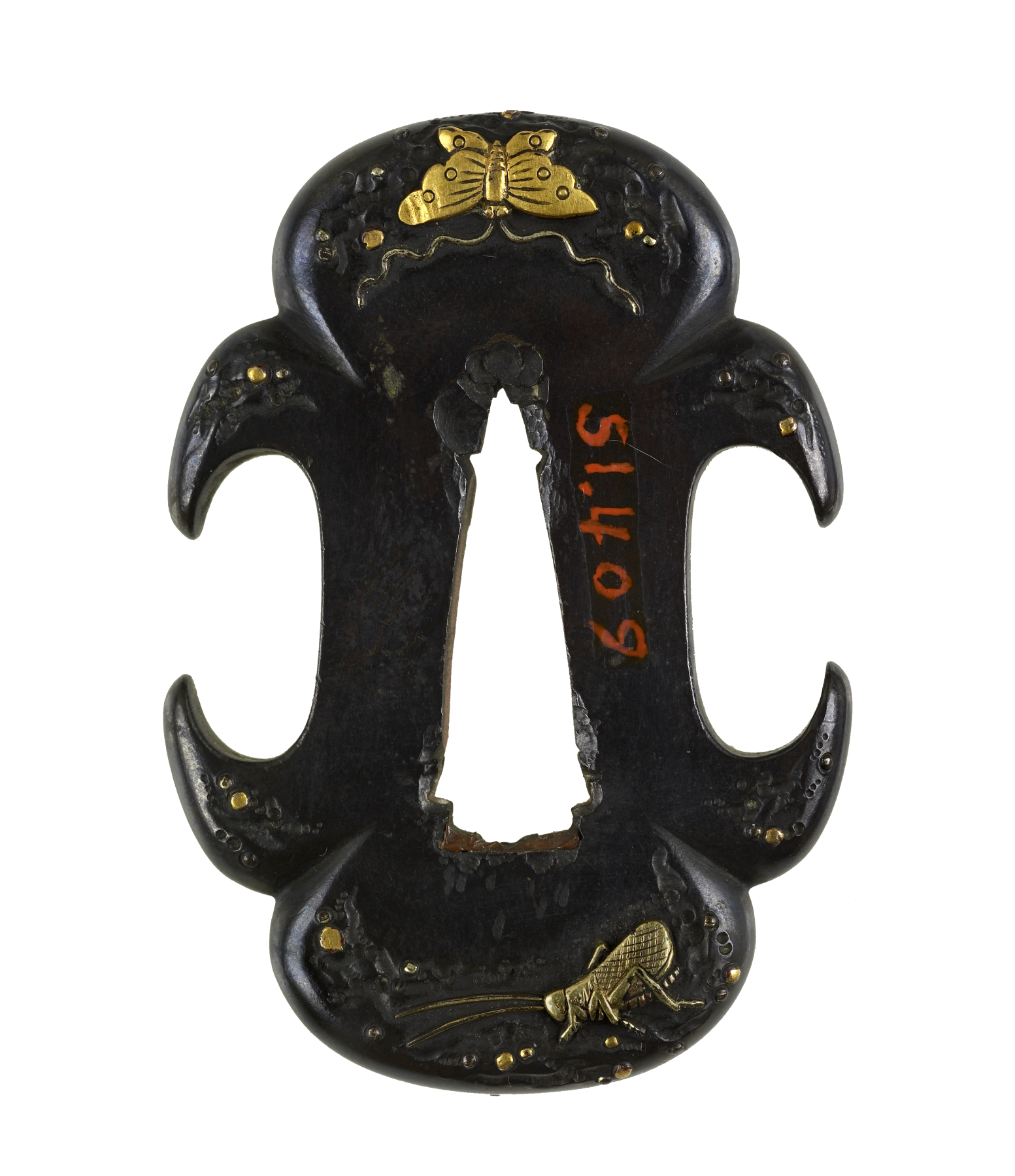 At the top of this tsuba is a moth with its head down towards the central opening. A cricket is at the bottom edge. On the back, a dragonfly is at the top and a fly is at the bottom. The tsuba is so small that the secondary openings for the hair pick and utility knife create a scallop on the edge.