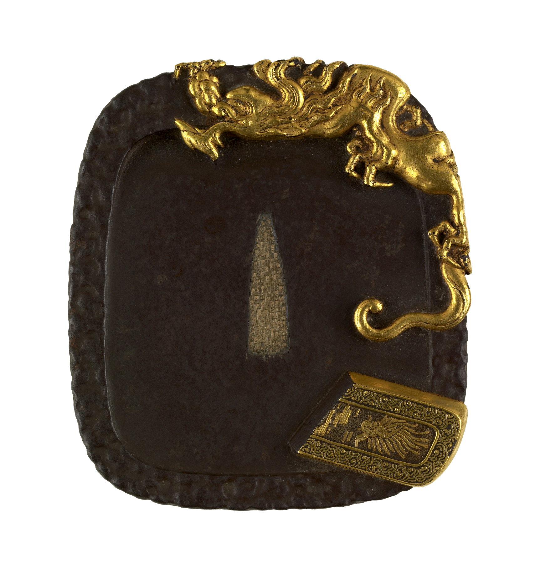 This tsuba has a raised rim that gives it the appearance of an inkstone. The upper right is decorated with a dragon. At the lower right is an inkstick decorated with a phoenix. Rather than purchasing liquid ink ready to use, individuals would make their own ink by grinding an inkstick in an inkstone to which a little water had been added. Only enough of the stone would be ground to create ink for the immediate use. On the reverse of the tsuba are peacock feathers decorated with gold enamel. The central opening for the blade has been plugged. This tsuba appears to be unused.