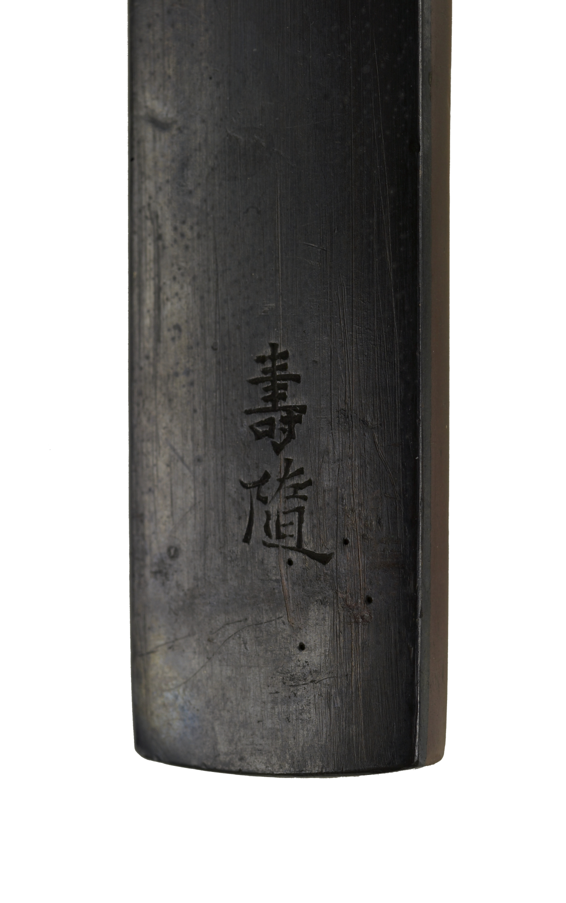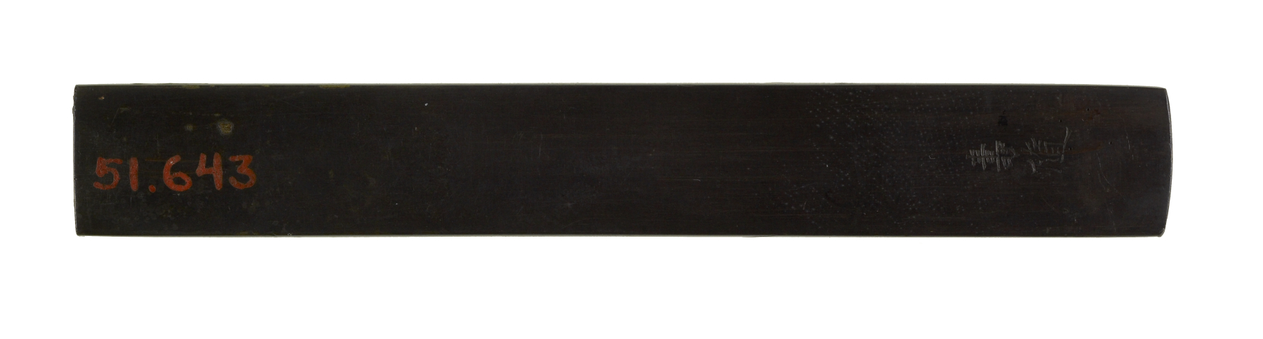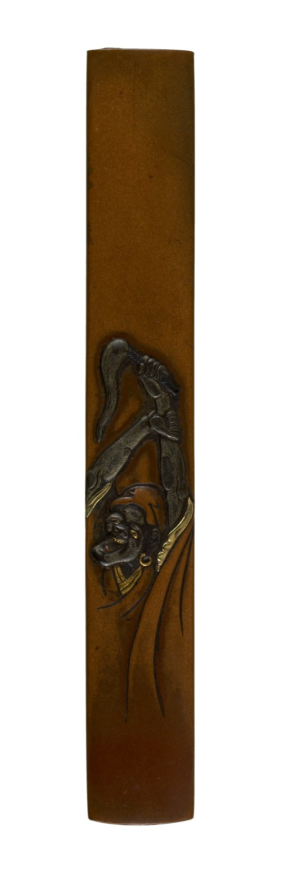 Daruma, the founder of Zen Buddhism, is at the bottom of the kozuka. His arms are raised above his head and he is holding a fly whisk used during meditation. He is either yelling or laughing, with an open mouth. The front of the kozuka is copper and the reverse is shibuichi.