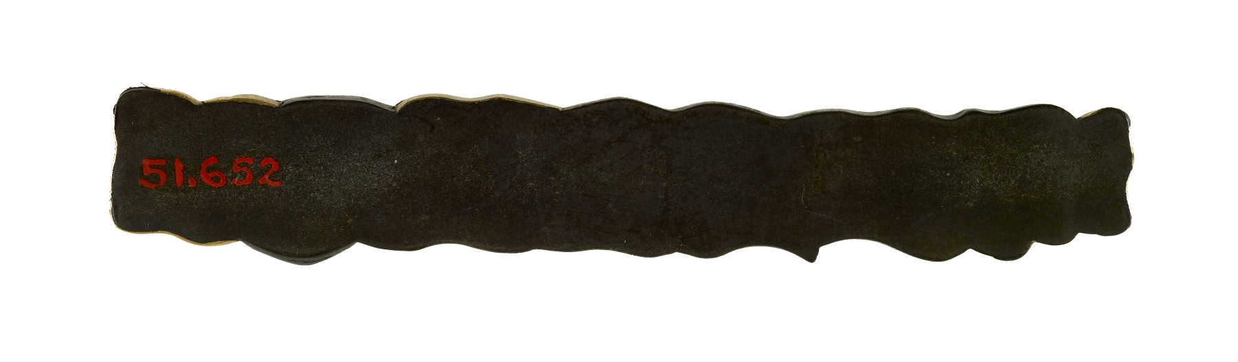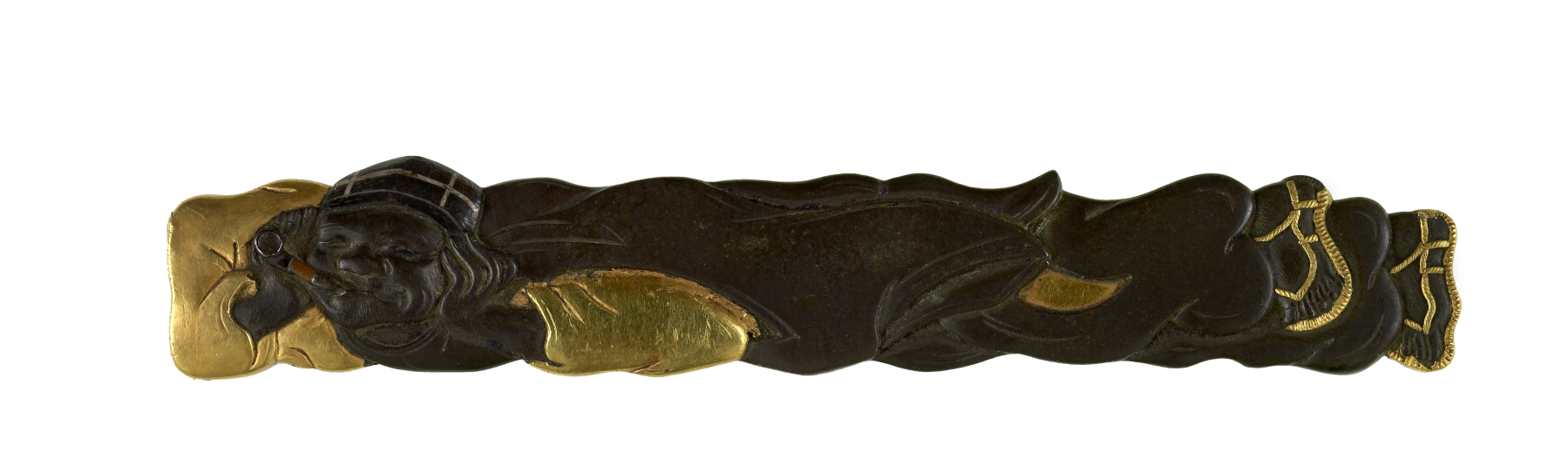 The kozuka is designed in the shape of a man lying on his stomach smoking. His feet are at the top of the handle and his head is near the blade.