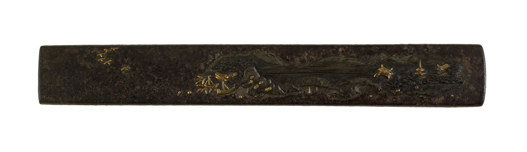 This kozuka depicts a landscape near water. Two bodies of land, on in the middle and one on the right, are connected by a bridge. At the right, the top of a pagoda and other temple buildings can be seen above the tree tops. On the left side of the bridge are huts. There are boats in the water to the left of the huts. In the background, mists shroud distant mountains. At the left of the kozuka, six geese are depicted in flight.