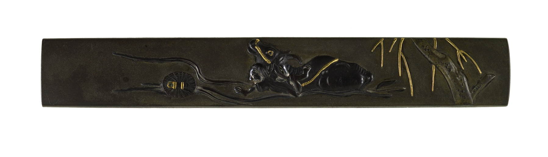 In the middle of kozuka is a ox fording stream. A man holds onto the ox below its neck. The man appears to be trying to reach a hat floating in the water to the left.