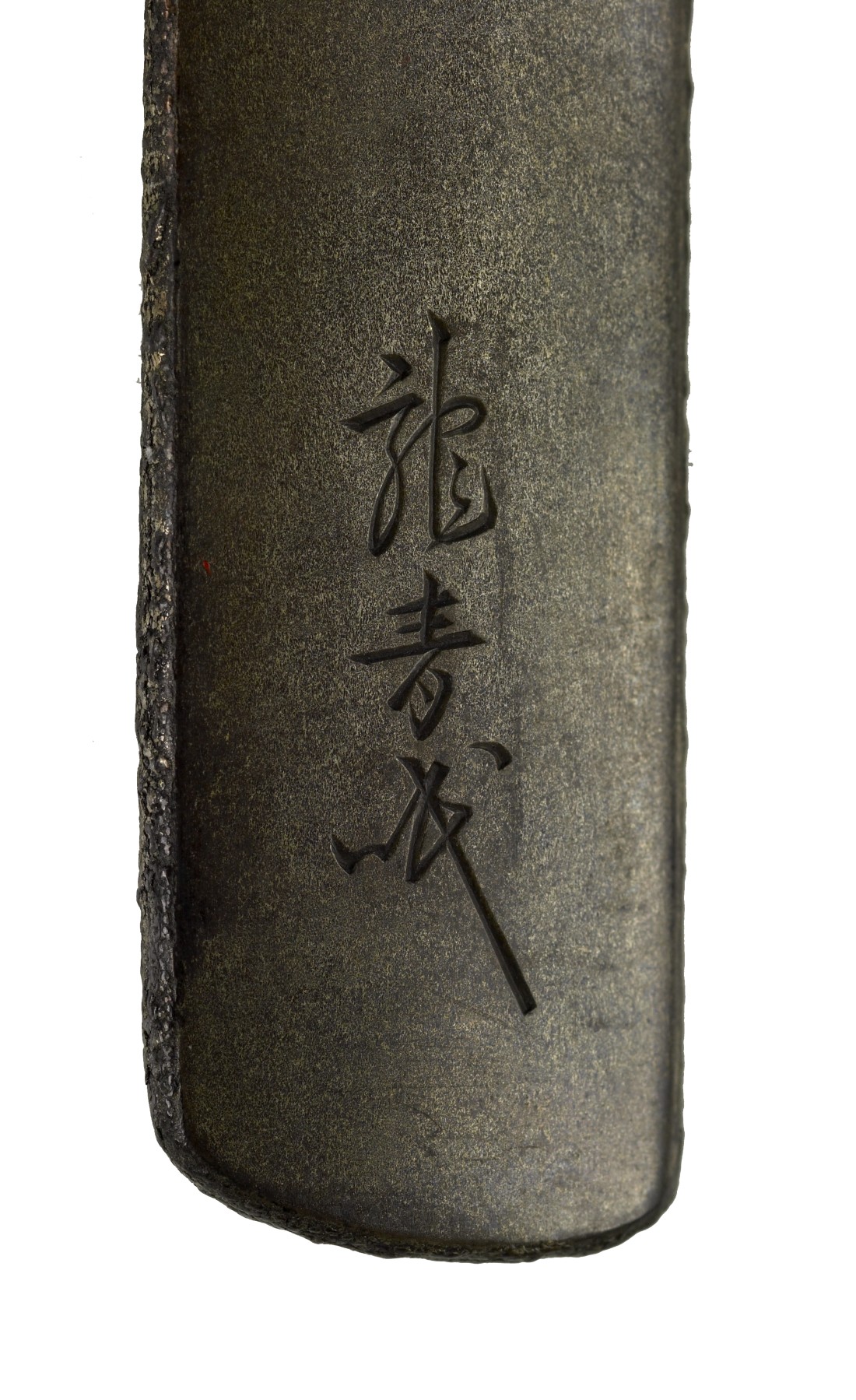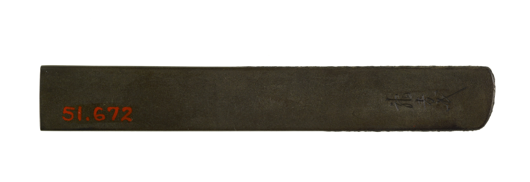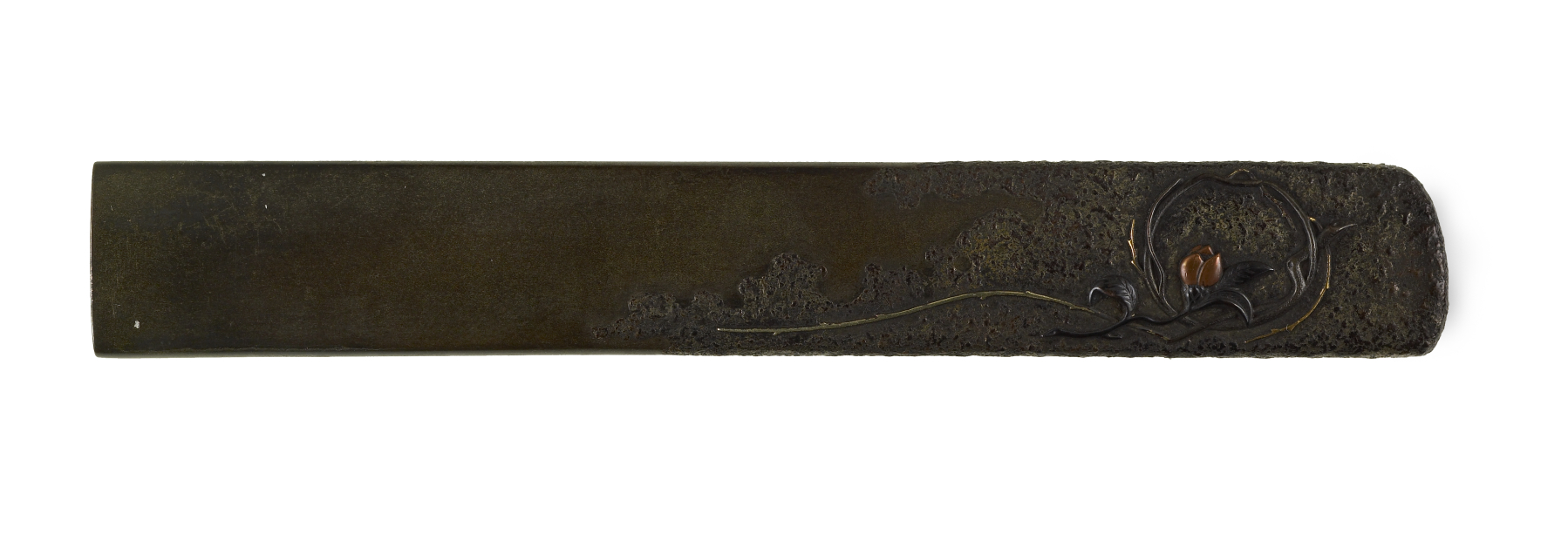 Three plants form the design on the end of the kozuka. A barbed vine in gold runs along the length of the decorated end portion. A coiled stalk at the end has been formed into the shape of a peach. In the middle of the peach is a flower on a stem.