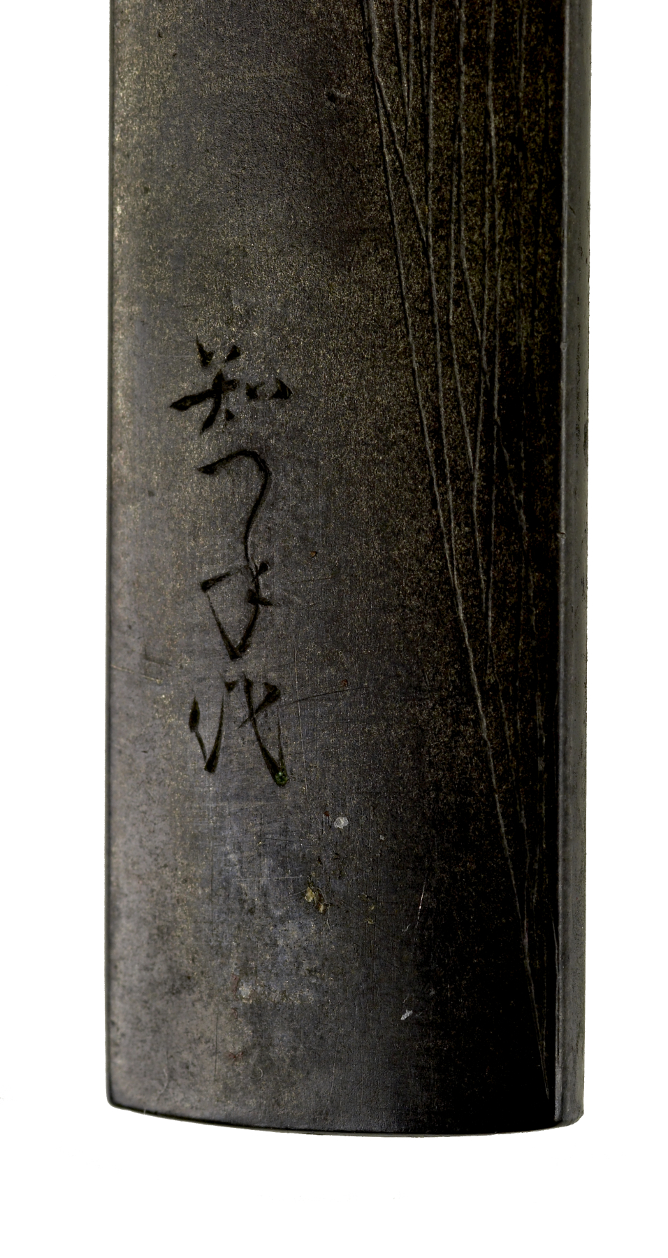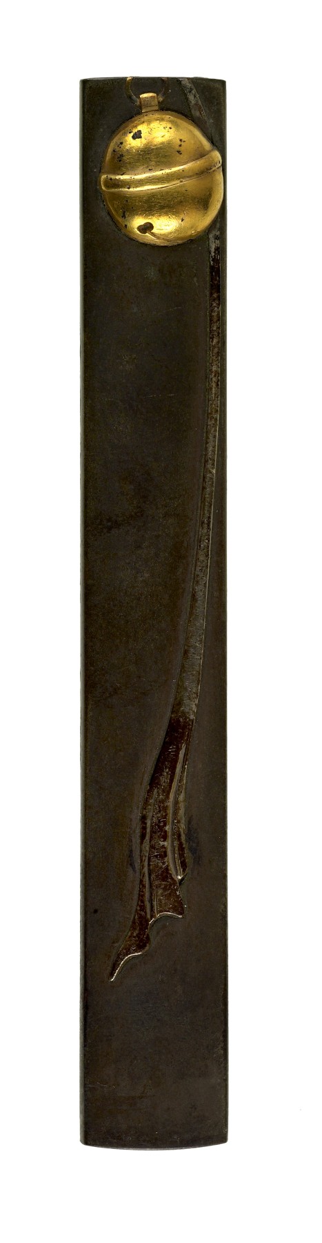 A bell is shown as though it is hanging at the top of the kozuka. A cord hangs down from the bell. Bells such as this are found at Japanese shrines, near the main site. They are rung by pulling on the cord. Visitors ring the bell before praying to the gods. The artist's signature is on the reverse of the kozuka.