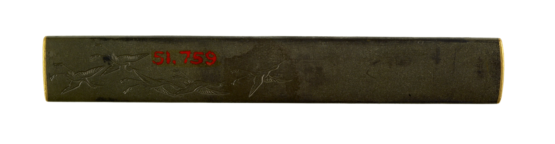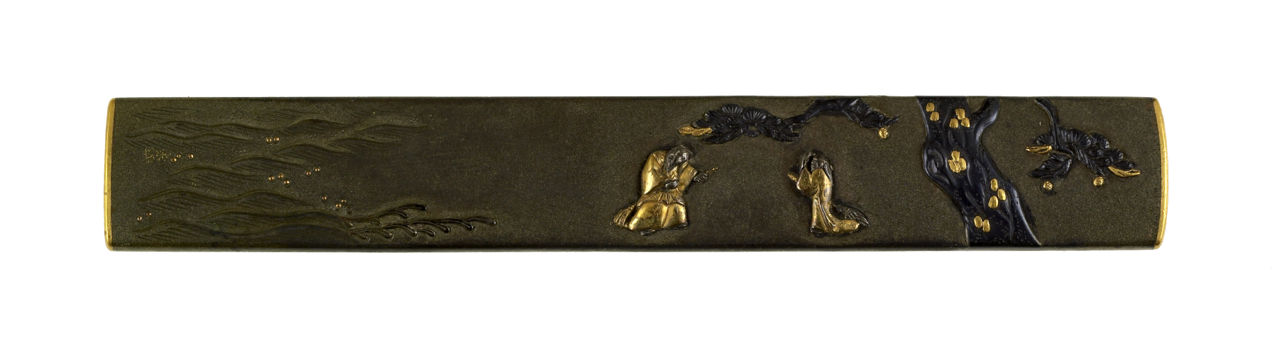 The spirits of the pine trees of Takasago and Sumiyoshi are depicted as an old married couple. They are in the middle of the kozuka, under a pine tree on the right. The ocean shore is on their left. The spirits are the central characters in the noh play "Takasago." On the reverse of the kozuka are five incised cranes in flight. Cranes represent longevity.