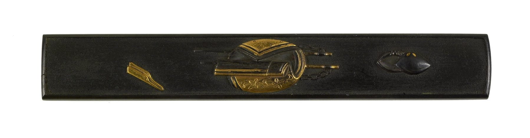 The tools shown on this kozuka could be found in a traditional Japanese household. On the left are sissors used for cutting paper. In the center is a stack of folded Japanese paper. Below the paper are metal tongs used for moving hot pieces of coal. At the right are two clam shells.