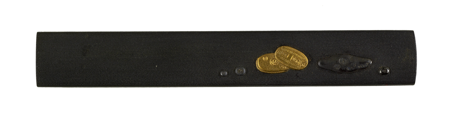 At the right of the kozuka are several gold and silver coins. The two gold coins are "koban." This was the most common coin during the Edo period. The silver coin is a "chôgin." Three other small coins are near them.