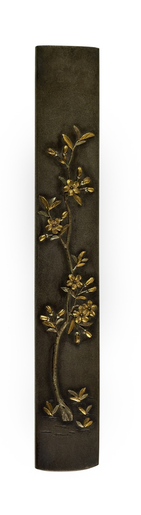 In this vertically oriented composition, a young cherry tree is shown in bloom. Cherry trees bloom briefly at the beginning of spring. The peak of the blossoms is celebrated by picnics and festivals under the cherry trees. The cherry blossom has become a symbol of Japan.