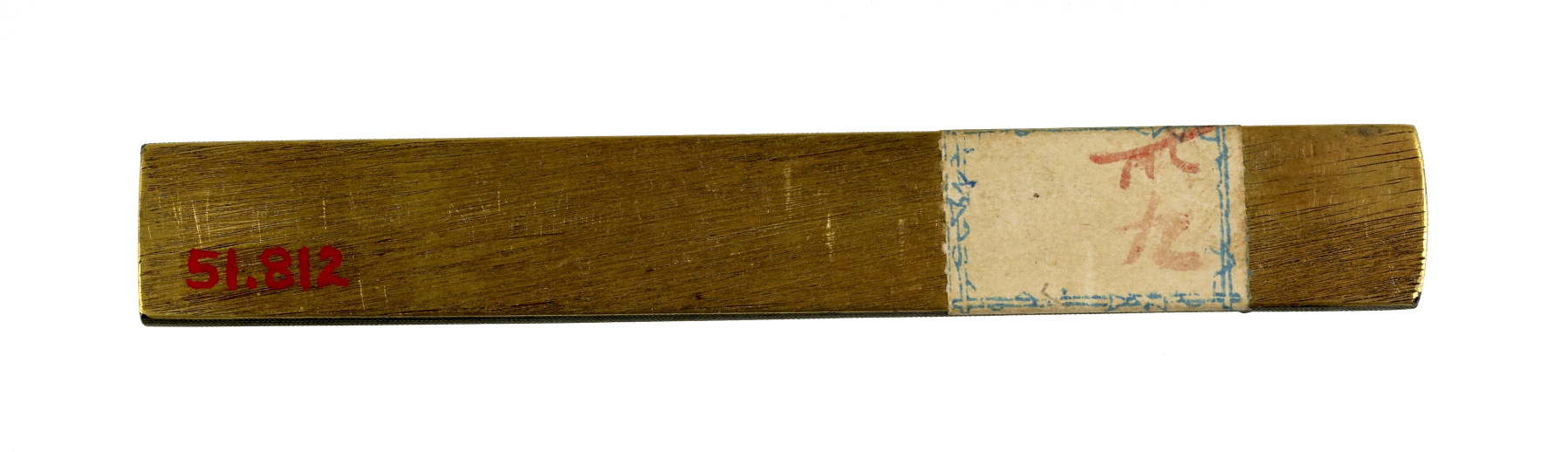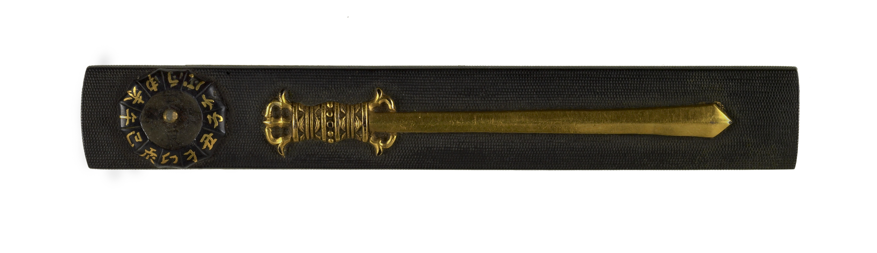 In the center of the kozuka is a ceremonial two bladed sword called a "ken." The handle is a "vajra," which was originally a weapon and ritual object in India. It was incorporated into Buddhist rituals. At the end is a functioning compass. The four central characters indicate the four directions, with north at the bottom. The twelve surrounding characters are the animals of the Chinese zodiac, who were also assigned to directions and times.