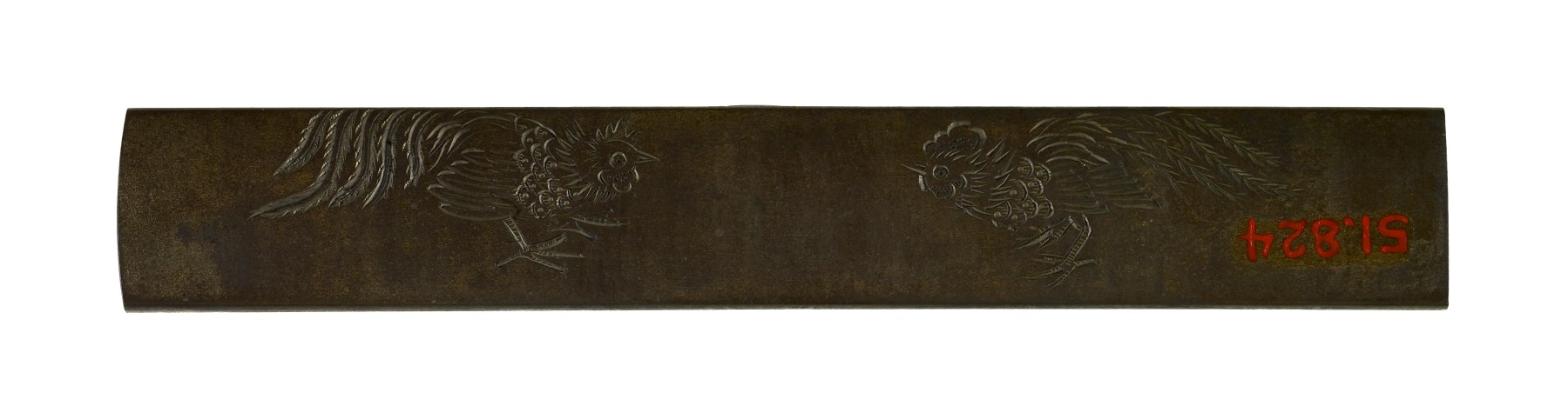 A man is shown standing beneath a flowering branch with a fighting rooster in his arms. The man wears a black hat and an over-garment related to ceremonial dress. On the reverse are two fighting cocks depicted with incised lines. Cock fighting had a period of popularity during the 17th century.