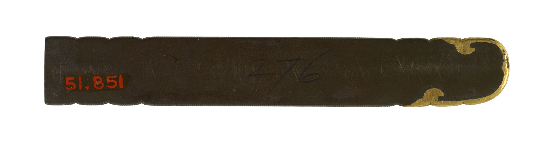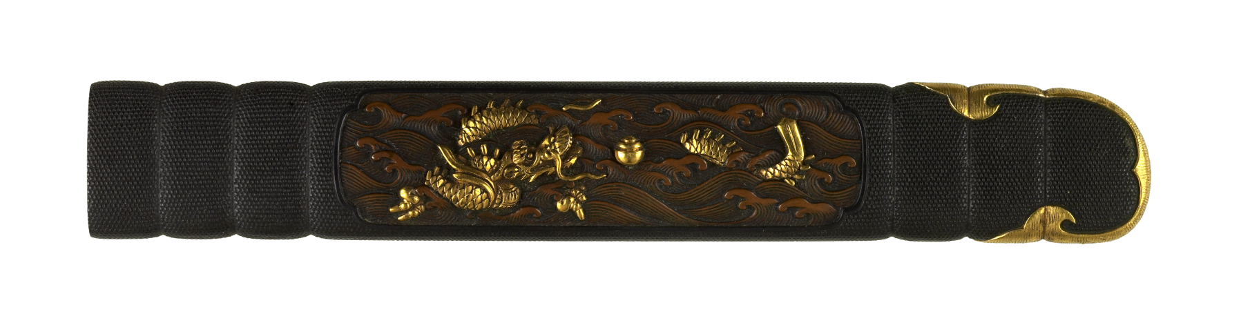In the central cartouche of the kozuka, a dragon is depicted surrounded by waves. In the middle of the waves is a jewel. Dragons are often depicted with jewels, which are taken from Buddhist belief and also related to the two tide ruling jewels controlled by the Dragon King of the sea. On either side of the cartouche, the kozuka is divided into a further three segments. The bottom end is rounded with gold detailing.