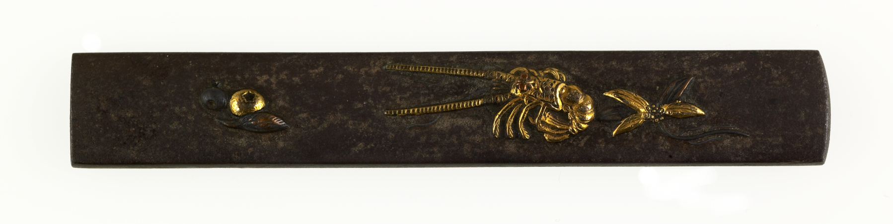 A spiny lobster is depicted flanked by fruit and a flower. Spiny lobsters were signs of longevity because their back is bent like that of an old person.