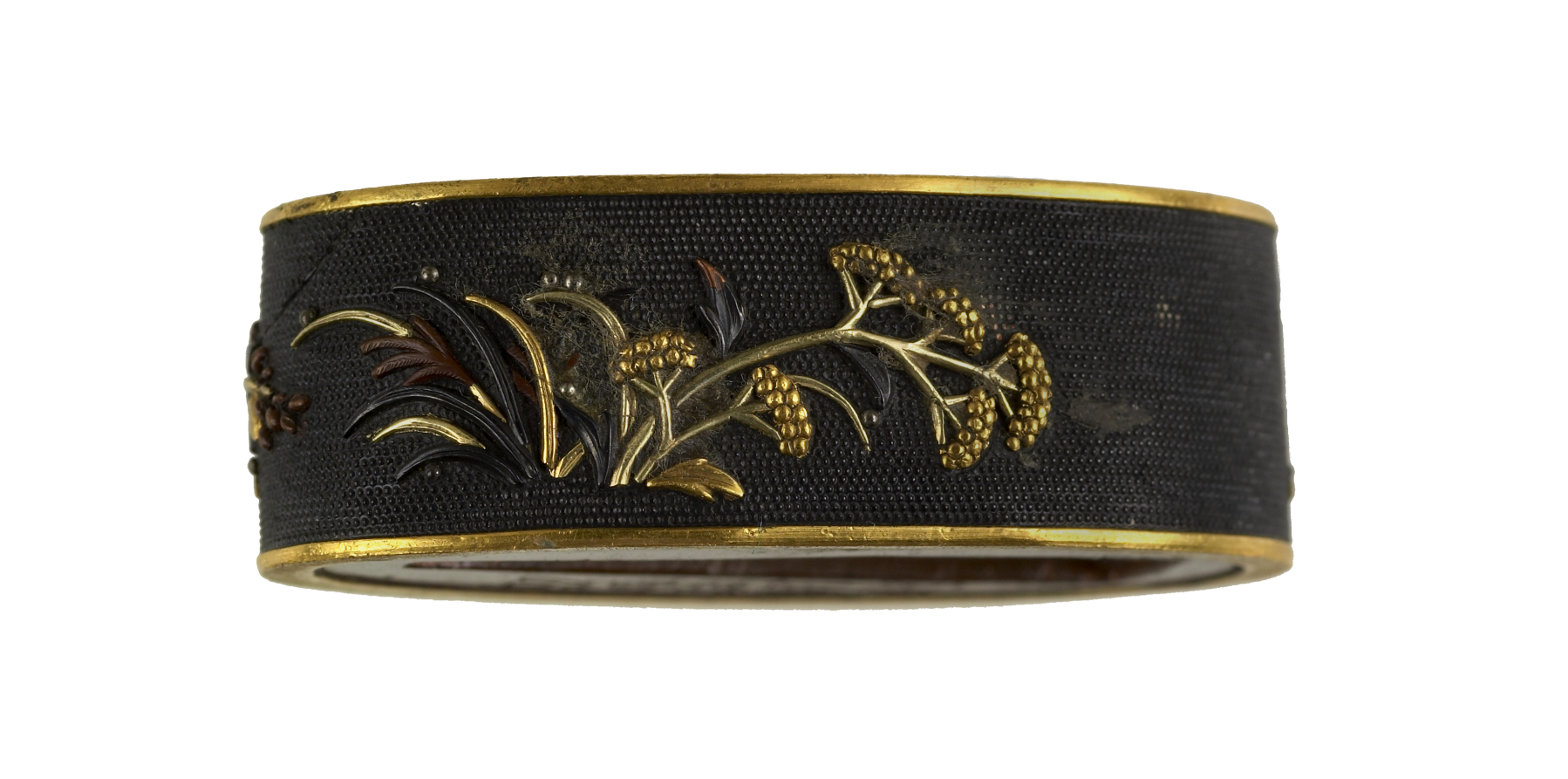 Two monkeys are depicted in gold and copper. The lower monkey wears a vest. The upper monkey is holding a peach. Peaches are a symbol of immortality. Monkeys are often anthropomorphized in Japanese art. This kashira is part of a set with Walters 51.916.