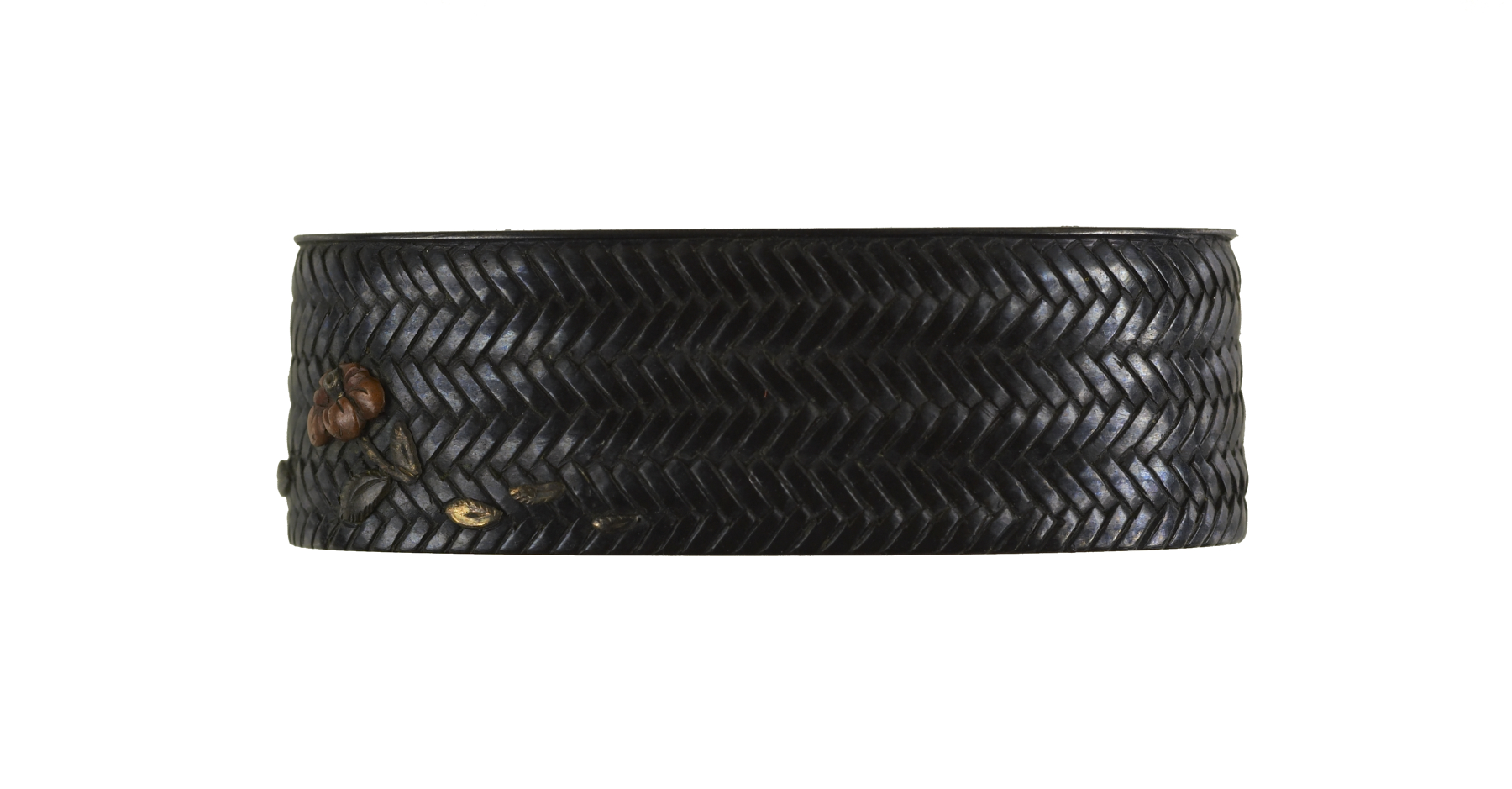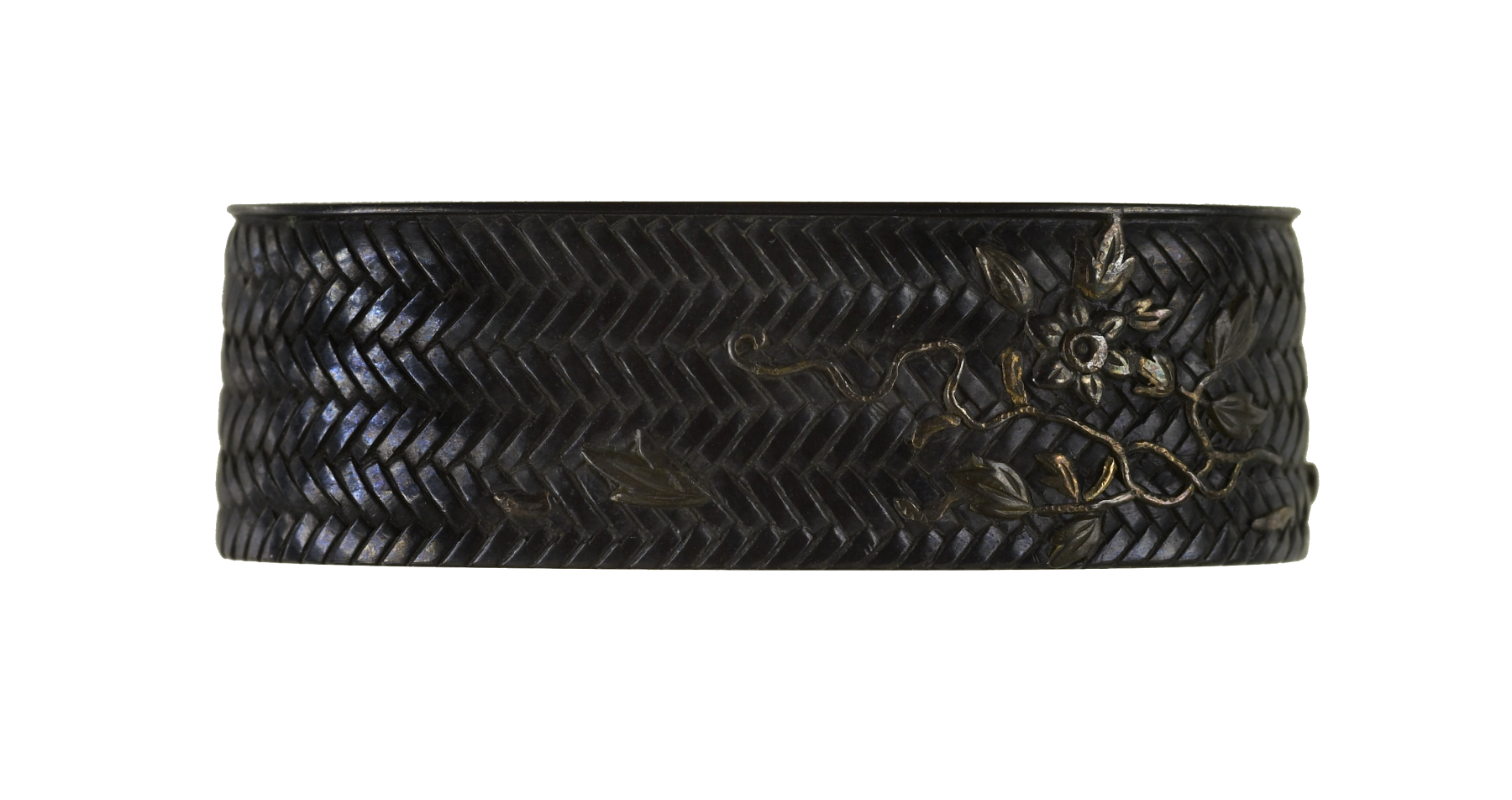 The background is carved in a basket weave pattern. It is decorated with flowering clematis vines. A red flower made of copper is on the reverse. This is part of a set with Walters 51.965.