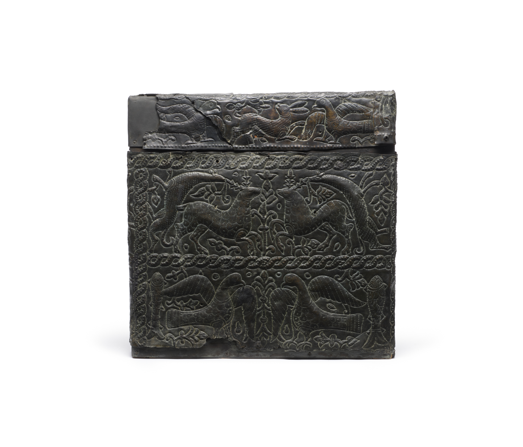 Humans, animals, plants, and decorative patterns cover these metal sheets, or cladding, which decorated a box or chest. Deer, rabbits, doves, peacocks, and fish contend with four-legged predators, perhaps representing dogs or lions. Two warriors on horseback are each being attacked by a long-tailed predator. At the center of the front of the chest, under an archway, a couple is shown in an intimate embrace. These reliefs likely decorated a chest that was made for a woman who was about to be married. The sheets are mounted on a modern frame to recreate the form of the chest.