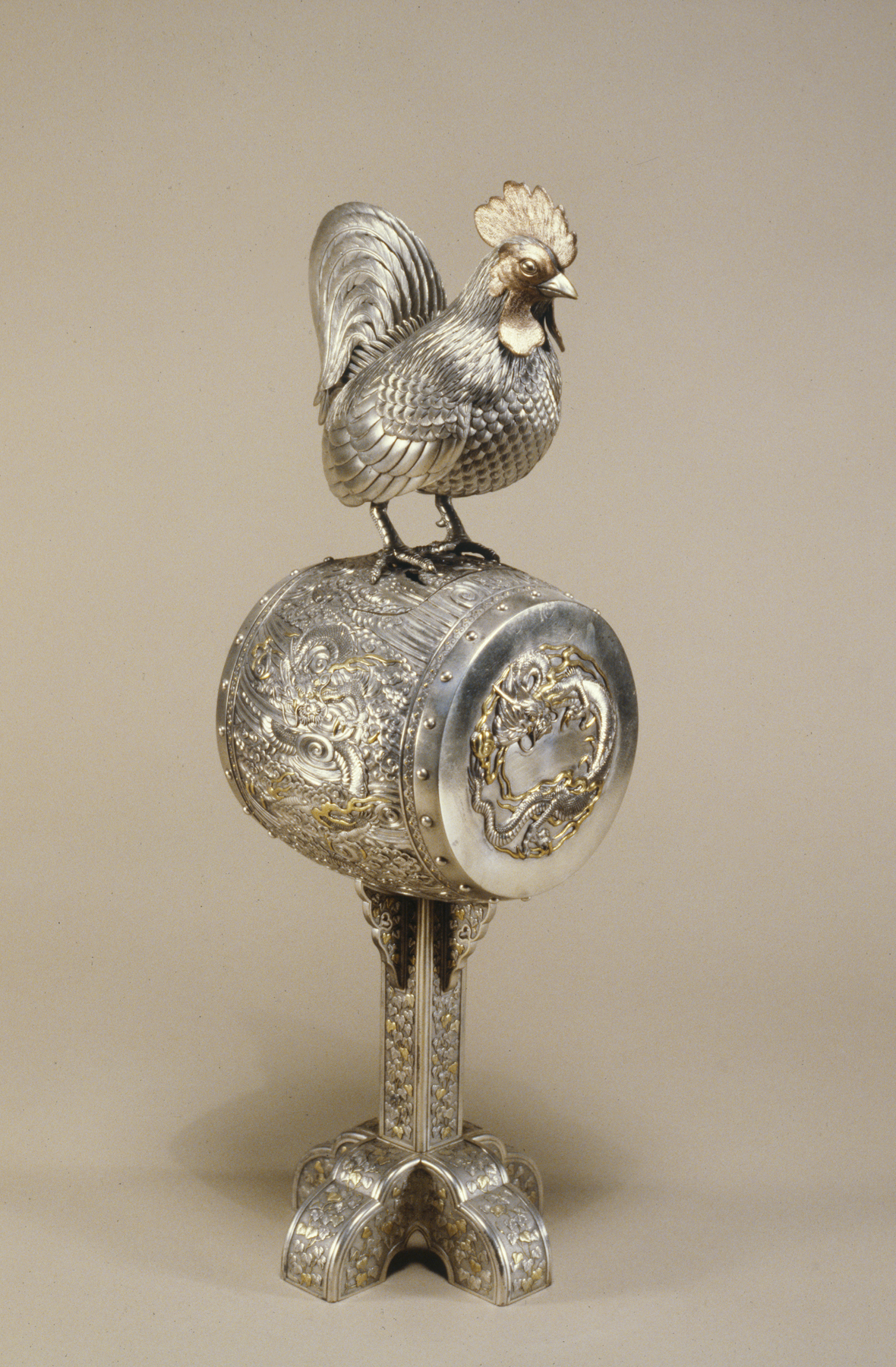 Decorated in relief on both sides and each end with a three-clawed dragon, partially in gold. Four-footed pedestal decorated with vine leaves applied partially in gold. Cock has gold beak. Legs detachable from body.