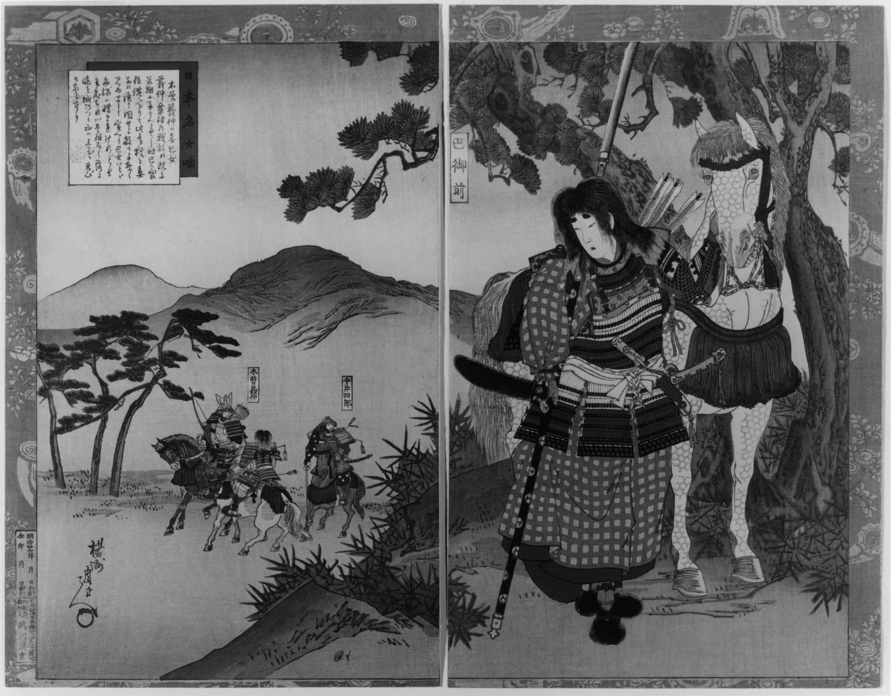 Following a disastrous battle at Uji River, the beautiful Tomoe Gozen, right, is among the handful of survivors of the Genji army, led by her lover Yoshinaka. But Yoshinaka (far left) will not allow Tomoe to continue to fight. "How ashamed I would be," he tells her, "if people said that Yoshinaka was accompanied by a woman in his last fight." Next to him is his foster brother Imai no Shiro Kanehira.