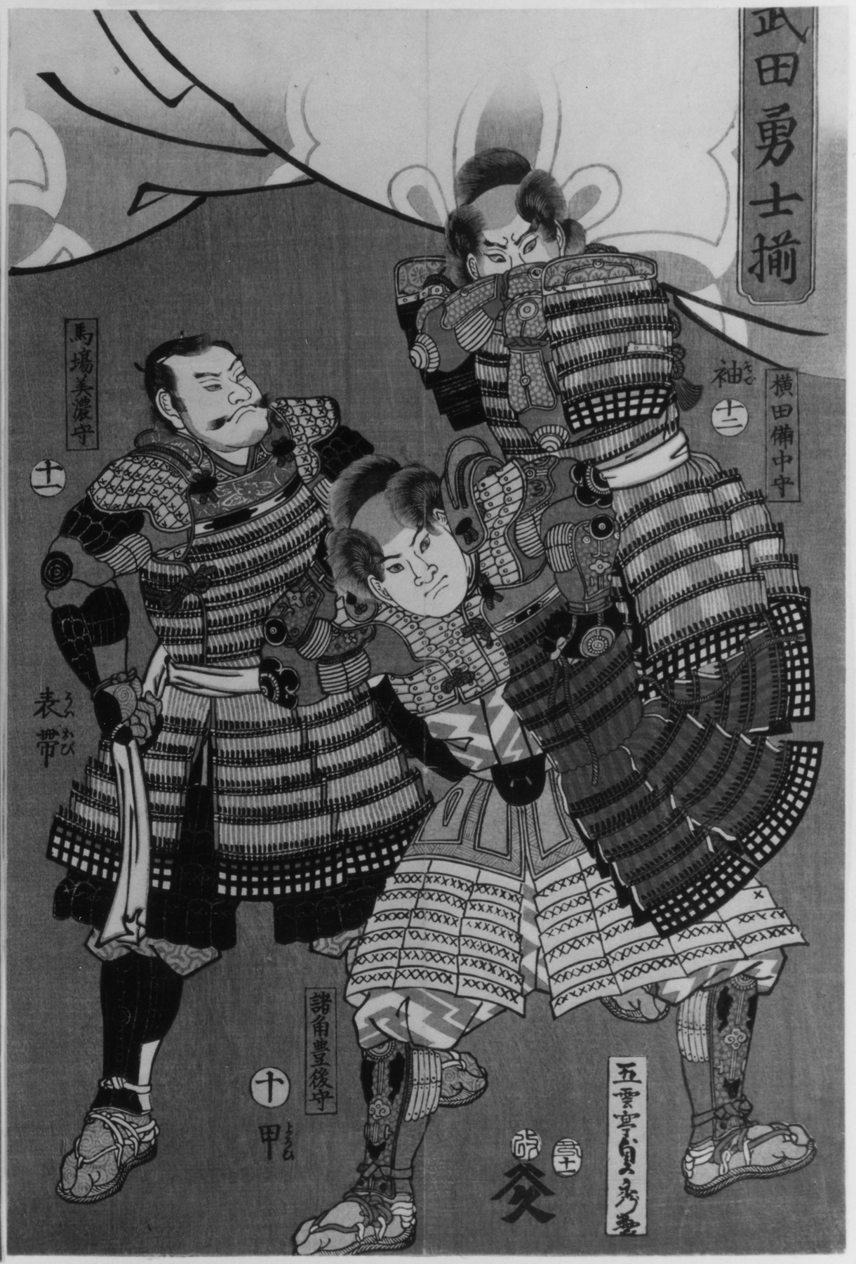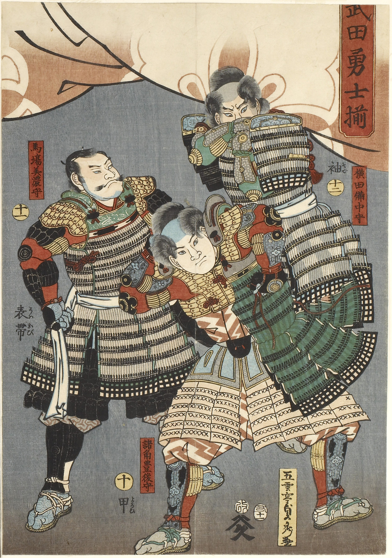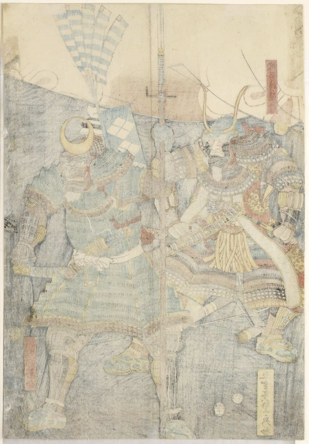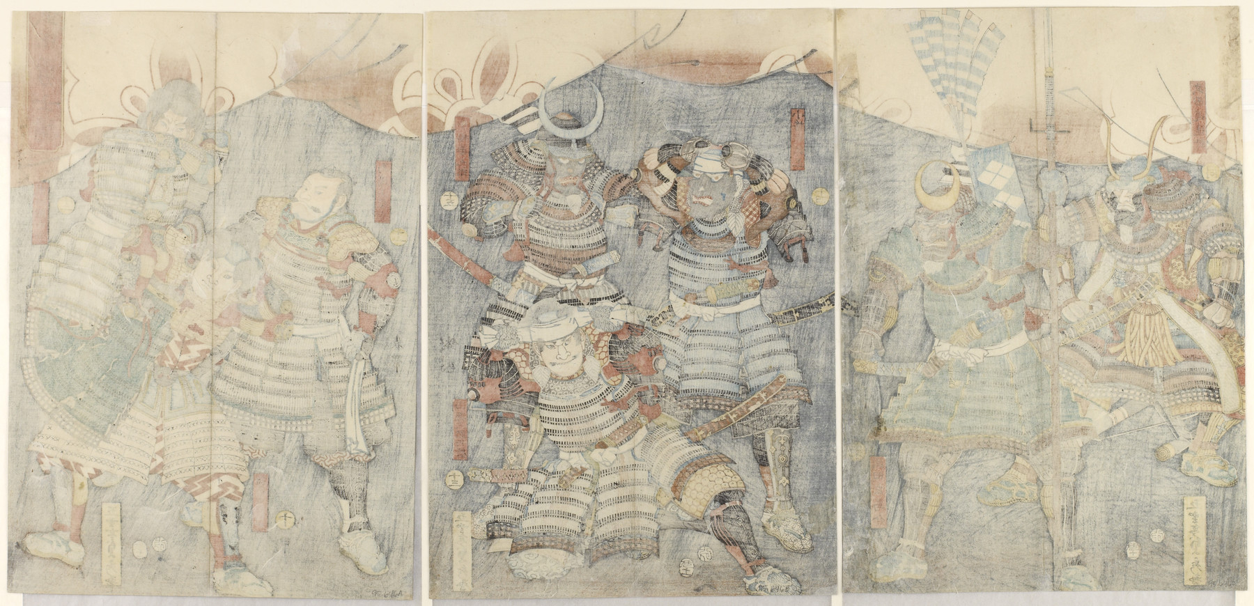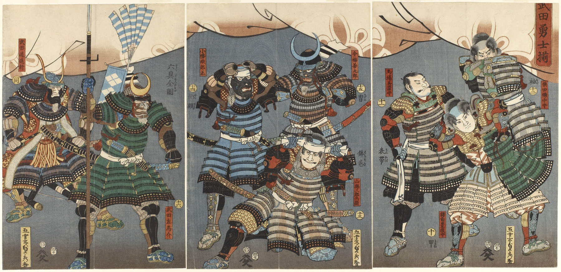 This triptych and its pair, Walters 95.645, illustrate how a 16th-century warrior suited-up before going into battle. The prints are meant to be viewed from right to left- starting with the under-robe at the far right of the group. Beside each warrior is a number (in a yellow circle), his name (in a red cartouche), and the name of the item he is putting on. These warriors were all retainers of the Takeda warlord during the ten-year battle at Kawanakashima (1553-1563). The most famous was Yama-moto Kansuke, known as the "one-eyed general" (no. 6).