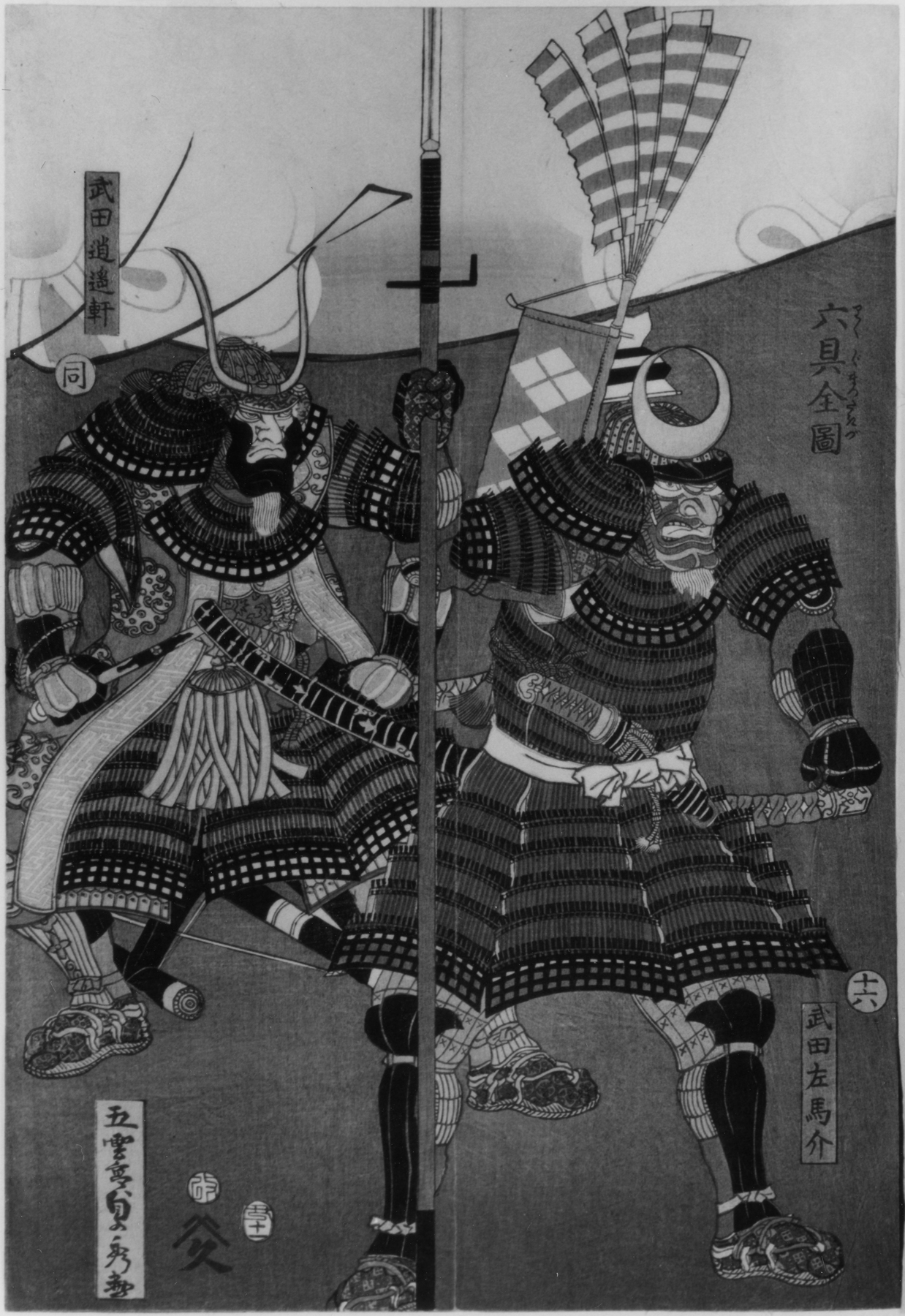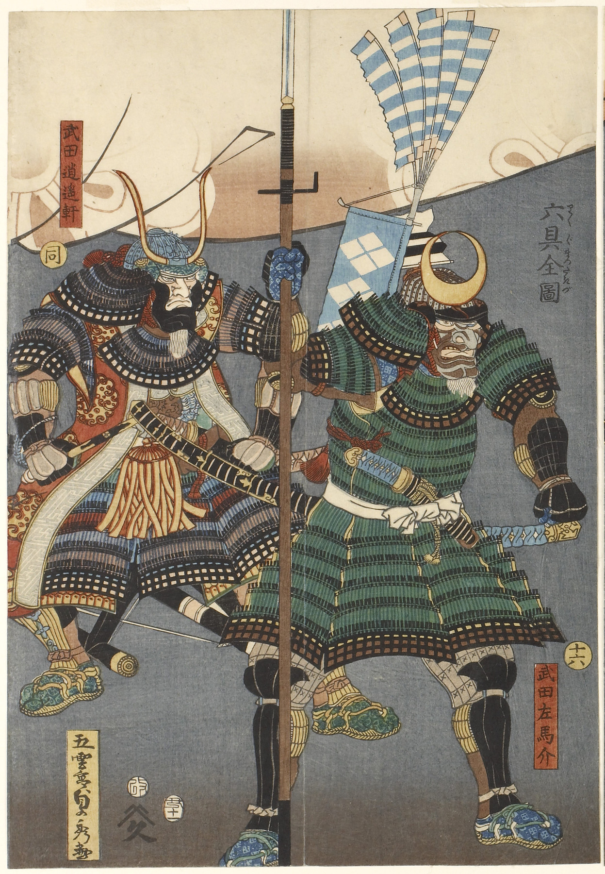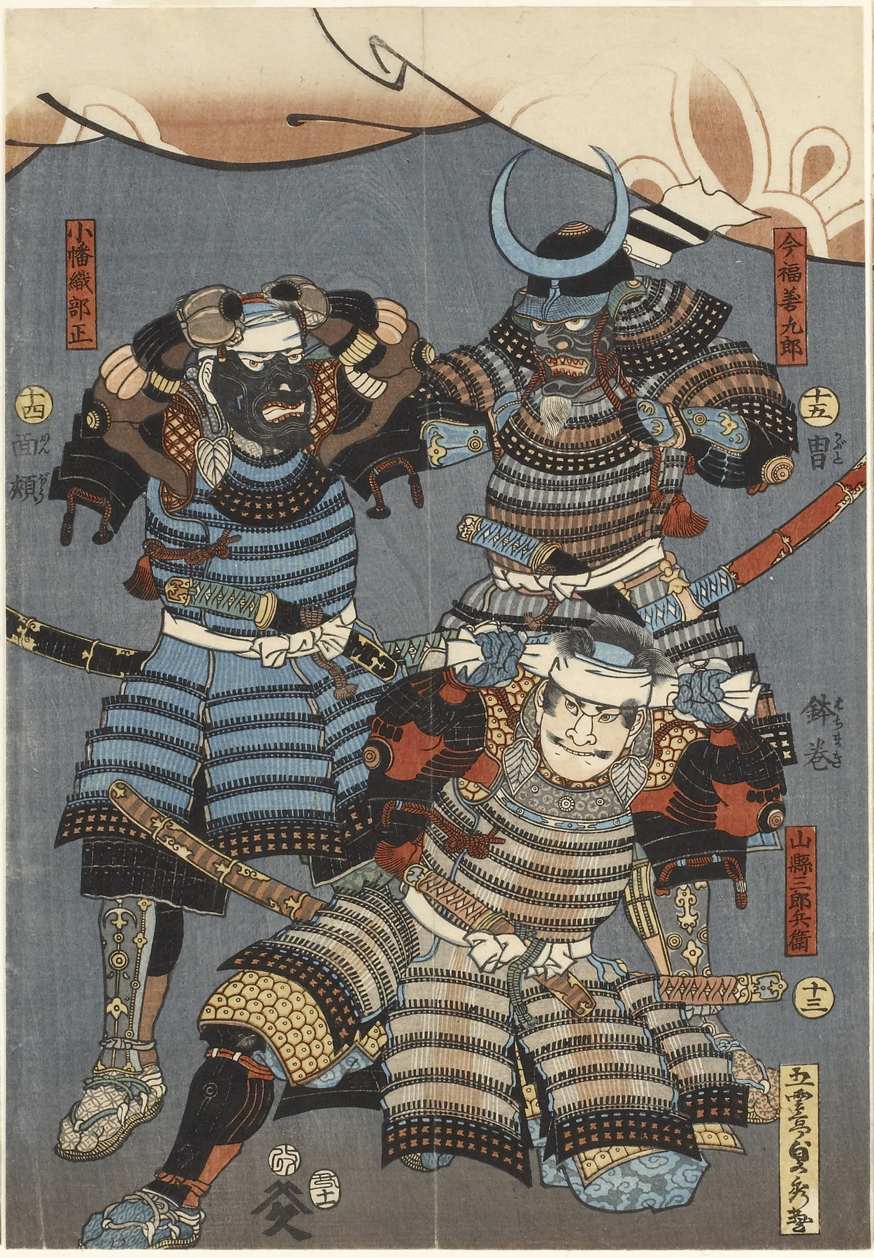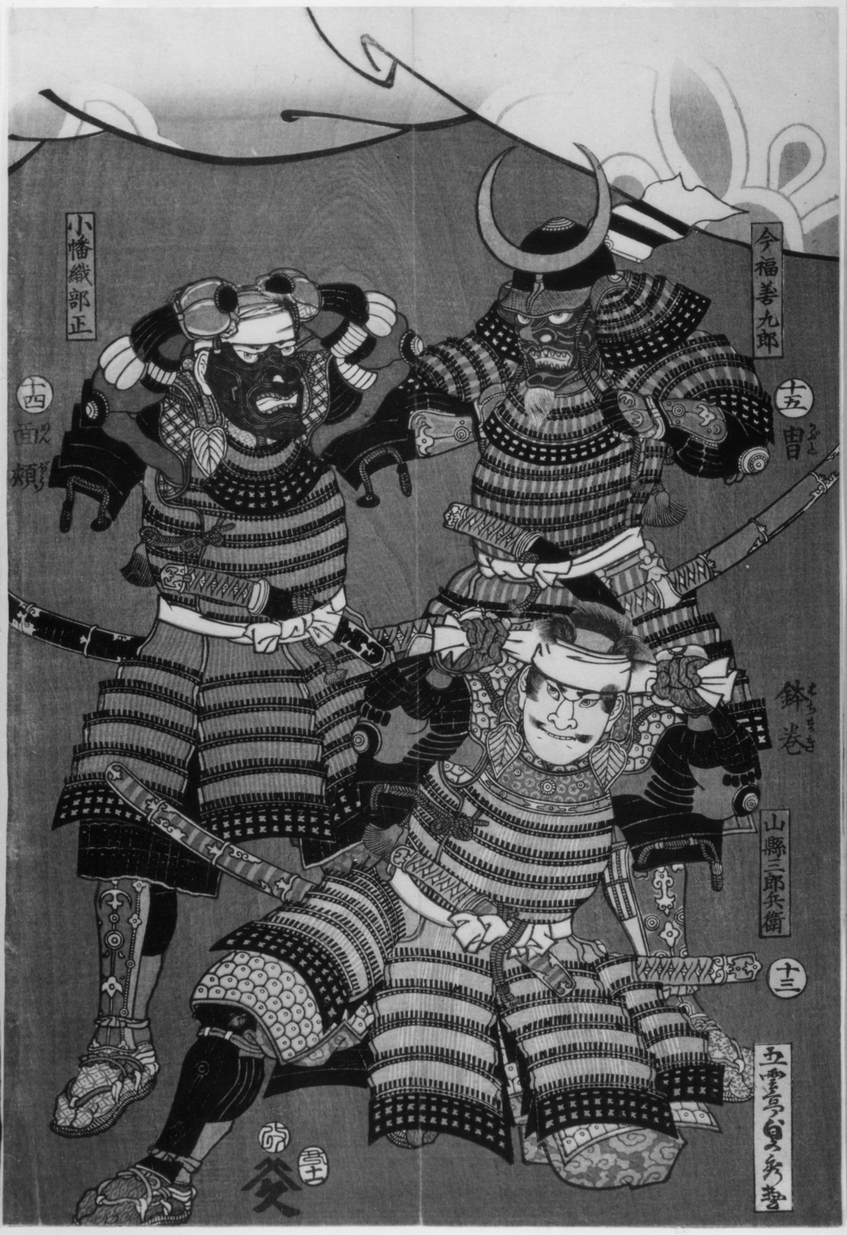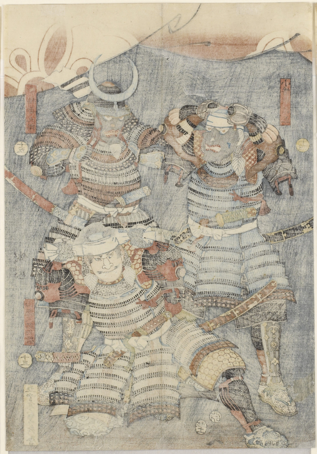 This triptych and its pair, Walters 95.645, illustrate how a 16th-century warrior suited-up before going into battle. The prints are meant to be viewed from right to left- starting with the under-robe at the far right of the group. Beside each warrior is a number (in a yellow circle), his name (in a red cartouche), and the name of the item he is putting on. These warriors were all retainers of the Takeda warlord during the ten-year battle at Kawanakashima (1553-1563). The most famous was Yama-moto Kansuke, known as the "one-eyed general" (no. 6).