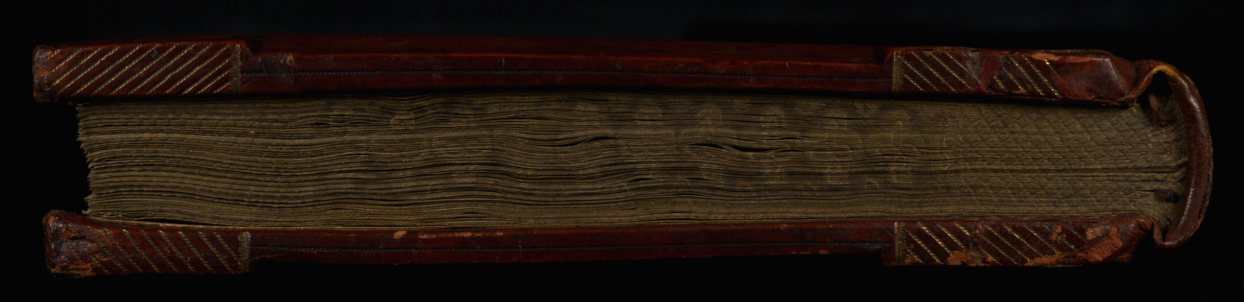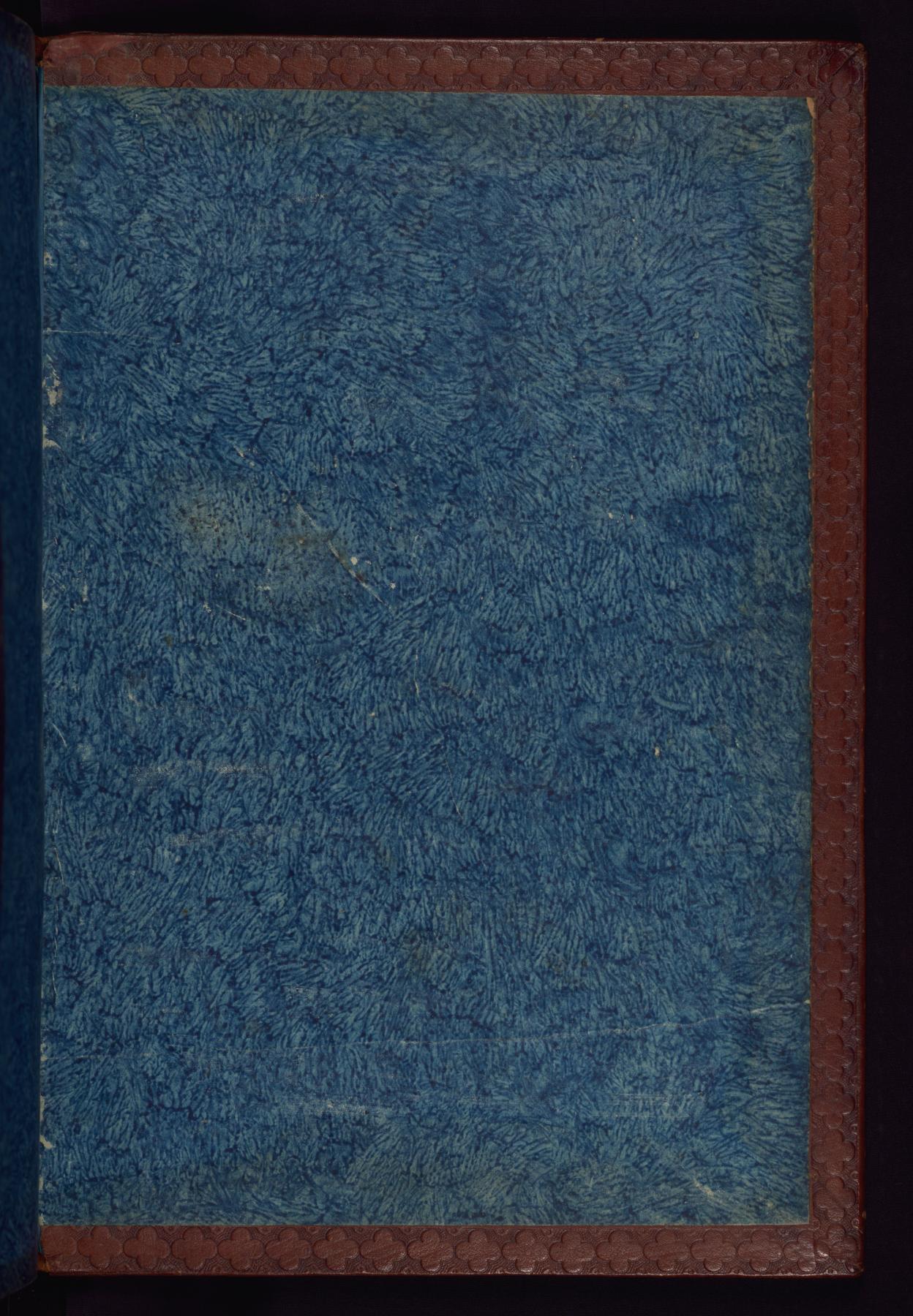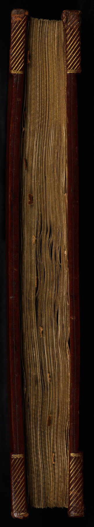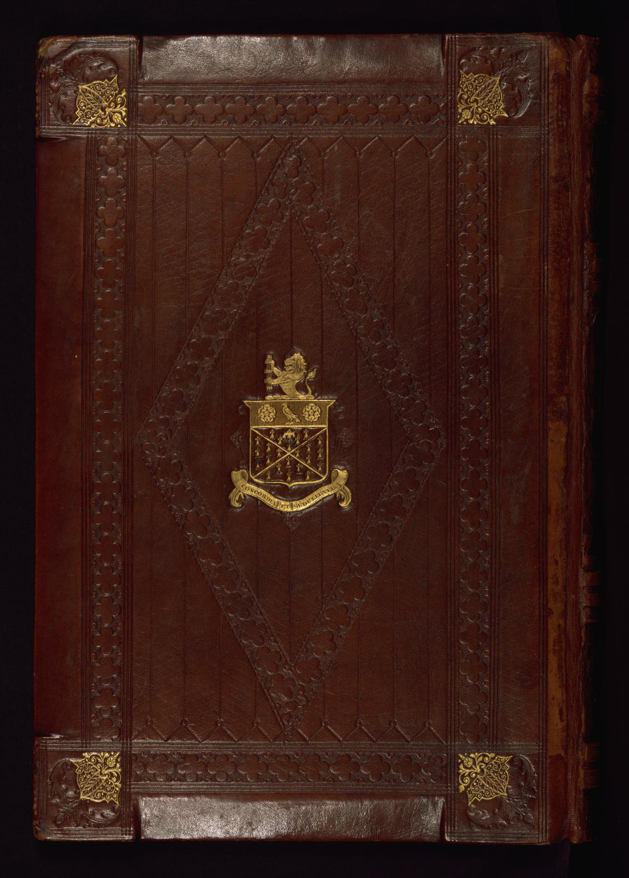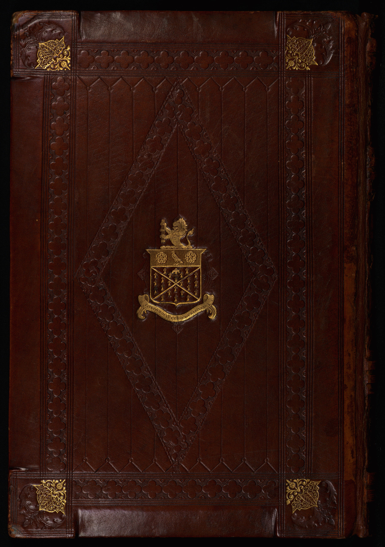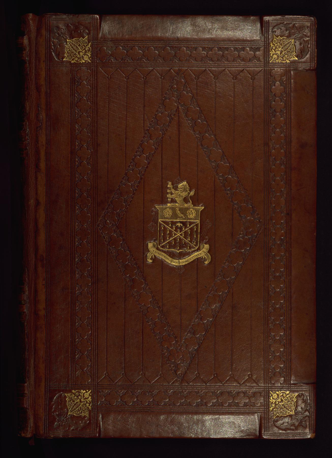 brown calf leather with later-blocked John Louis Goldsmid arms over millboard, by Faulkner ca. 1815, rebacked; twentieth-century blue marbled paper pastedowns and brown ribbon